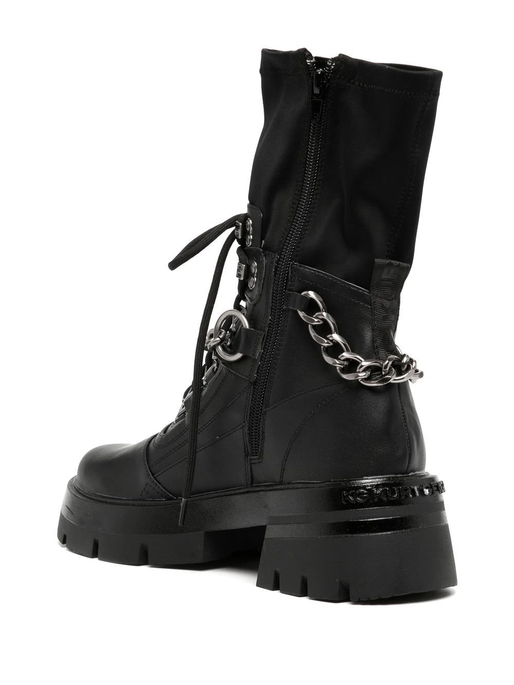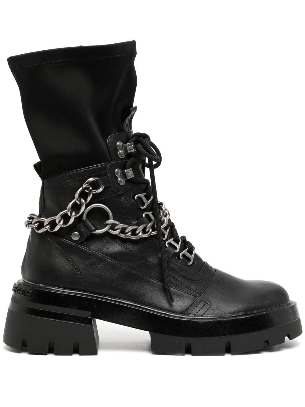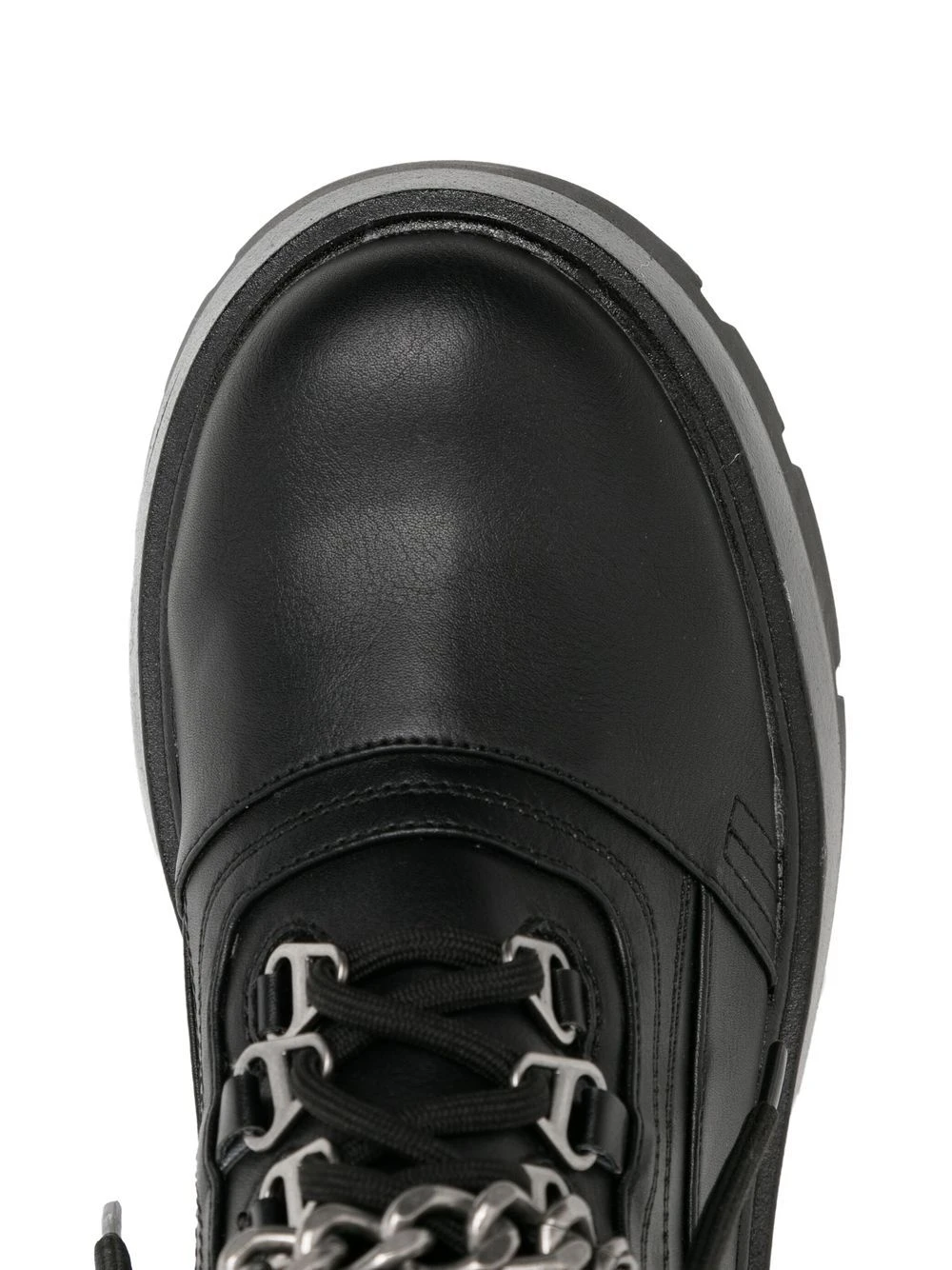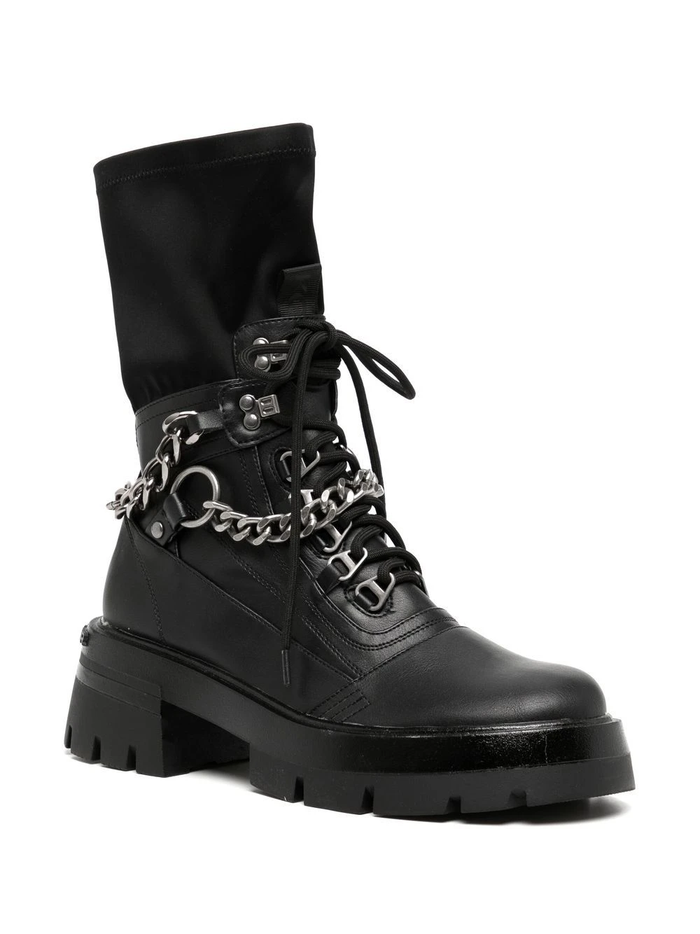 Noir, cuir de veau, détails de chaînes, logo embossé au dos, finition à bande logo, finitions en métal argenté, cheville style chaussette, fermeture zippée sur le côté, fermeture à lacer sur le devant, bout rond, semelle crantée en caoutchouc.