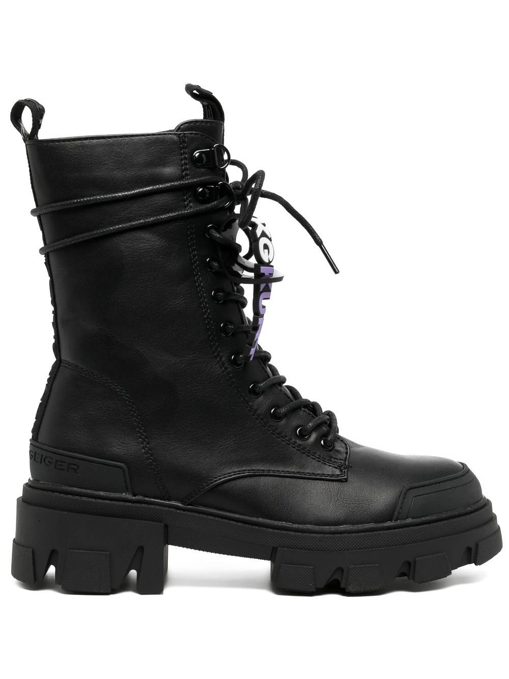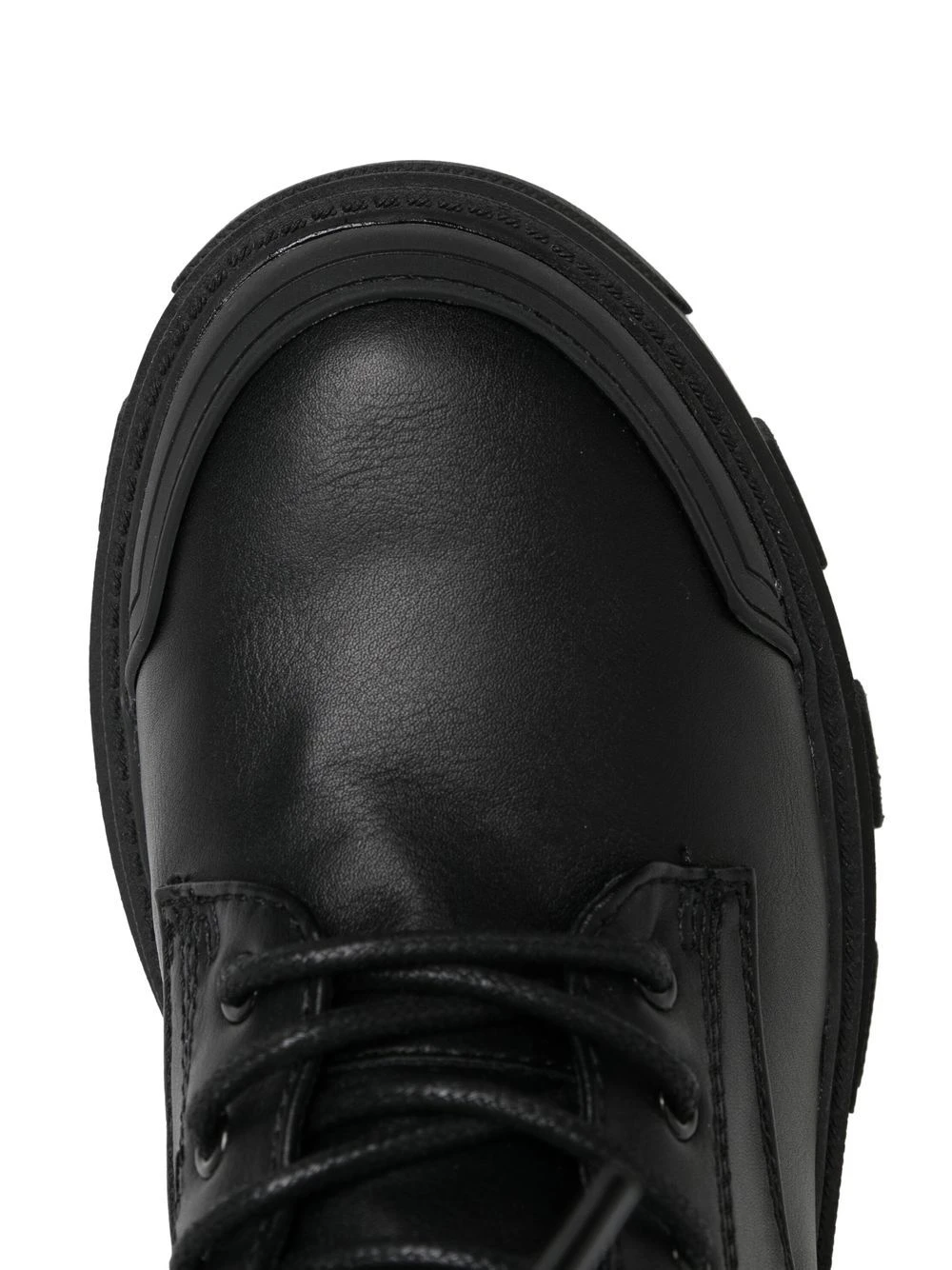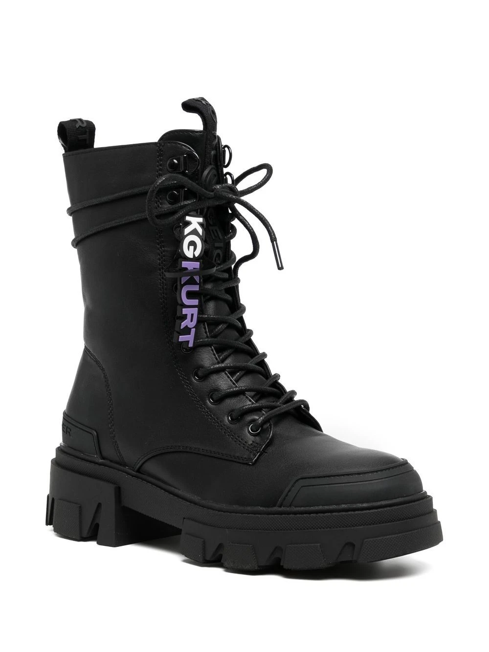 Noir, cuir de veau, étiquette logo, ouverture à double languette, finition à bande logo, contrefort à logo, fermeture à lacer sur le devant, fermeture zippée sur le côté, bout rond, semelle crantée en caoutchouc.