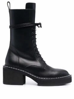 Coutures contrastantes, bout en amande, longueur mollet, fermeture Ă lacer sur le devant, fermeture zippĂ©e sur les cĂ´tĂ©s, languette d’enfilage au talon, semelle intermĂ©diaire EVA, semelle Ă©paisse en caoutchouc. Couleur : noir. Matière : cuir.