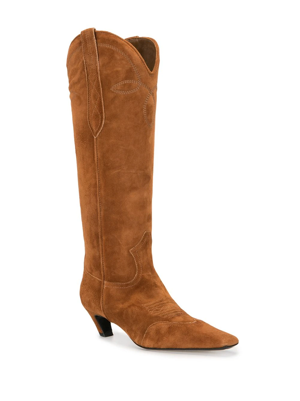 Bout carré, design à empiècements, ouverture à double languette, coutures ton sur ton, talon mi-haut sculpté. Matière : cuir.