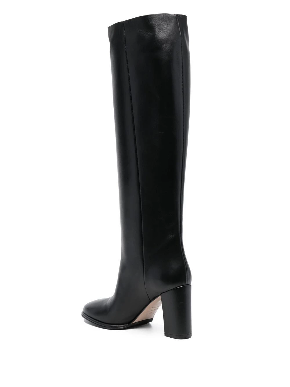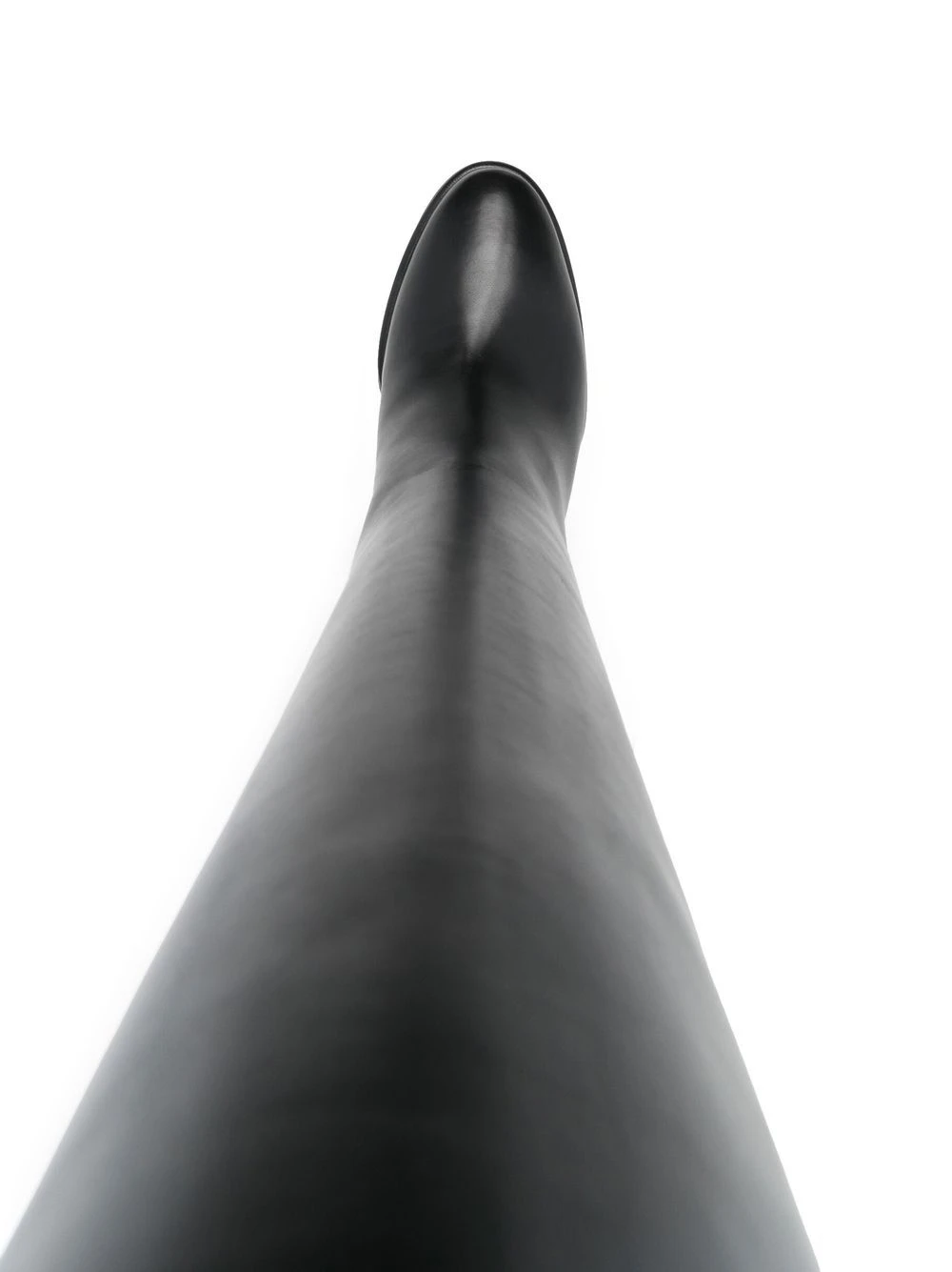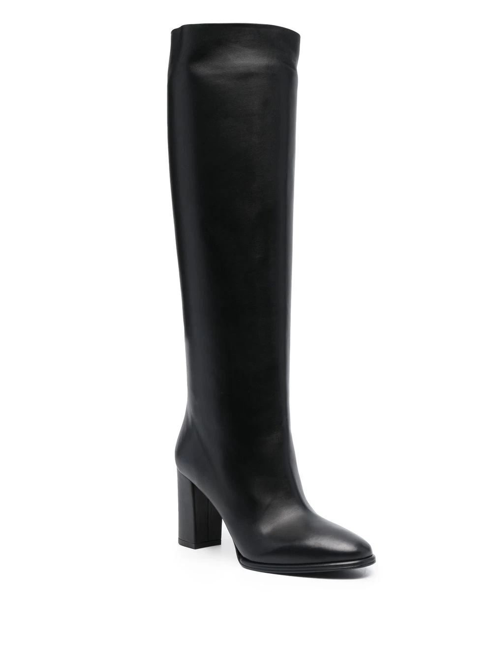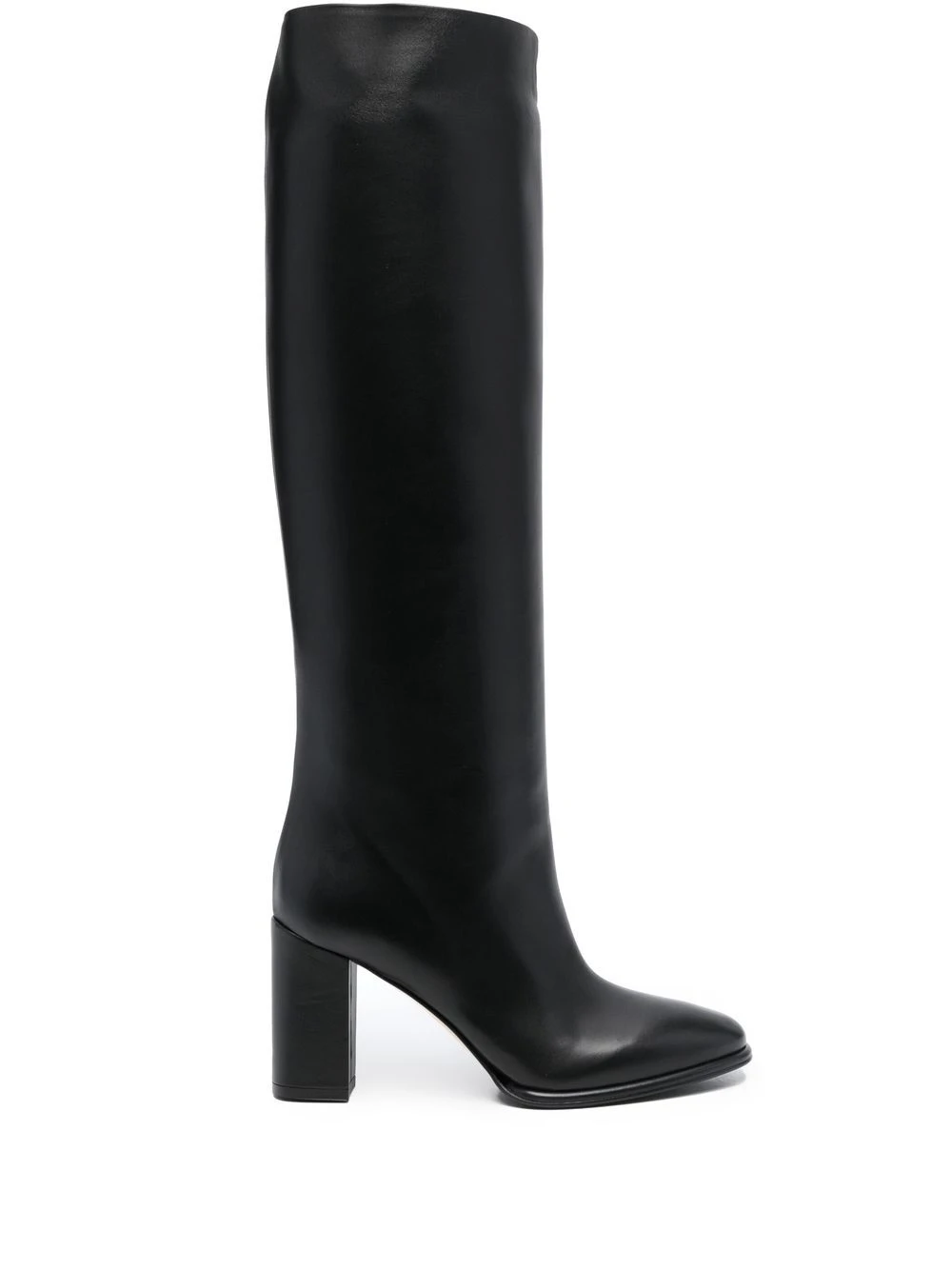 Noir, cuir nappa, peau de chèvre, cuir de veau, talon haut épais, bout en amande, hauteur genou.