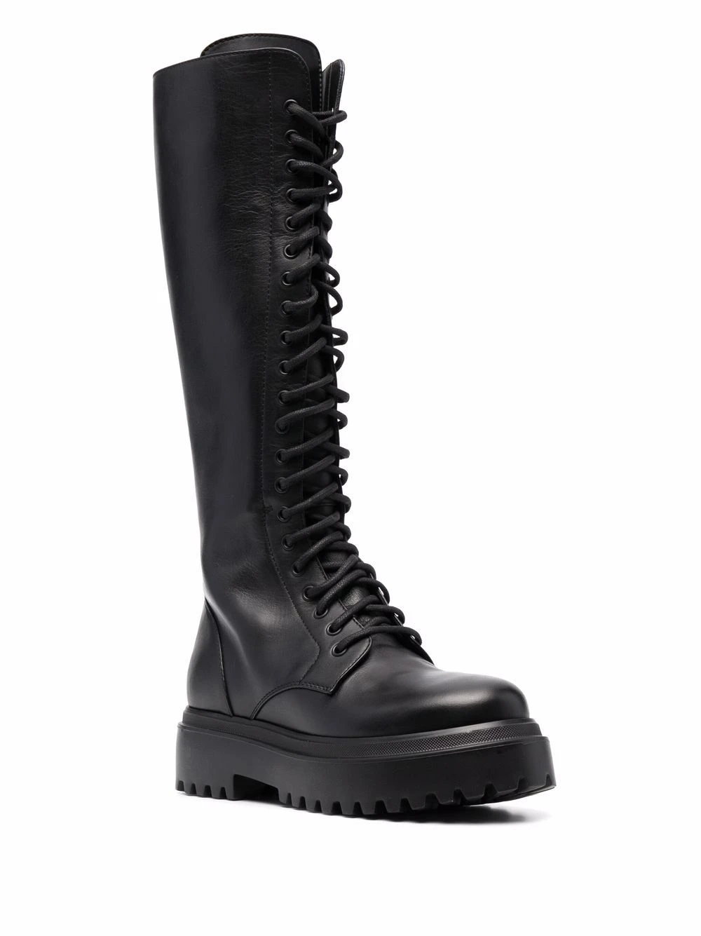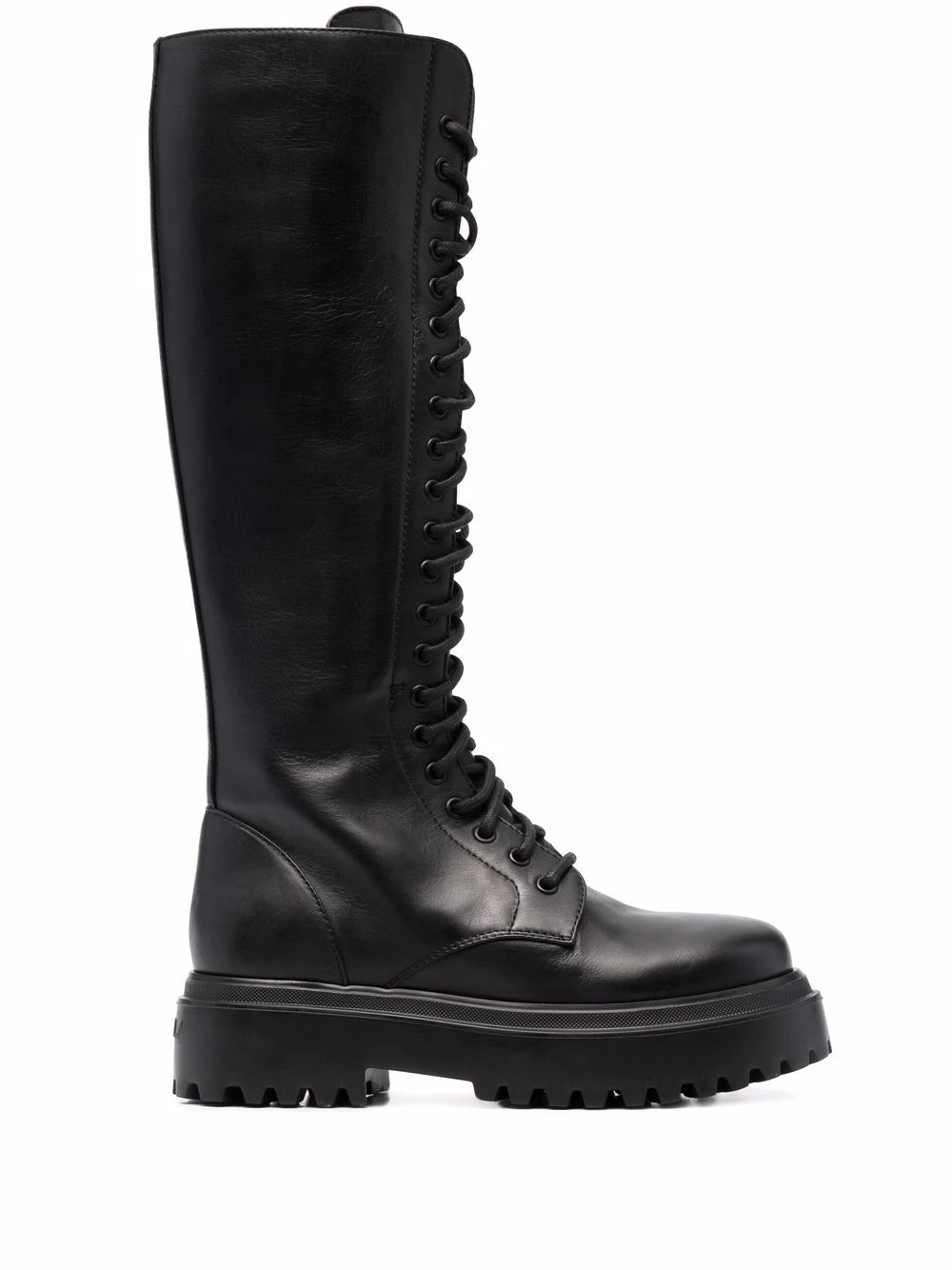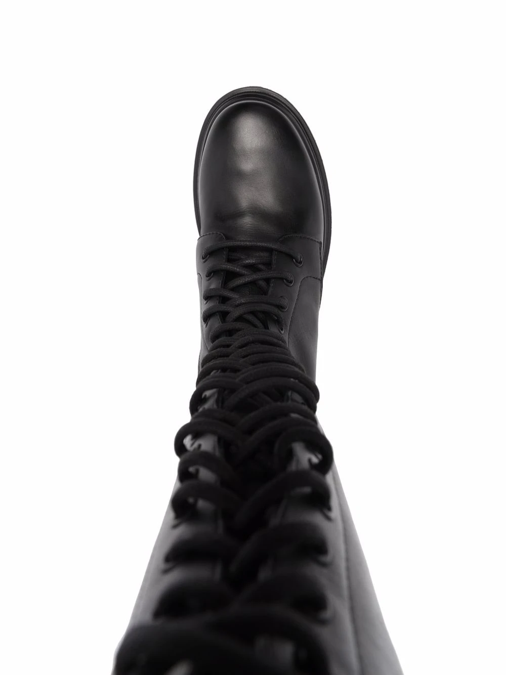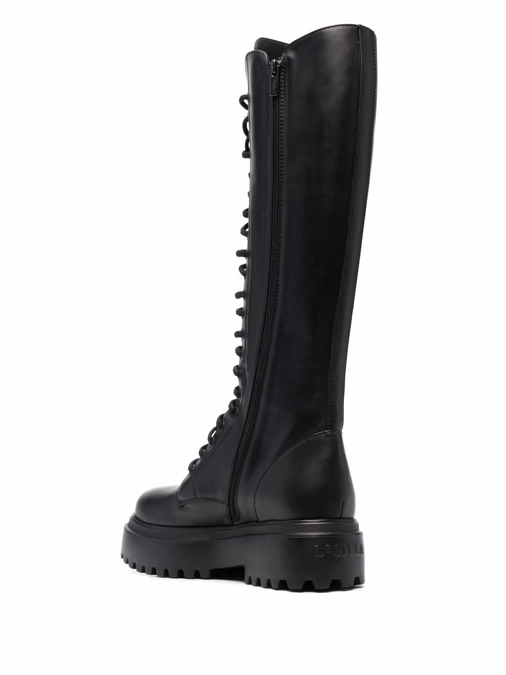 Fermeture à lacer sur le devant, bout rond, semelle épaisse crantée en caoutchouc. Couleur : noir.