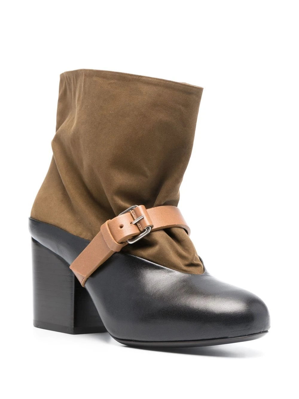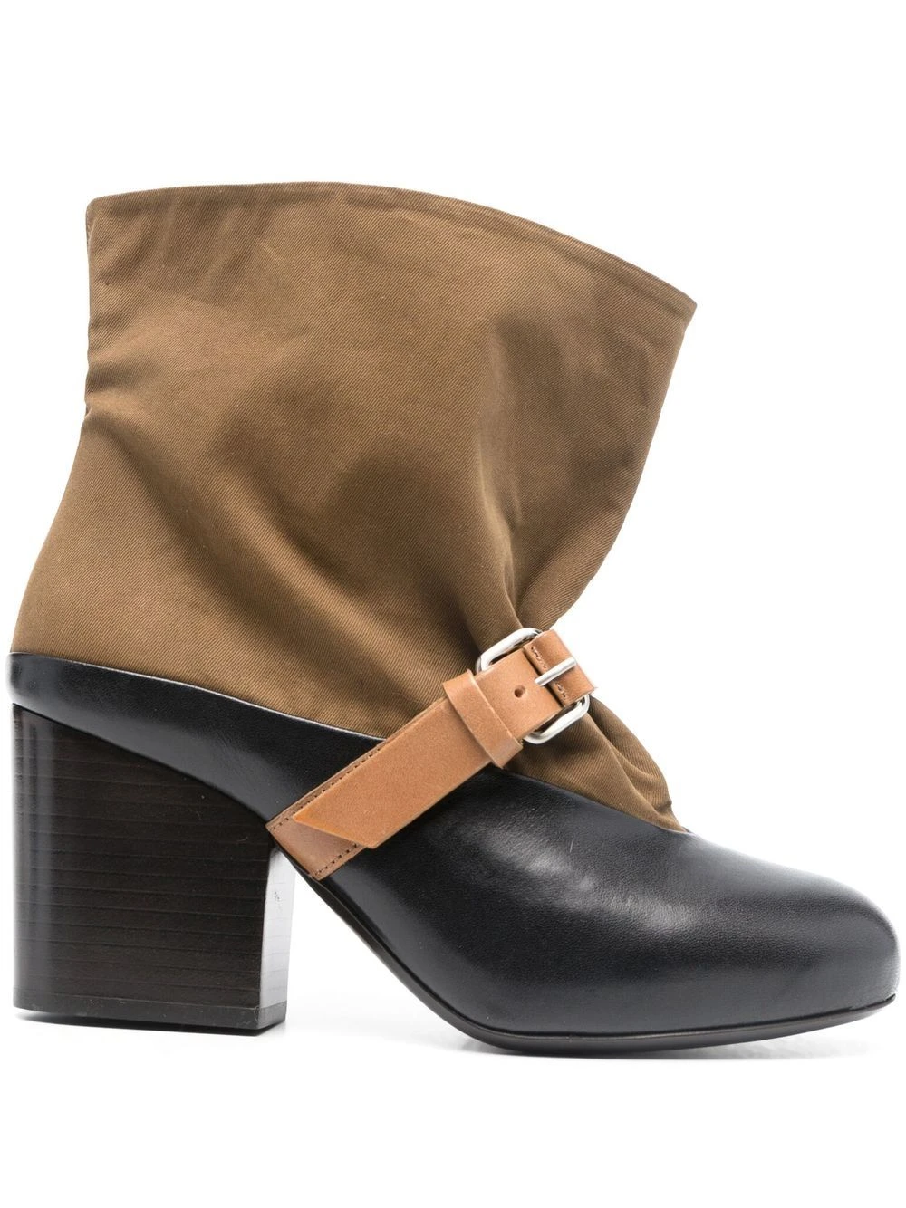 Brun taupe, noir, cuir de veau, design à empiècements, bout rond, fermeture à boucle, hauteur cheville, contrefort à logo, talon mi-haut épais.