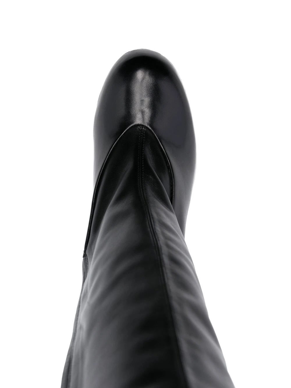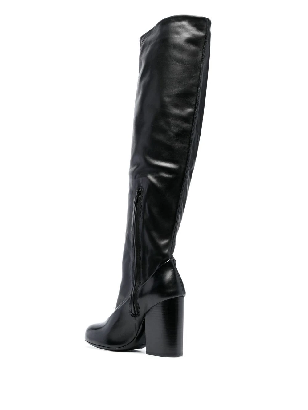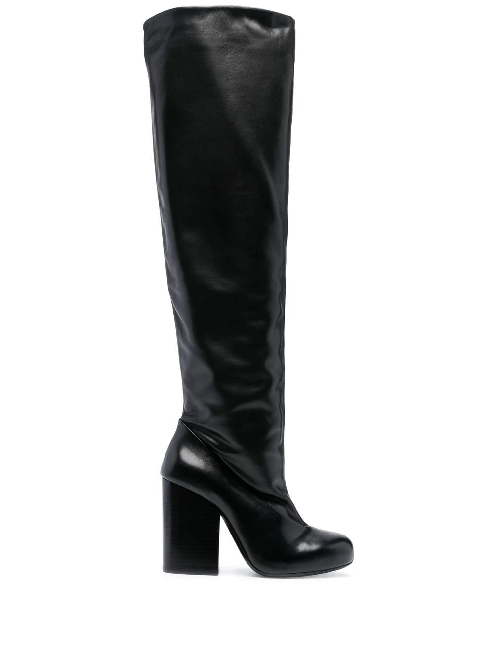Noir, fini poli, hauteur genou, bout rond, talon épais.