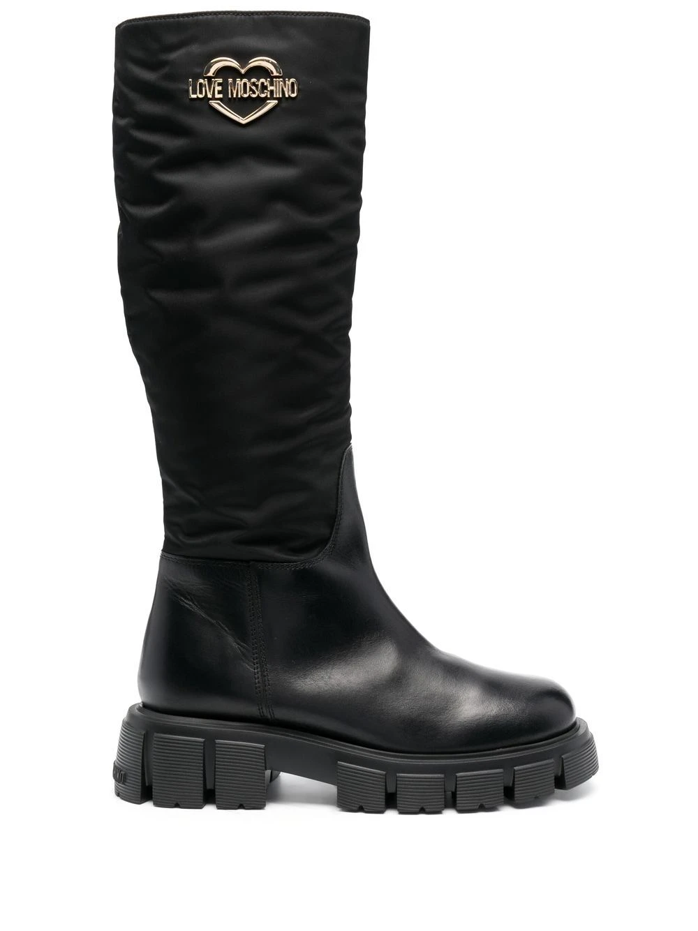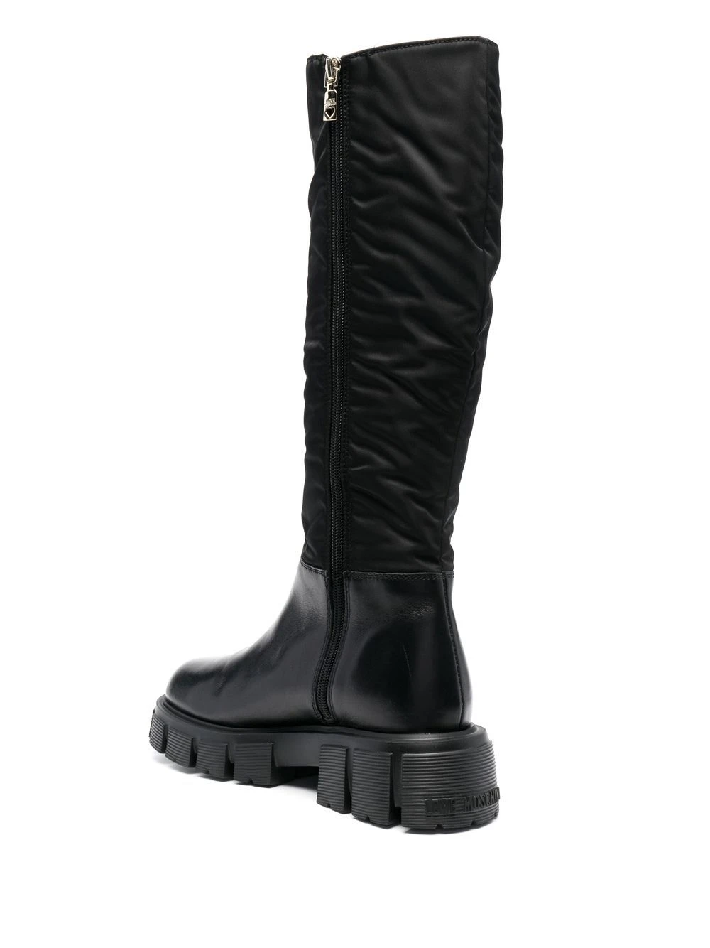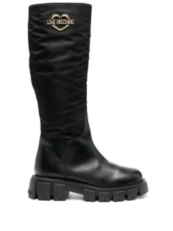 Noir, cuir de veau, plaque logo dorée, bout rond, fermeture zippée sur le côté, semelle épaisse en caoutchouc.