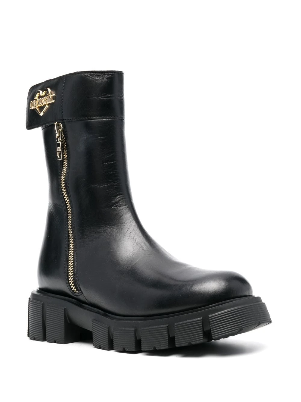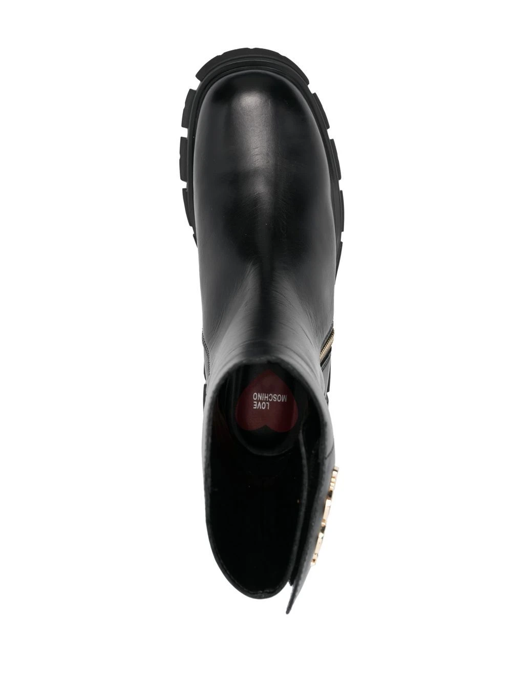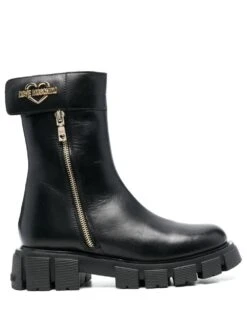 Noir, cuir de veau, plaque logo dorée, fermeture zippée sur les côtés, bout rond, semelle épaisse en caoutchouc.