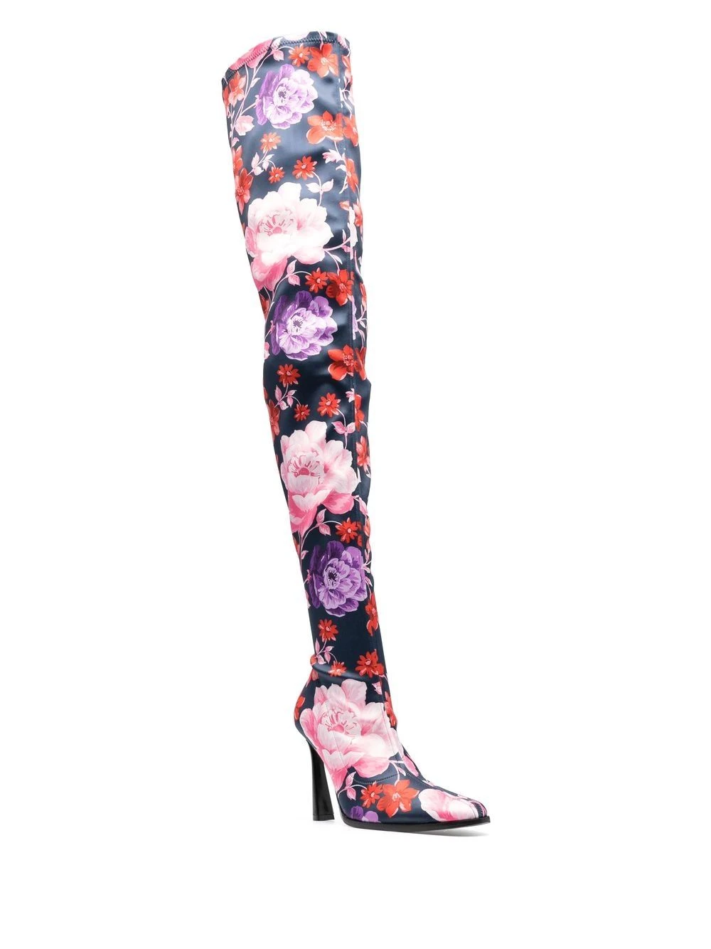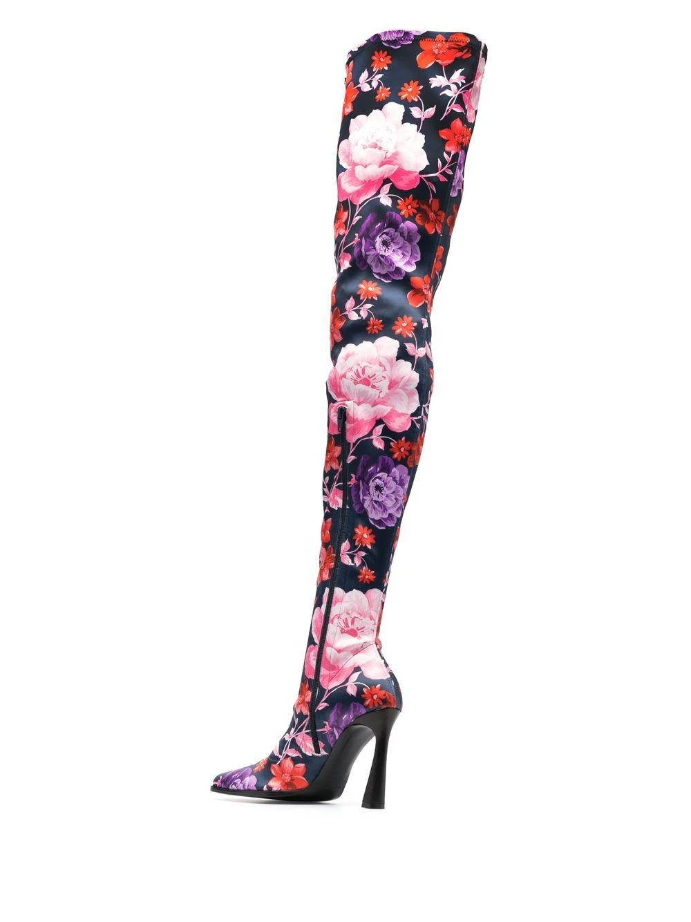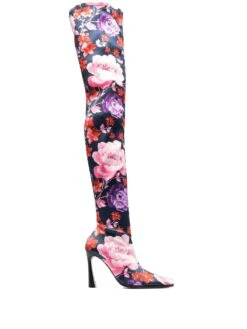 Multicolore, cuir de veau, motif de fleurs, bout pointu, talon aiguille, fermeture zippée sur le côté, hauteur genou.