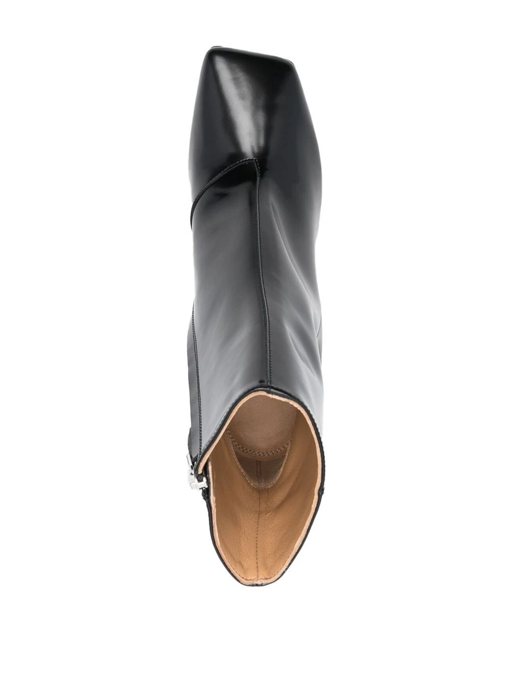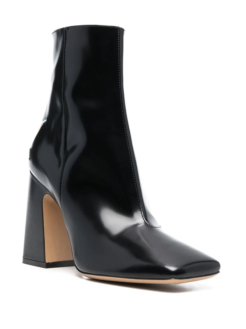 Noir de jais, cuir de veau, logo brodé signature, fini verni, bout carré, fermeture zippée sur le côté, hauteur cheville, talon haut épais.
