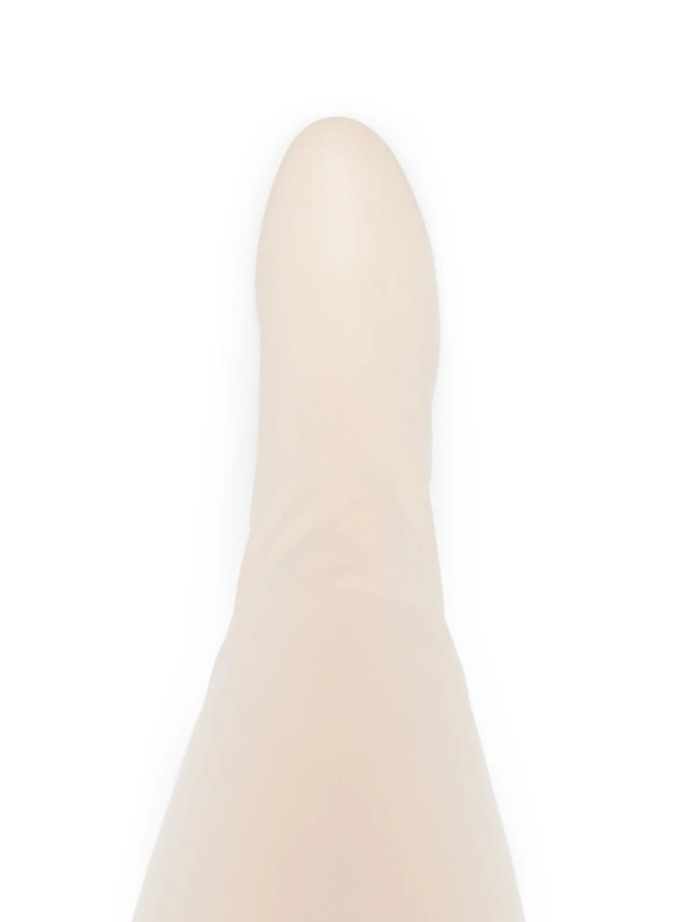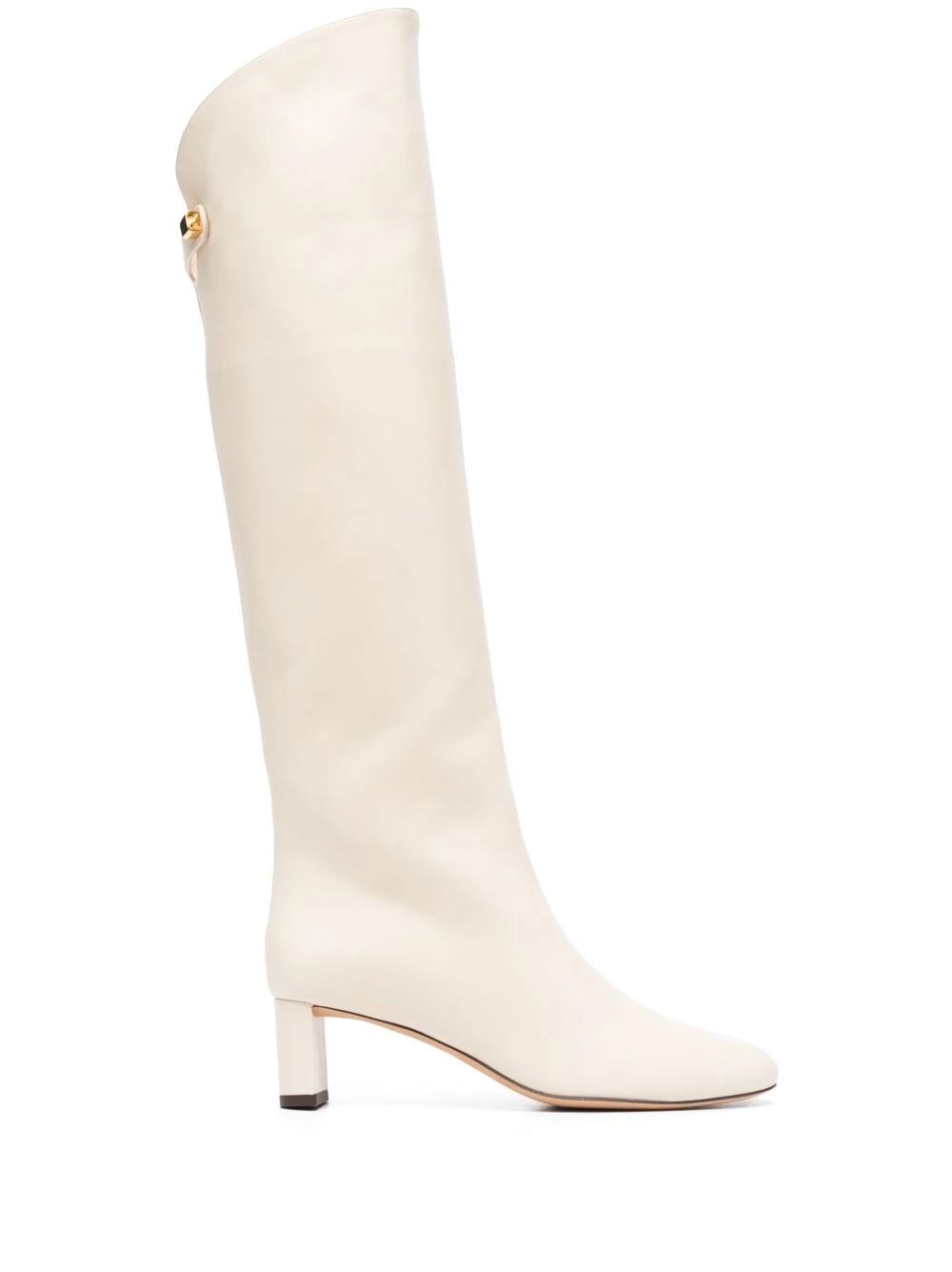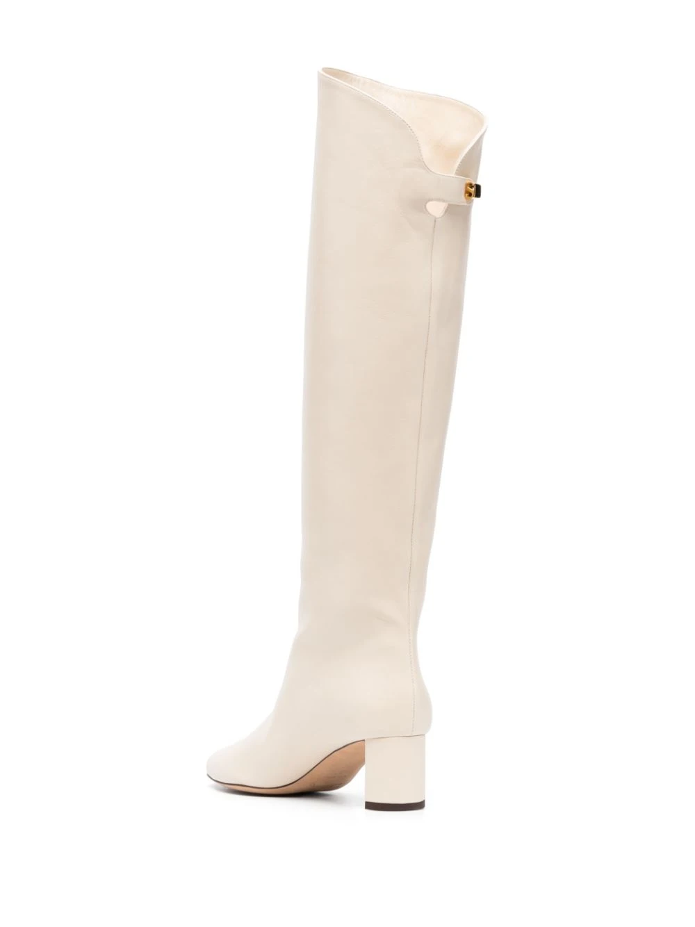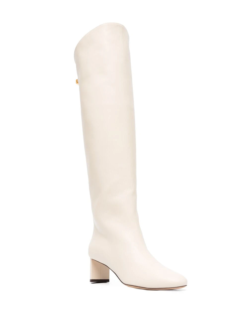 Blanc crème, cuir de veau, design à enfiler, hauteur genou, talon épais.
