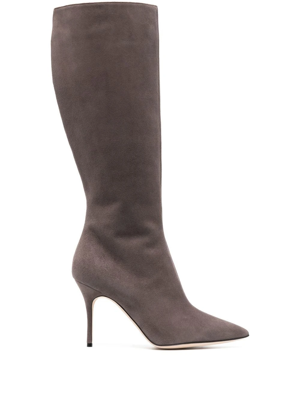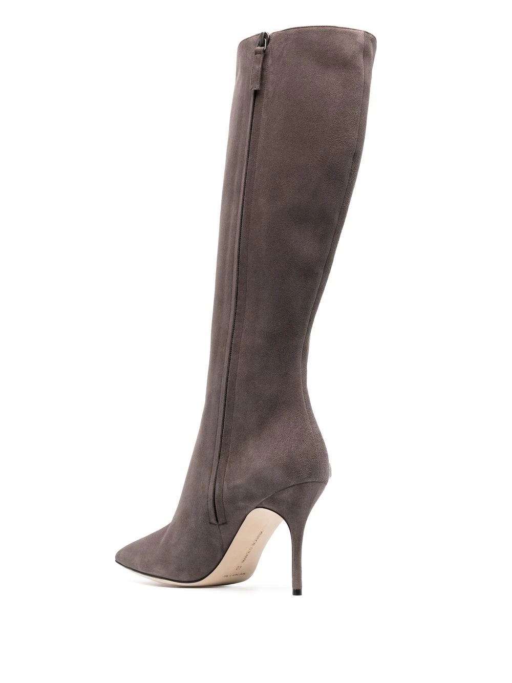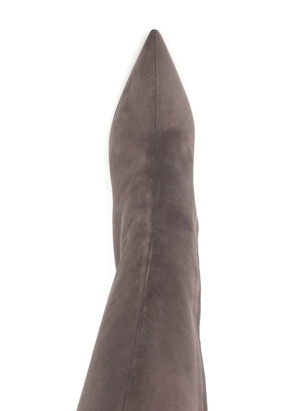 Gris, veau velours, bout pointu, fermeture zippée sur le côté, talon aiguille haut.
