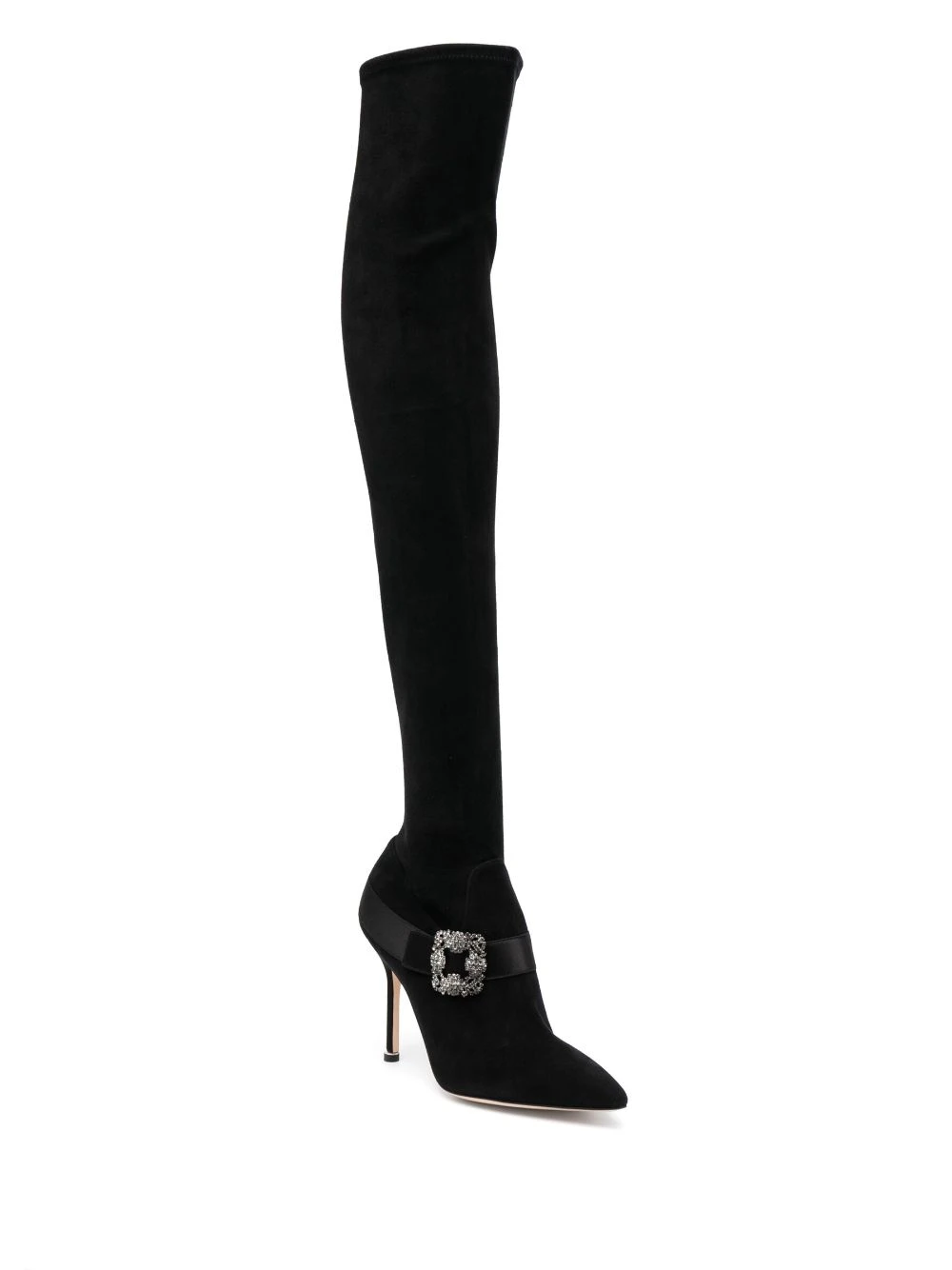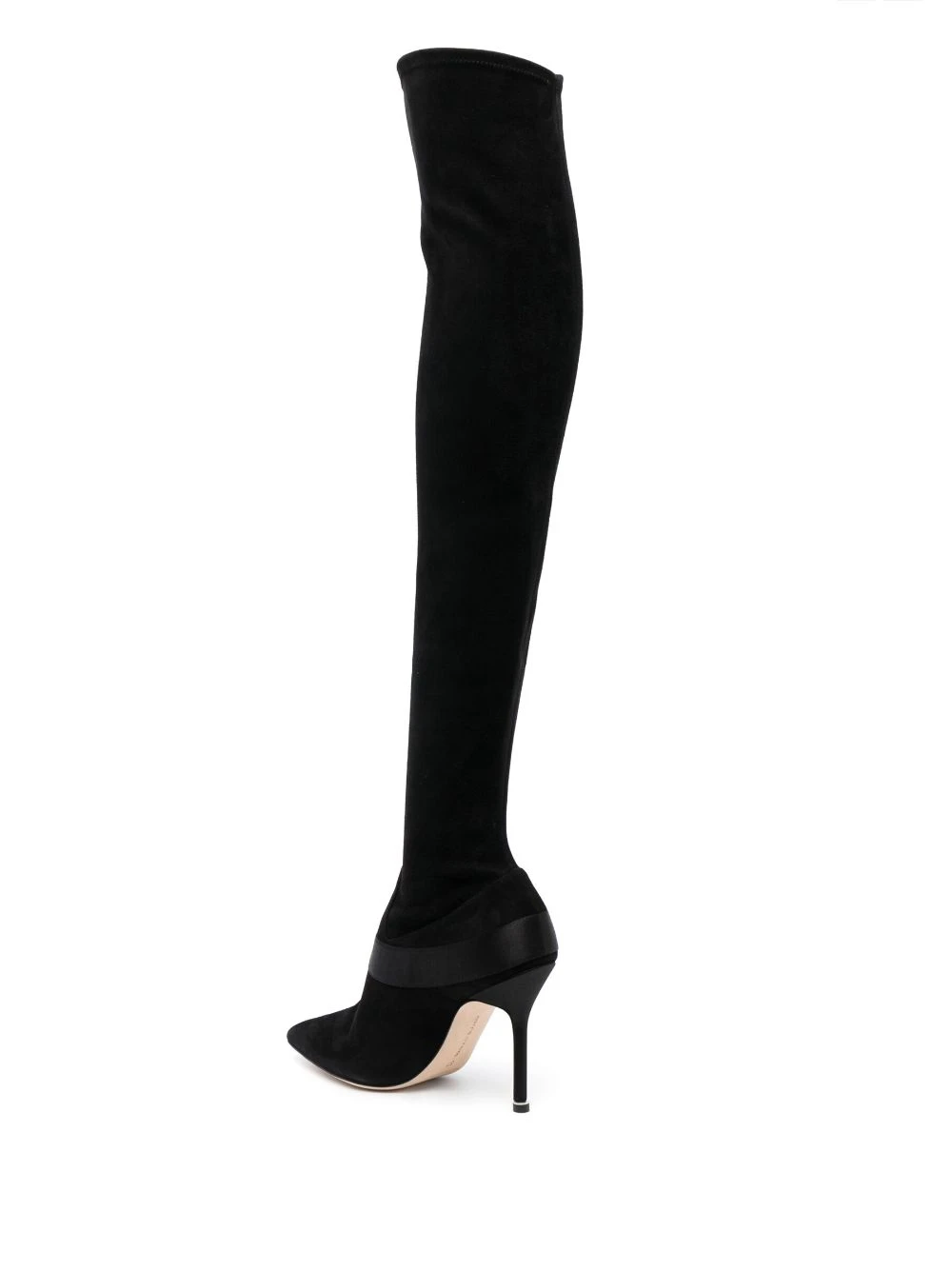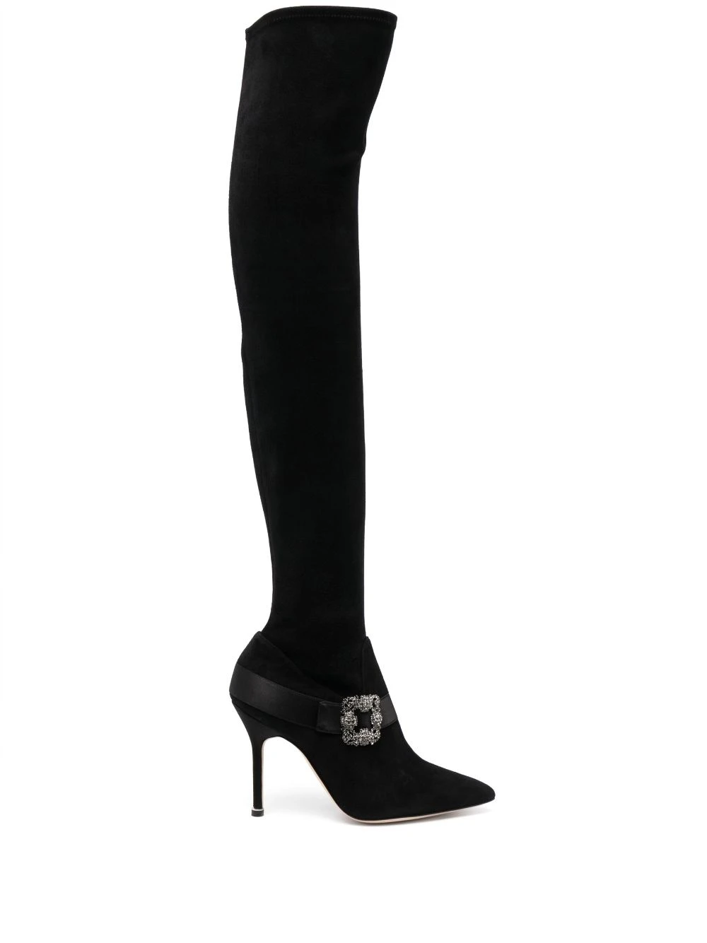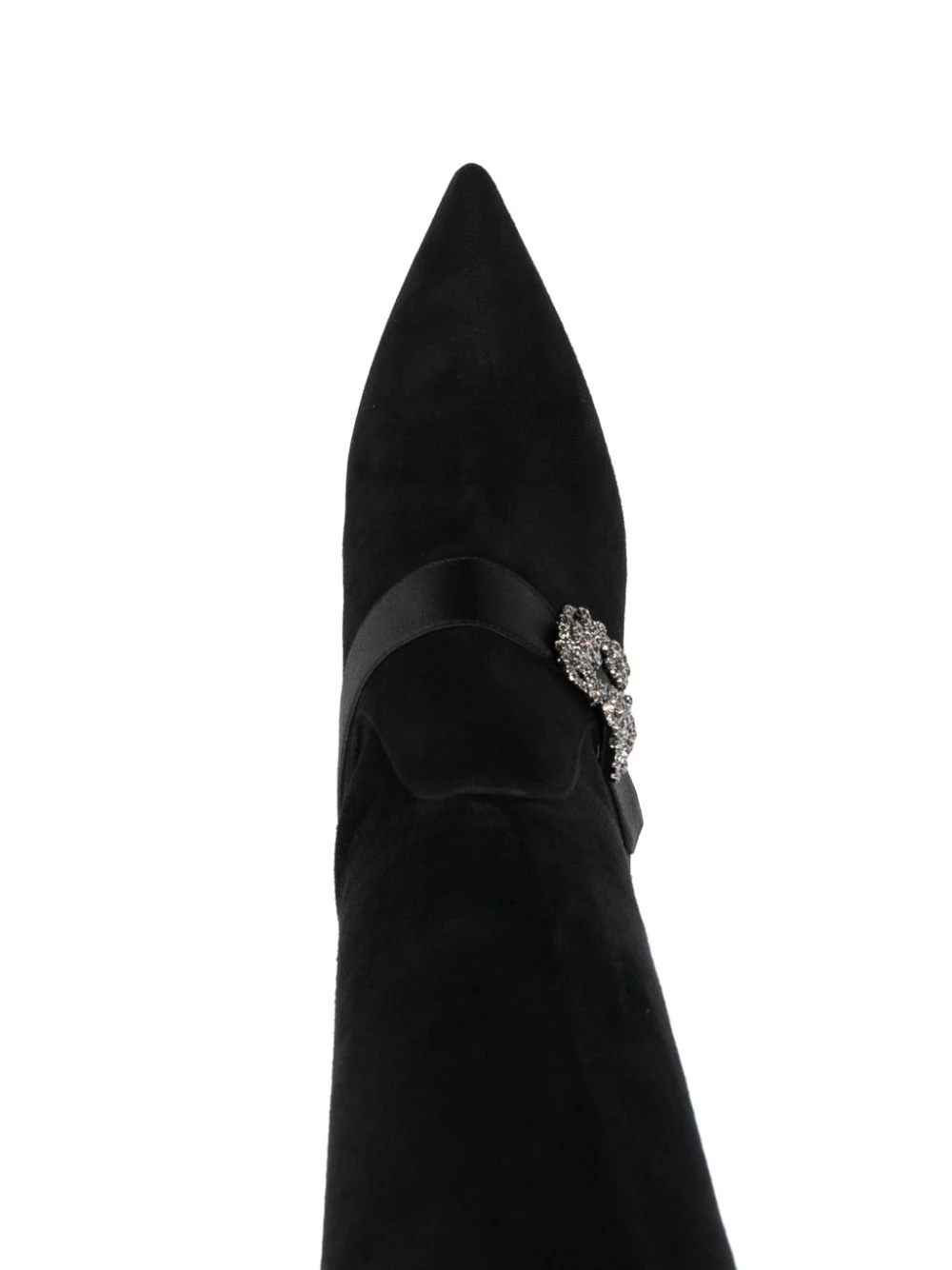 Noir, cuir de veau, daim, détail de boucle à cristaux, bout pointu, talon aiguille haut, semelle extérieure en cuir, hauteur genou.