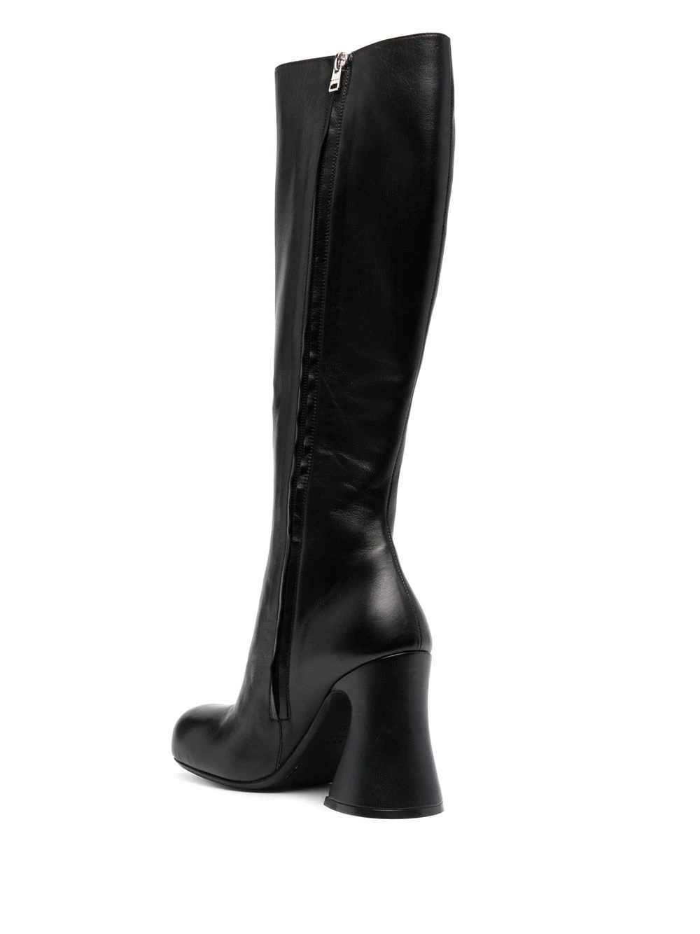 Noir, cuir, hauteur genou, bout rond, talon haut épais, fermeture zippée sur le côté.