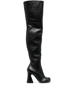 Noir, cuir de veau, talon sculpté haut, hauteur cuisse, bout rond, fermeture zippée sur le côté.