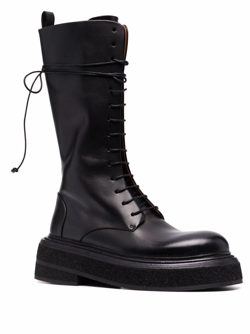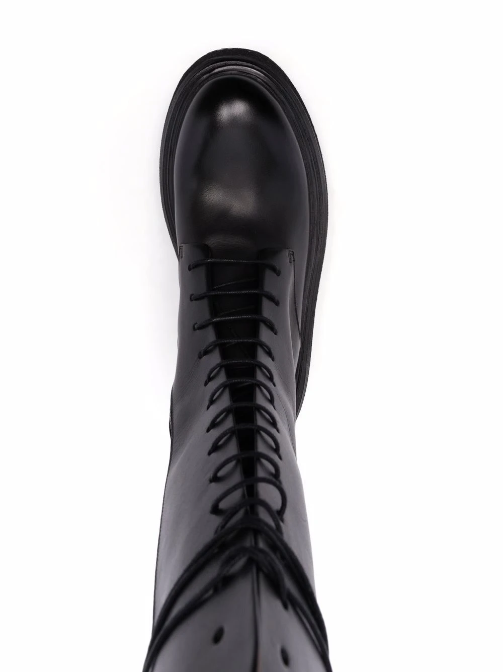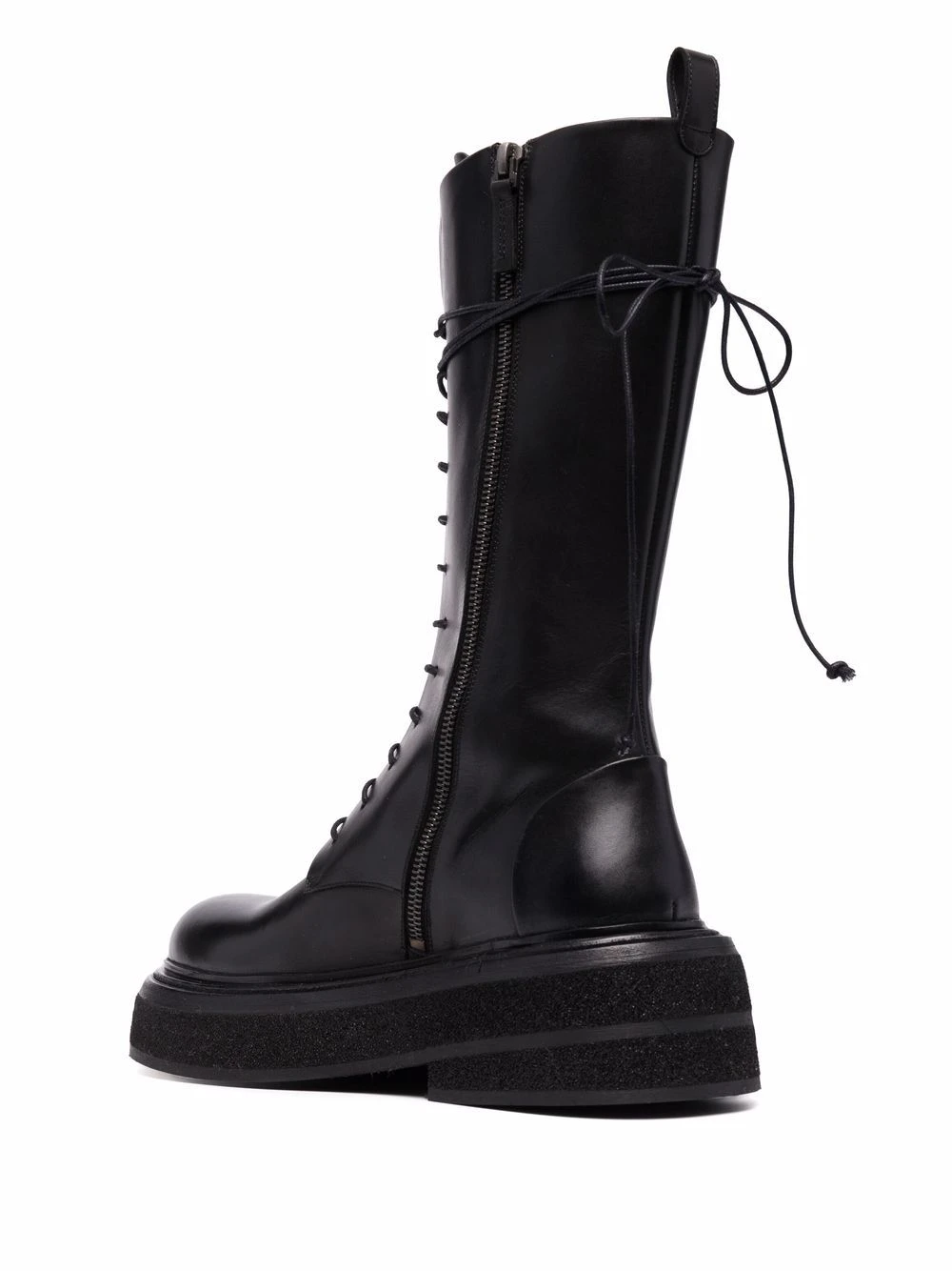 Coutures ton sur ton, bout en amande, fermeture à lacer sur le devant, fermeture zippée sur le côté, petit talon, semelle à plateforme. Couleur : noir. Matière : cuir de veau.