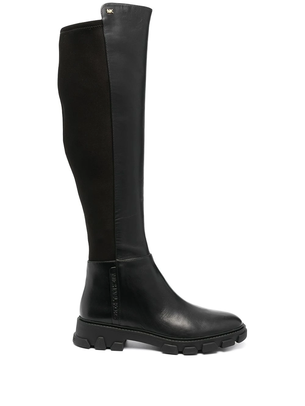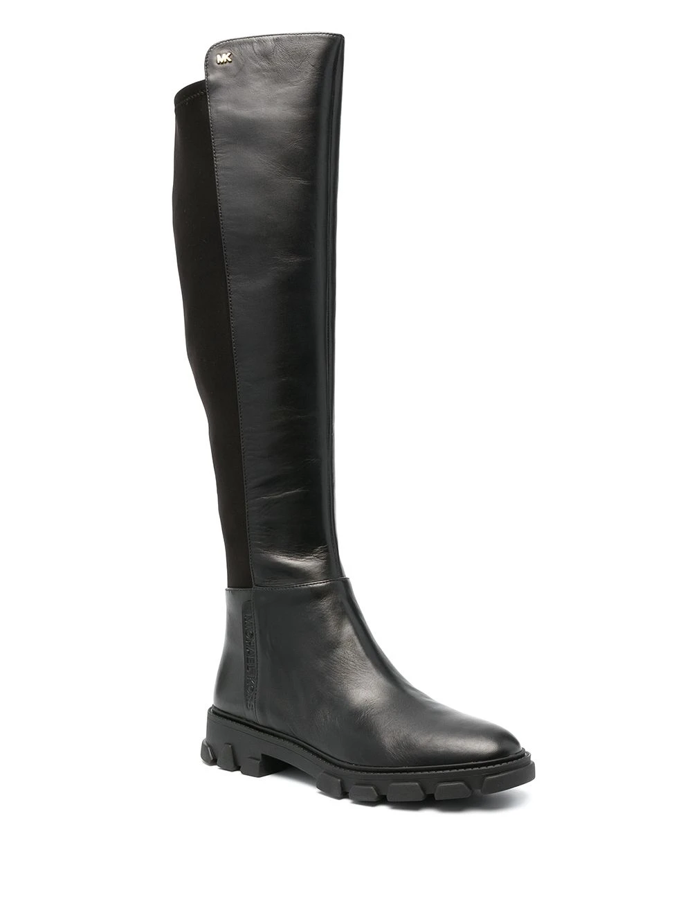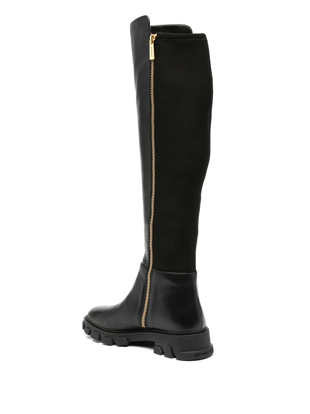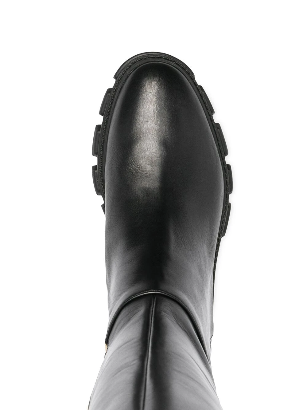 Bout en amande, design à empiècements, logo embossé sur le côté, fermeture zippée sur le côté, hauteur genou, petit talon, semelle épaisse en caoutchouc. Couleur : noir. Matière : cuir de veau.
