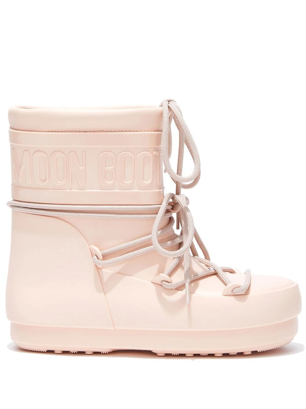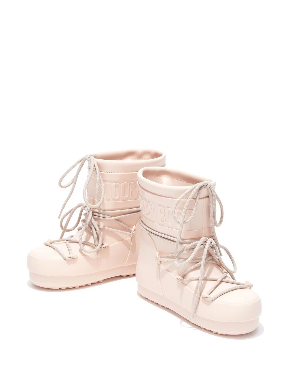 Rose clair, bride à logo embossé, fermeture à lacer sur le devant, bout rond, hauteur cheville, semelle plate en caoutchouc.