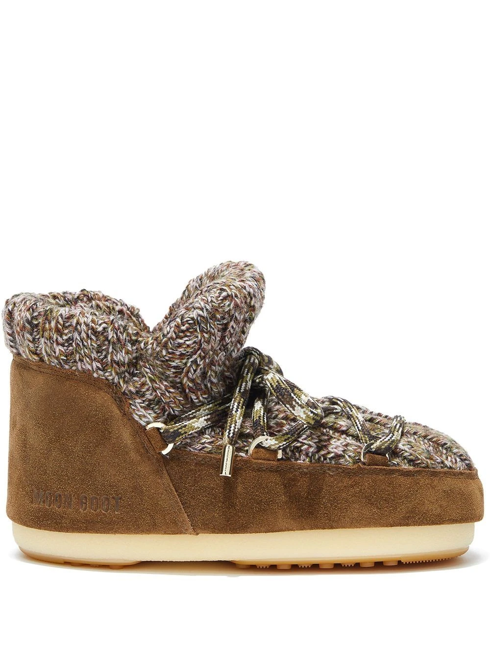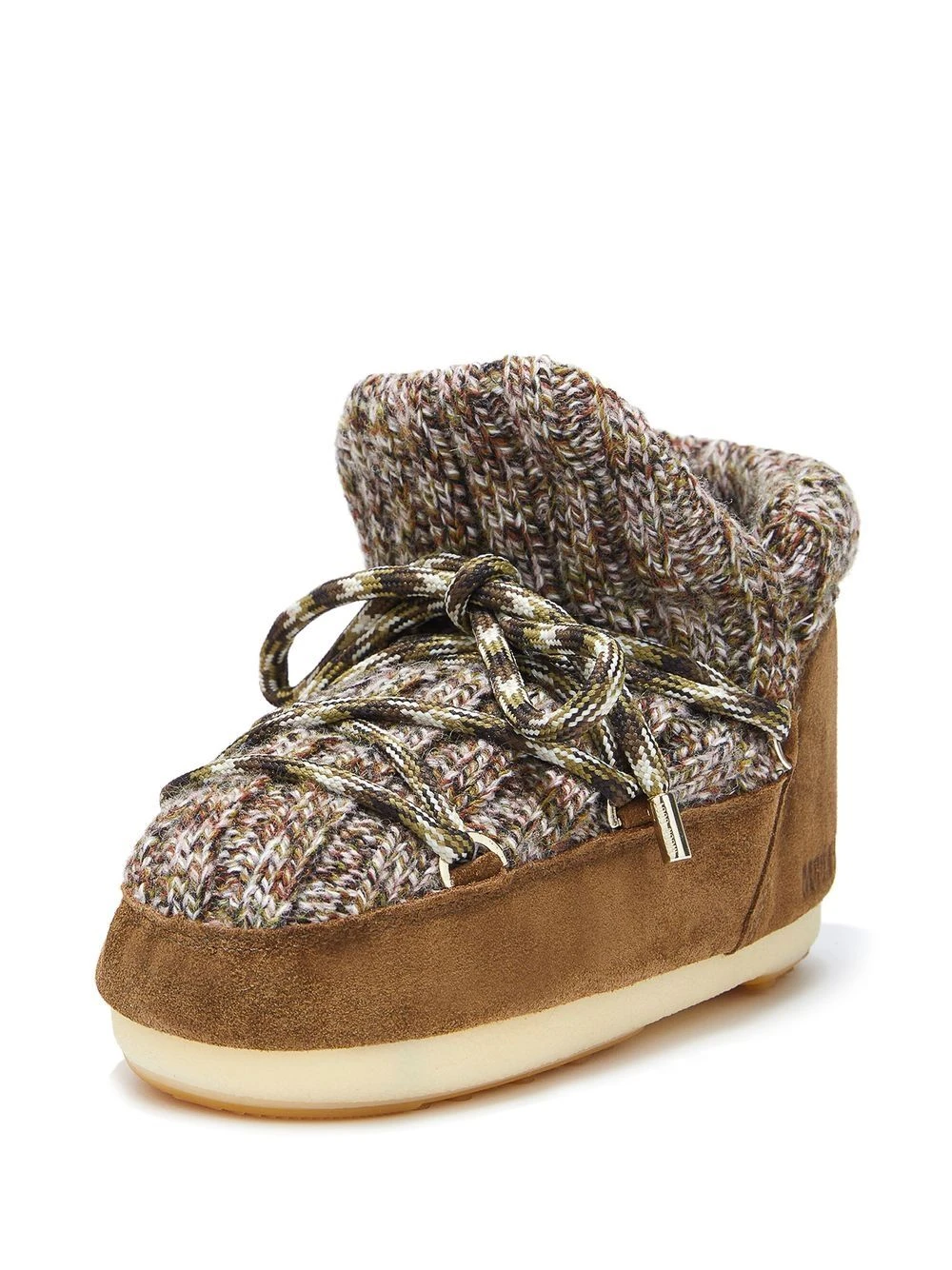 Marron, laine, tige en maille, logo embossé sur le côté, fermeture à lacer sur le devant, bout rond, semelle plate en caoutchouc.