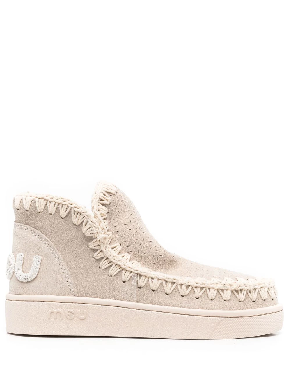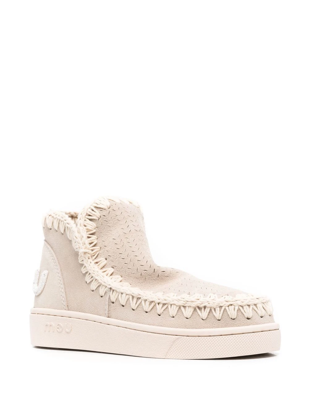 Beige clair, cuir, couture décorative, détails de perforations, patch logo sur l’arrière, bout rond, semelle plate en caoutchouc.