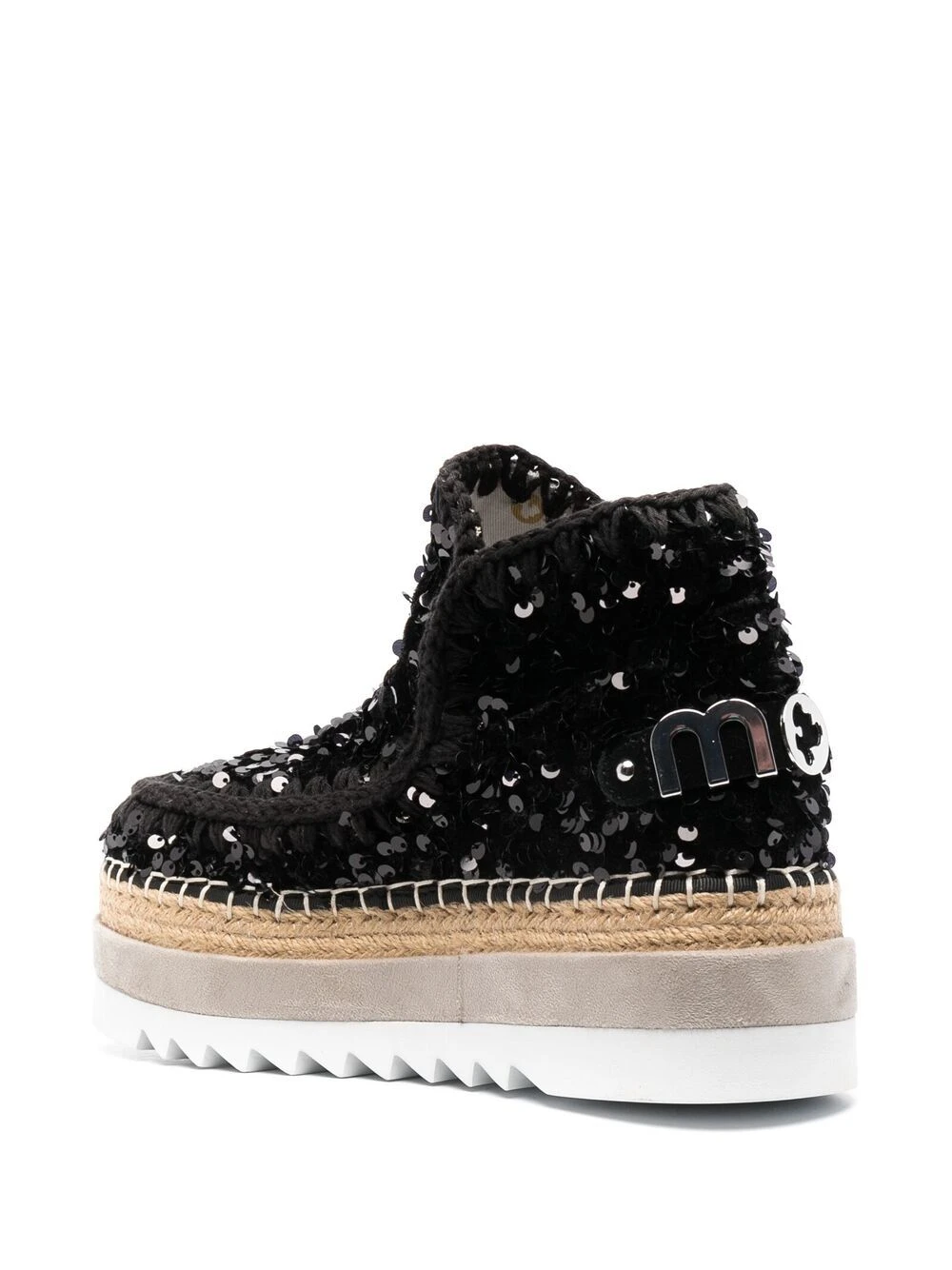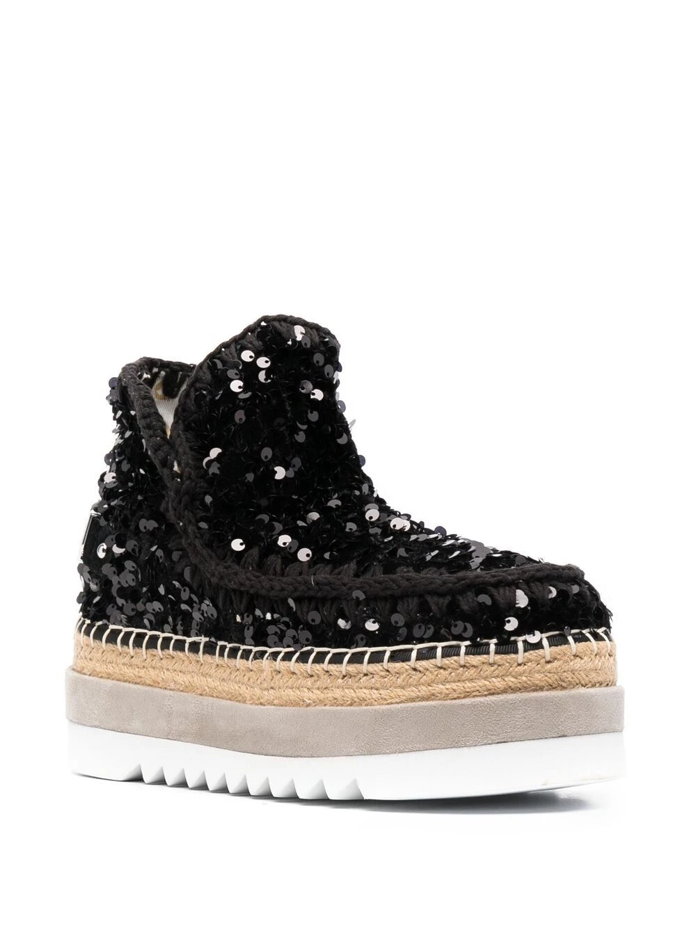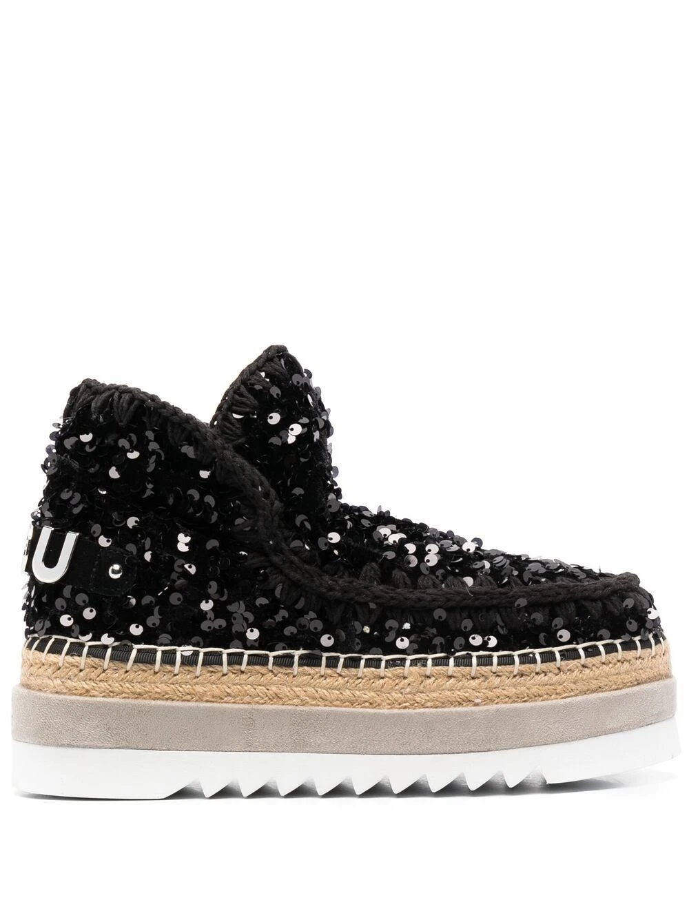 Ornements en sequins, semelle à plateforme, semelle en raphia tressé, logo argenté, design à enfiler. Couleur : noir. Matière : cuir.