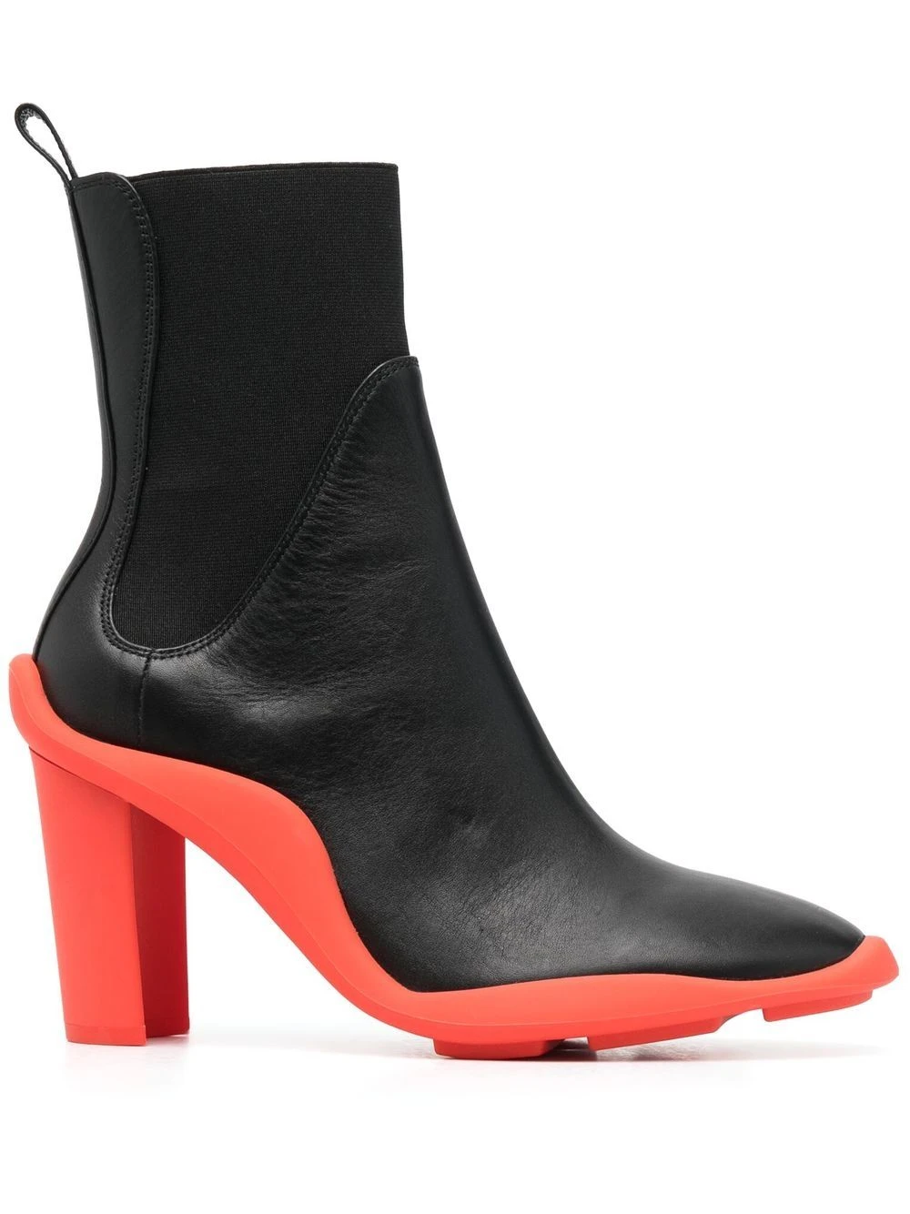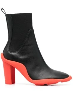 Noir de jais, rouge vif, cuir de veau, bout en amande, languette d’enfilage au talon, talon mi-haut, design à enfiler.