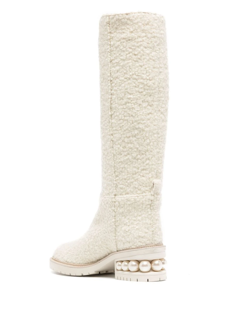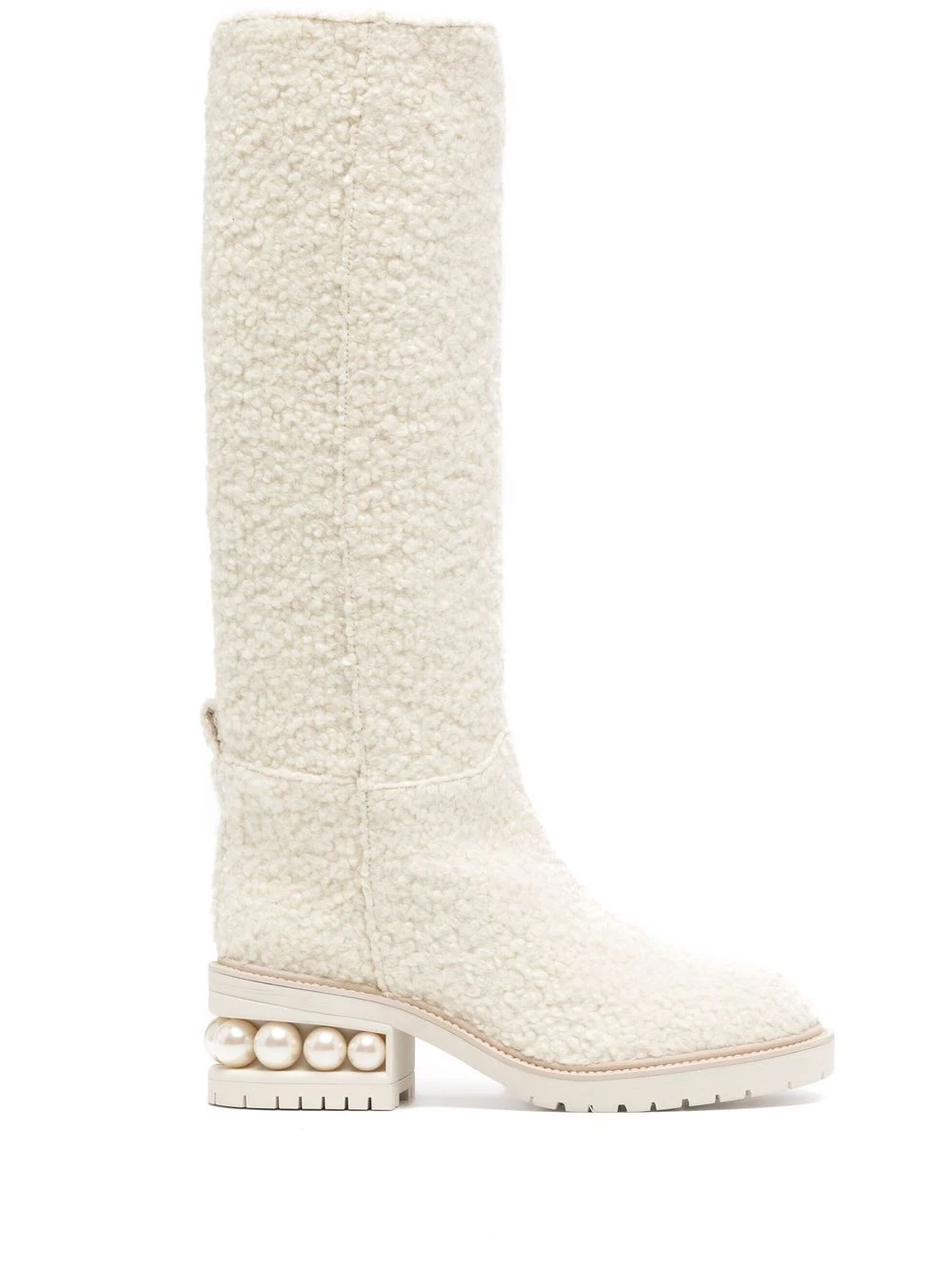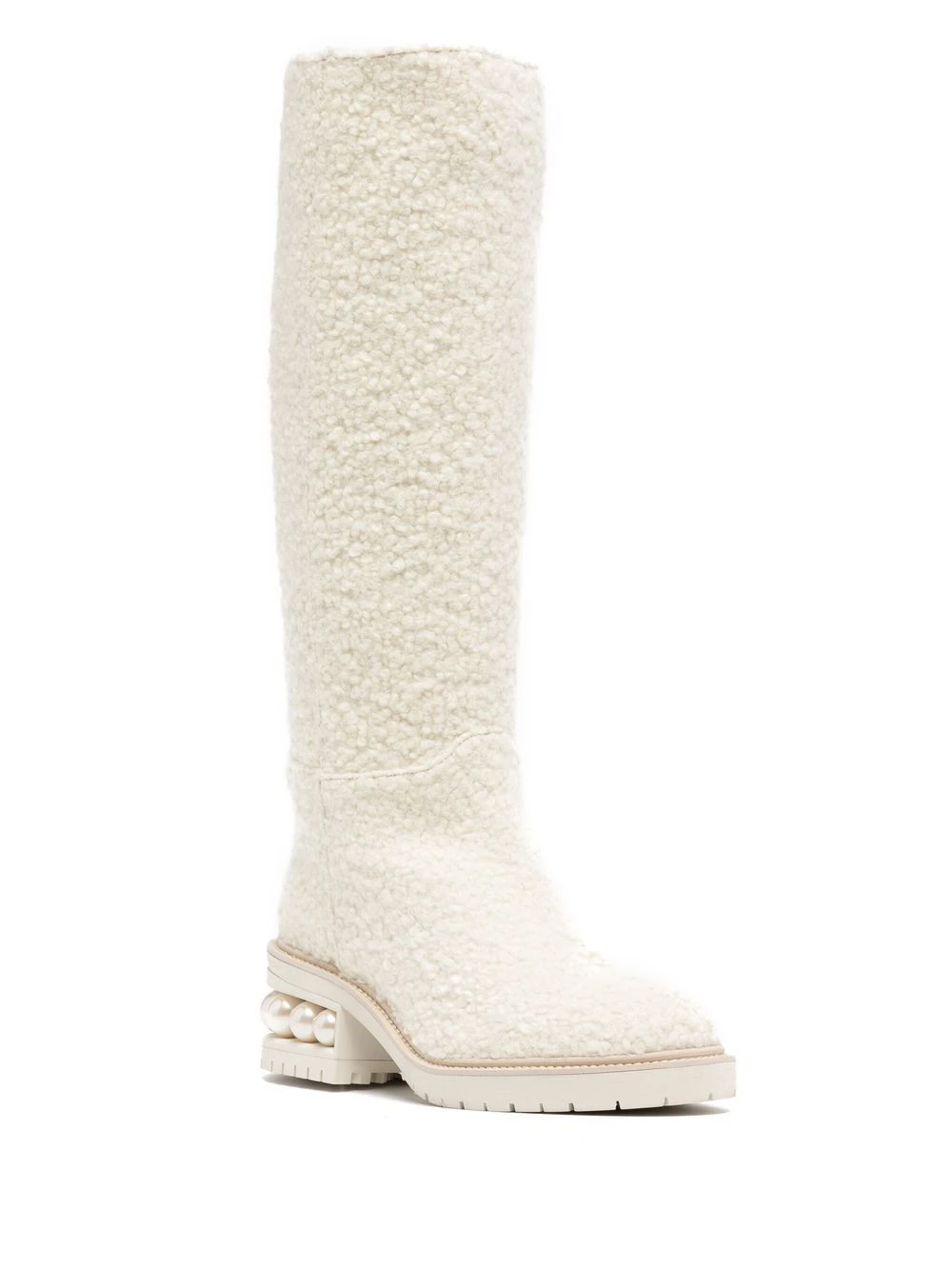 Blanc, laine, cuir, détails de perles artificielles, bout rond, design à enfiler, languette d’enfilage au talon, petit talon nervuré, hauteur genou. CHOIX CONSCIENT : nous nous sommes associés à Good On You — une agence éthique qui évalue la performance durable des marques. Cet article vient d’une marque qui est bien notée sur son impact sur la planète..