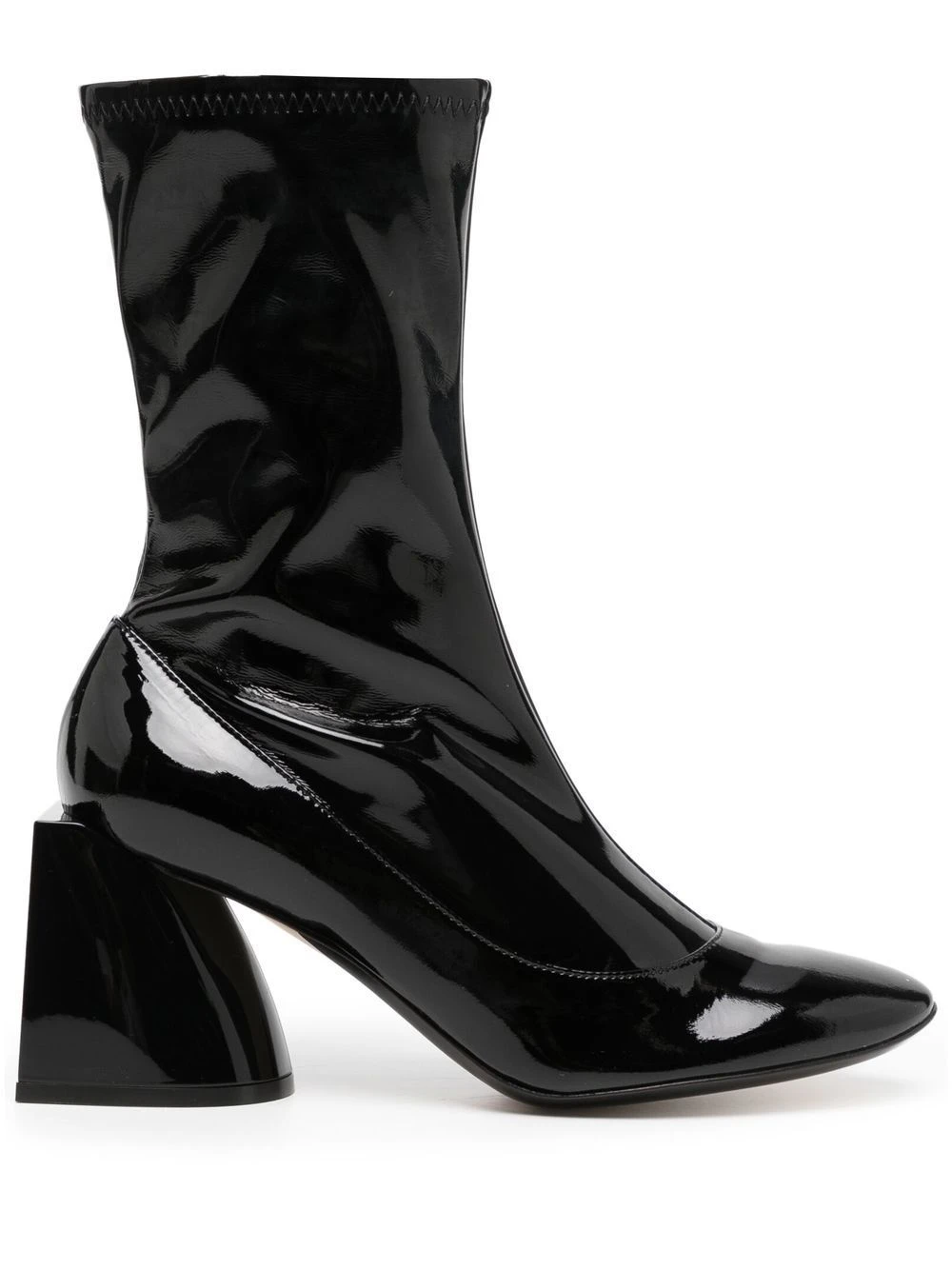 Noir, cuir de veau, fini verni, cheville style chaussette, longueur mollet, bout rond, talon mi-haut épais.