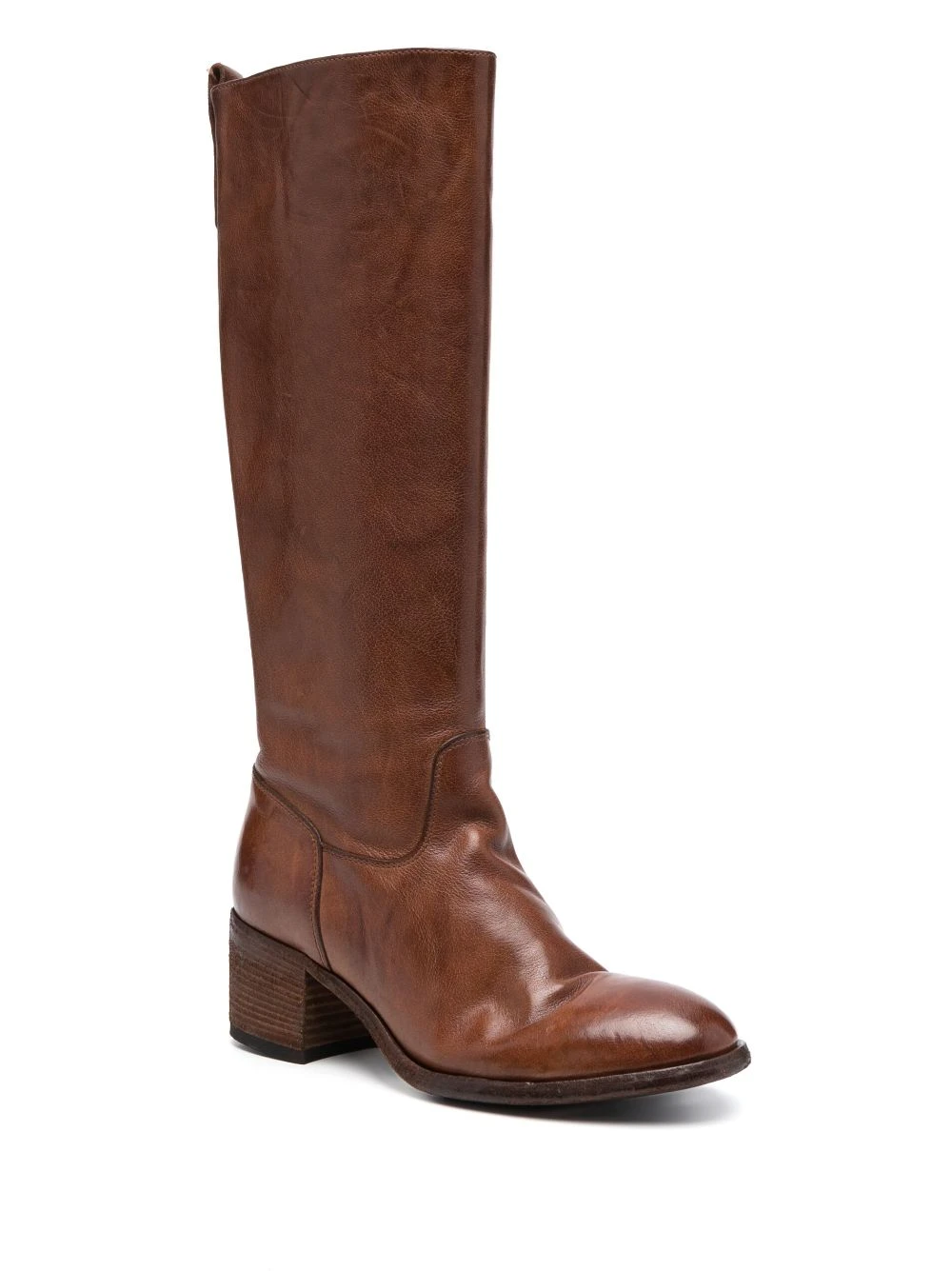 Marron, cuir de veau, grain lisse, languette d’enfilage au talon, bout en amande, hauteur genou, fermeture zippée sur les côtés, petit talon épais, semelle en cuir.