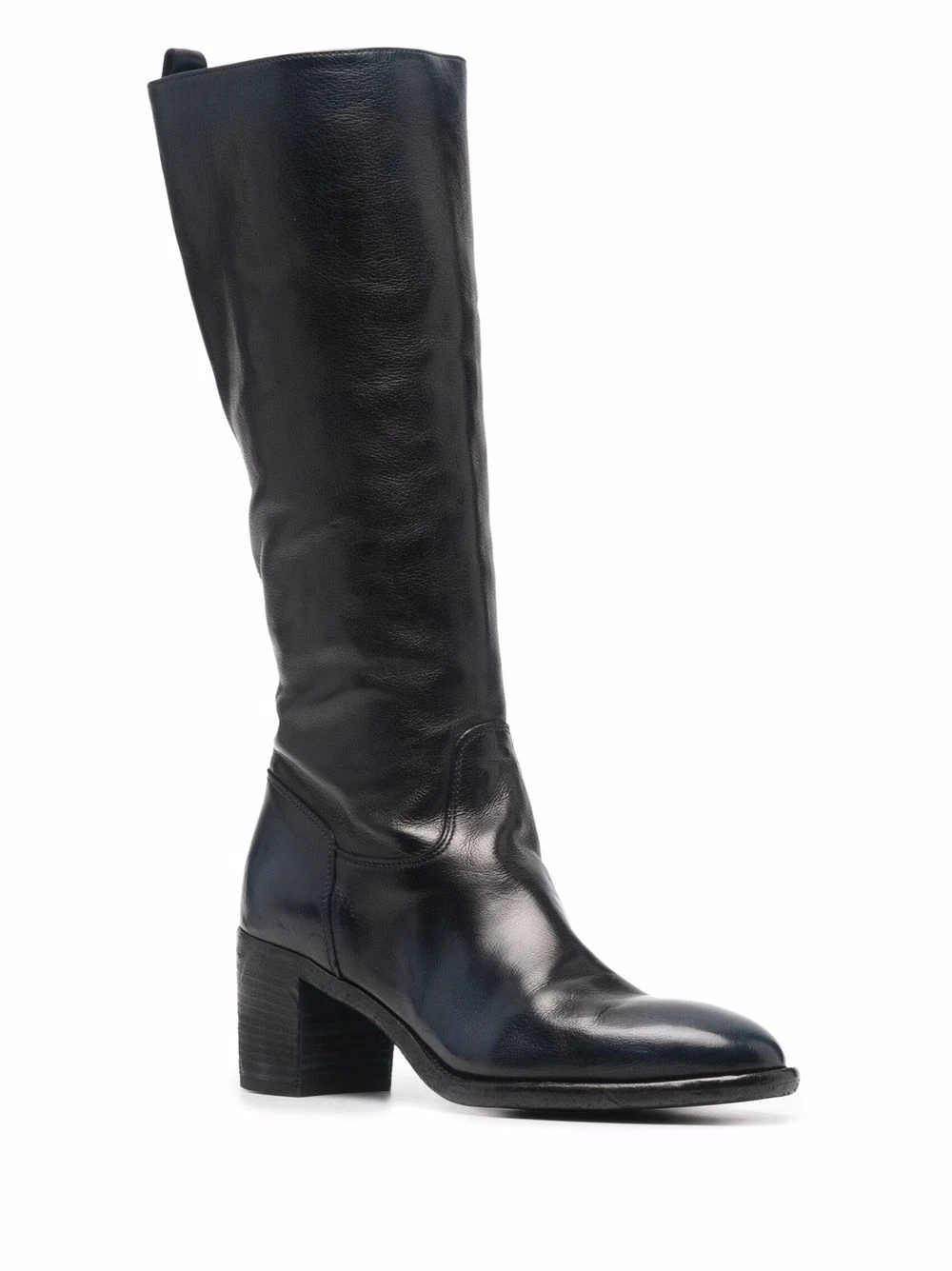 Fini poli, bout en amande, hauteur genou, languette d’enfilage au talon, fermeture zippée sur le côté, petit talon épais. Matière : cuir.