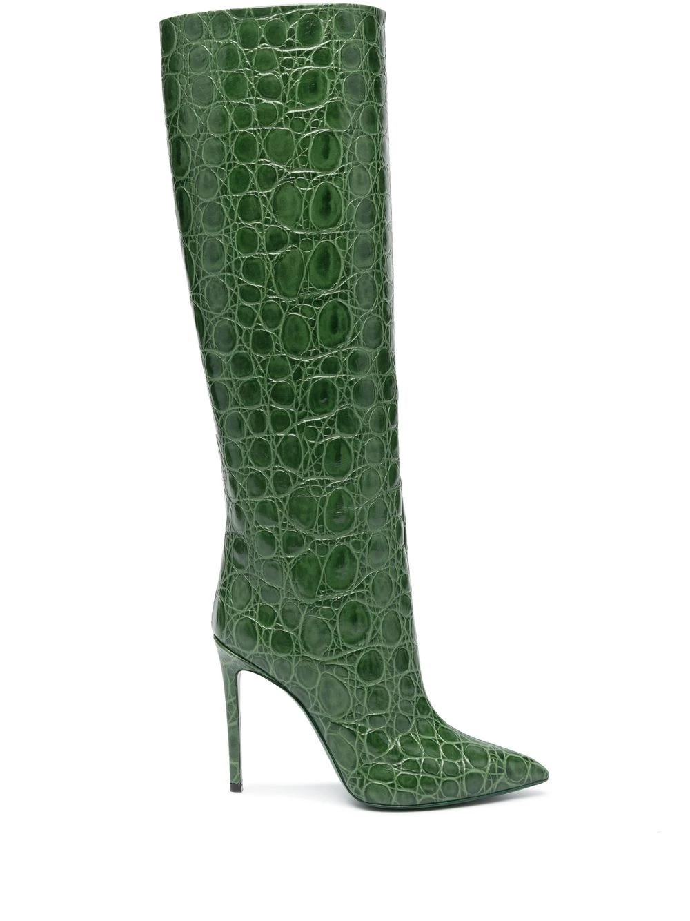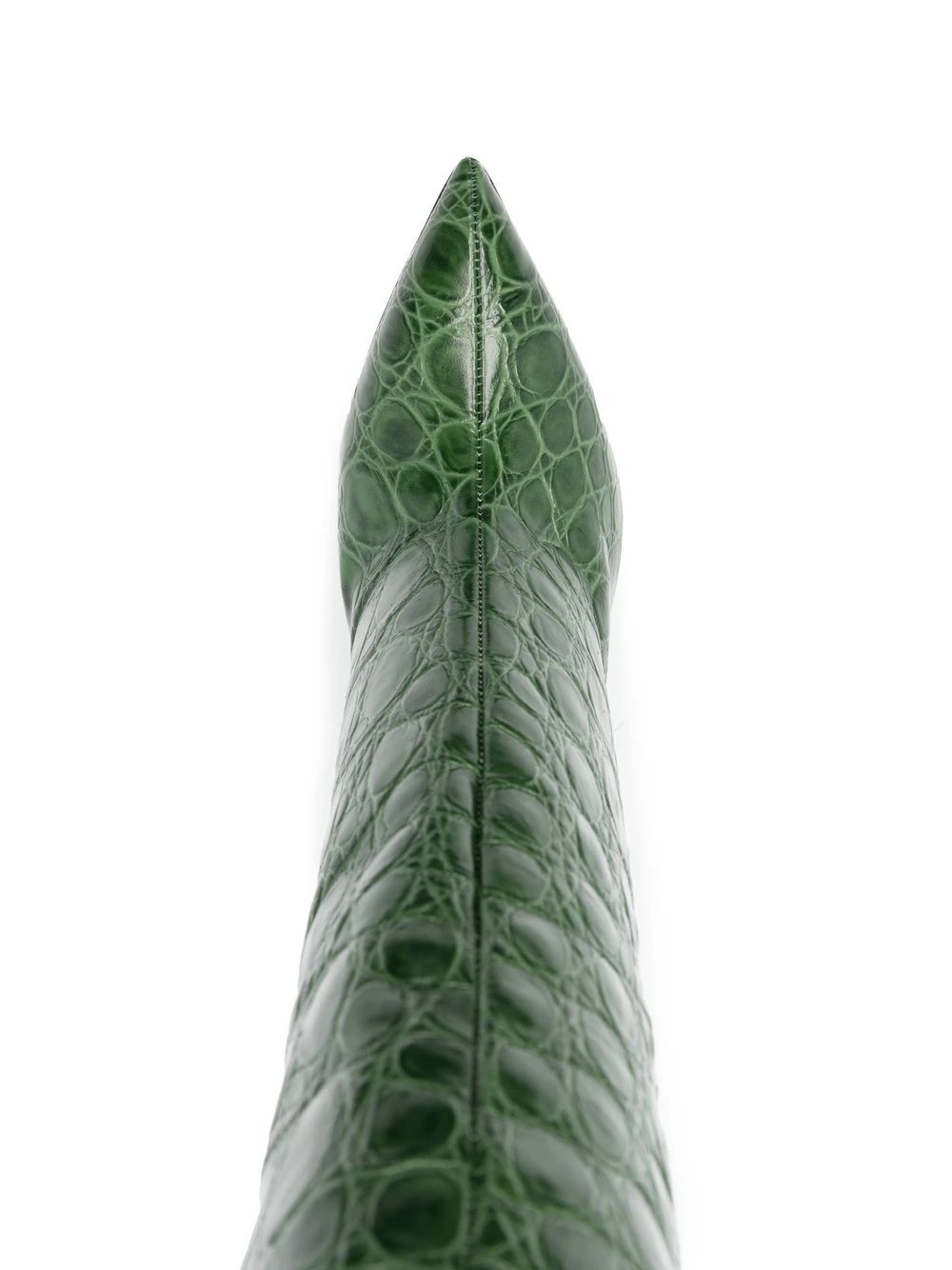 Vert mousse, cuir de veau, effet peau de crocodile, bout pointu, design à enfiler, hauteur genou, contrefort à logo, talon aiguille haut.