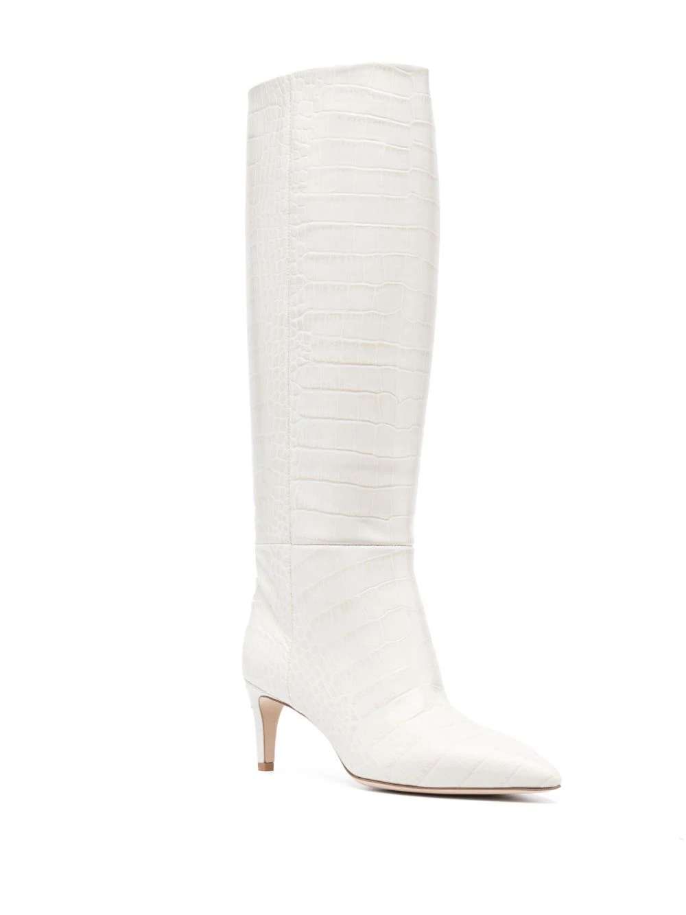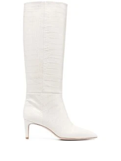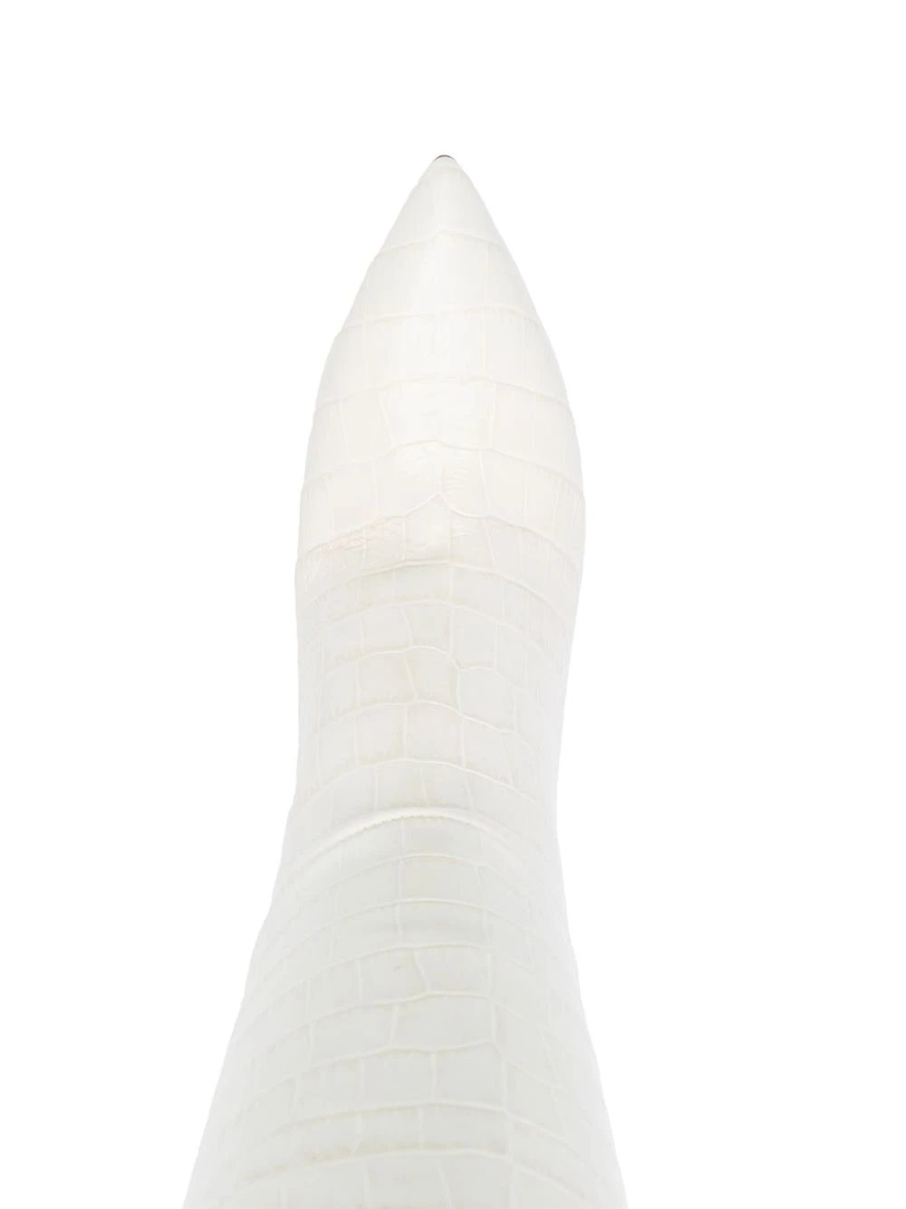 Blanc cassé, cuir de veau, effet peau de crocodile, bout pointu, à enfiler, hauteur genou.