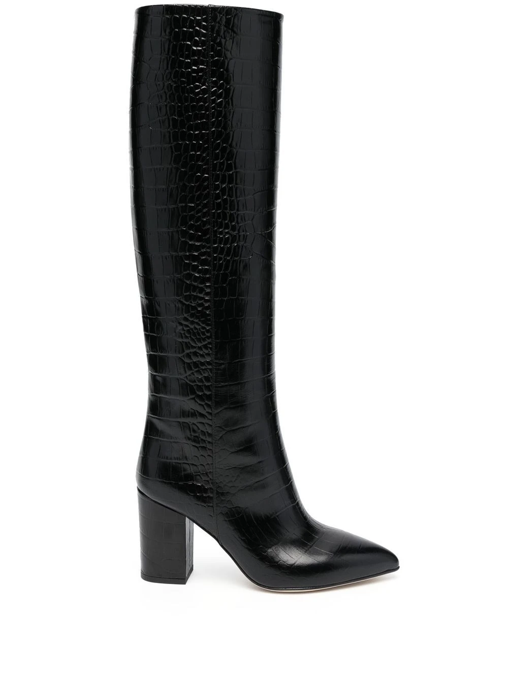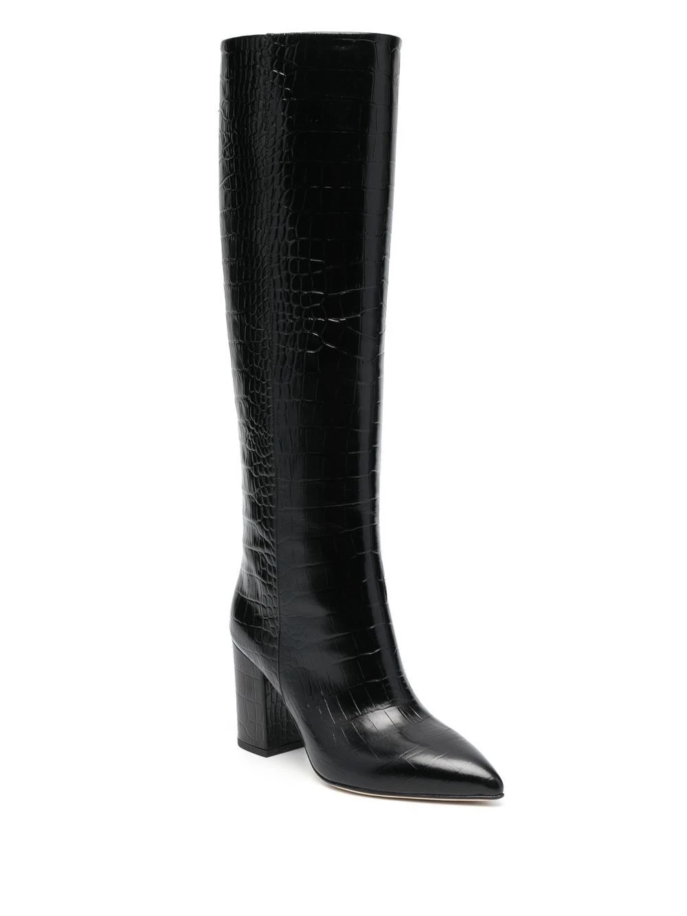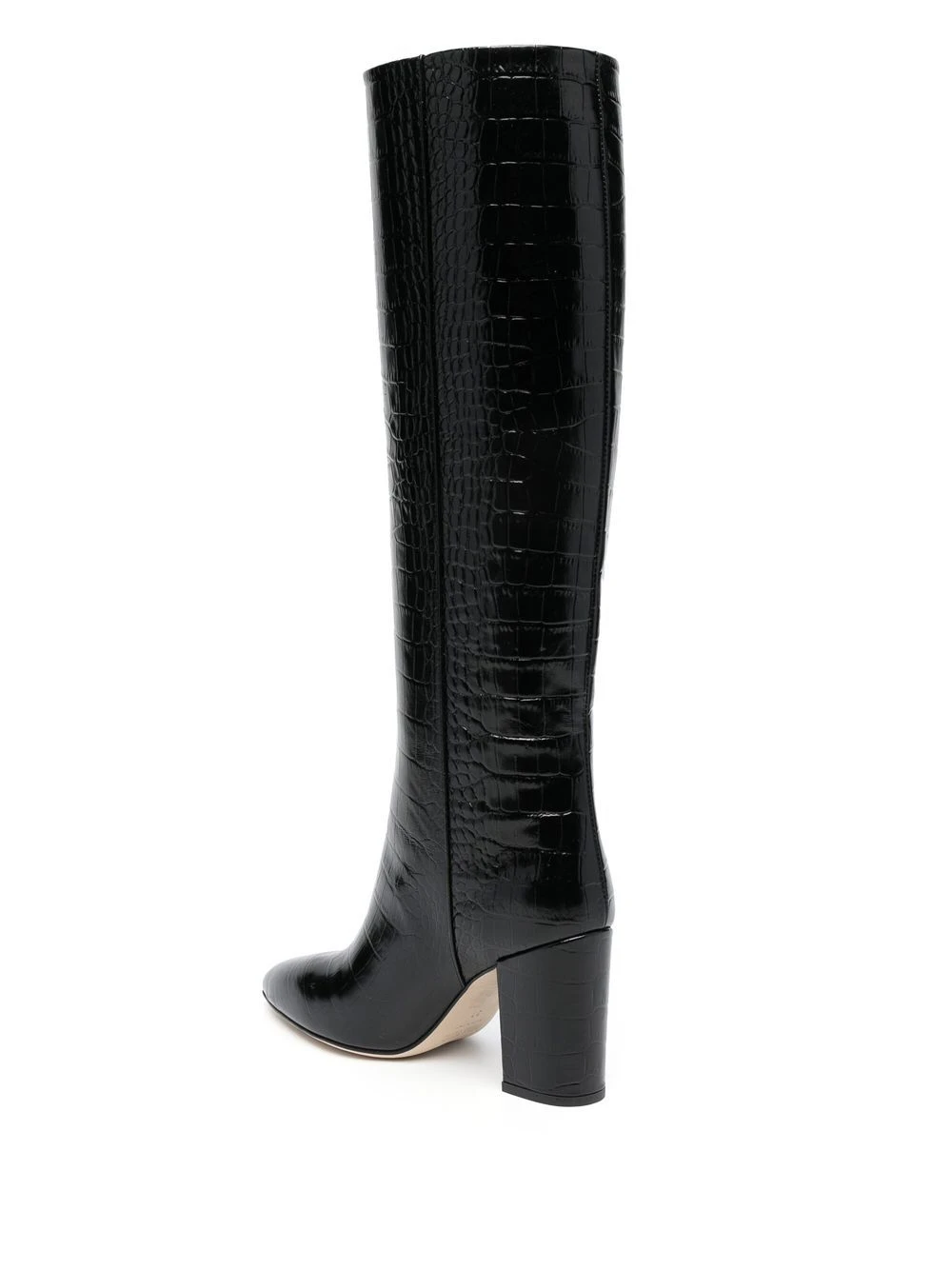 Noir, cuir de veau, effet peau de crocodile, bout pointu, hauteur genou, talon haut épais.