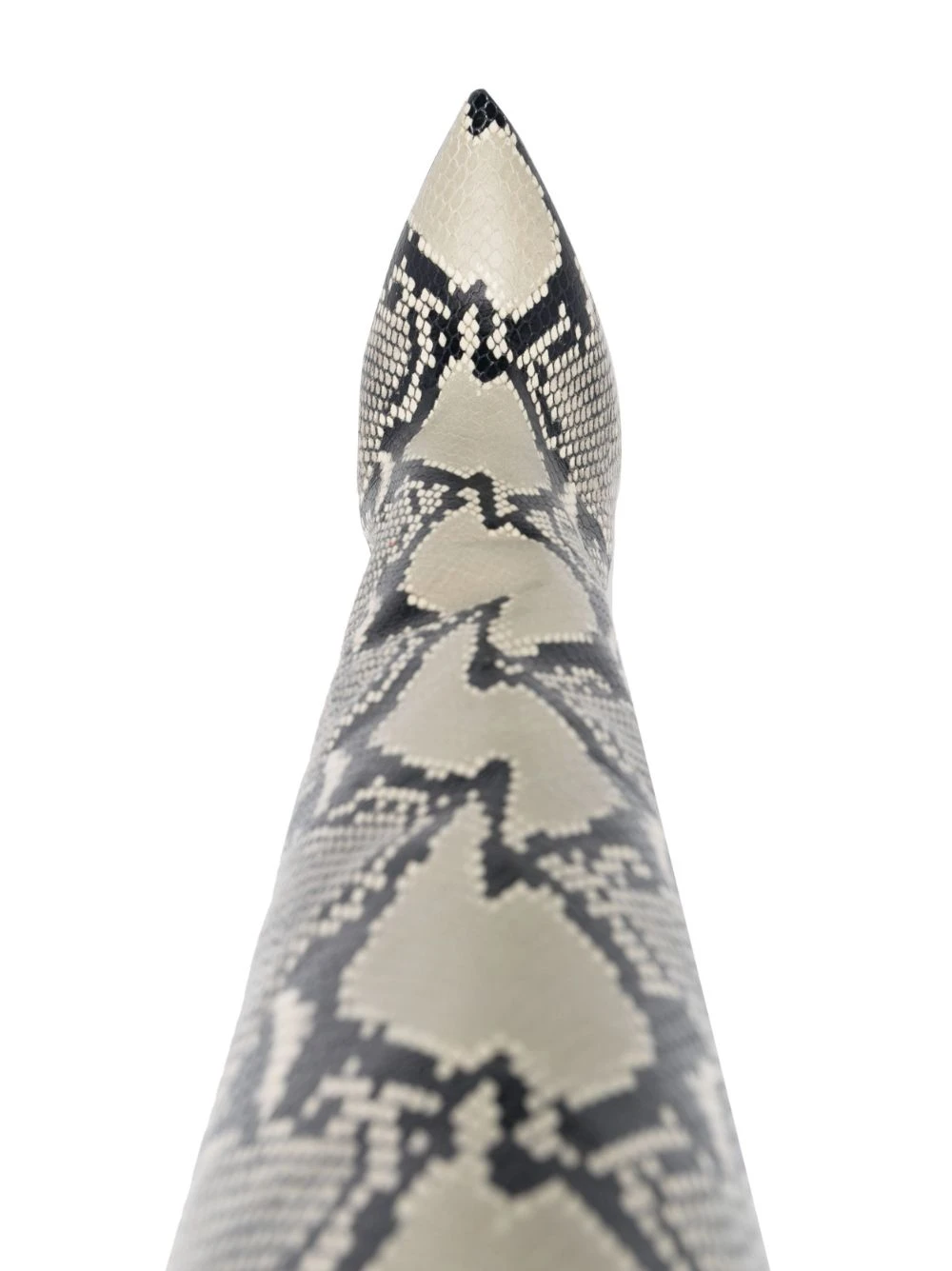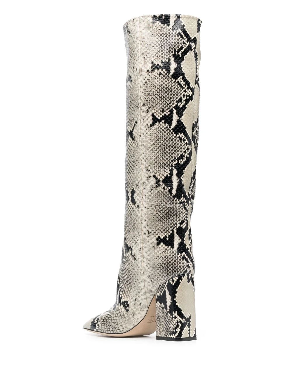Beige, cuir de veau, imprimé python, bout pointu, talon haut épais, hauteur genou, semelle intérieure à logo.
