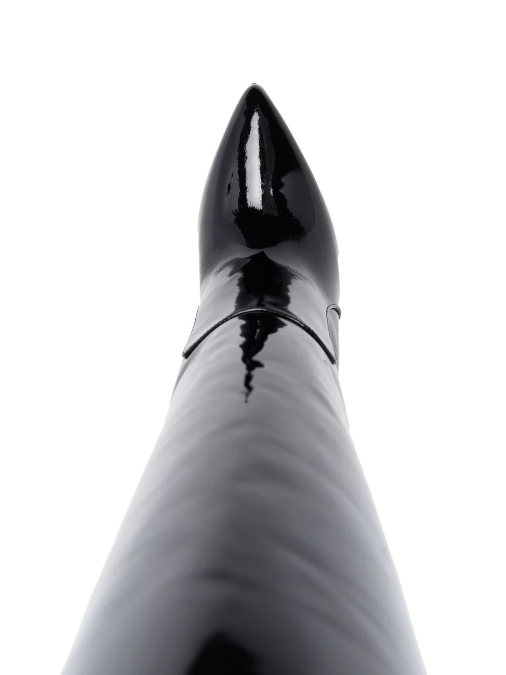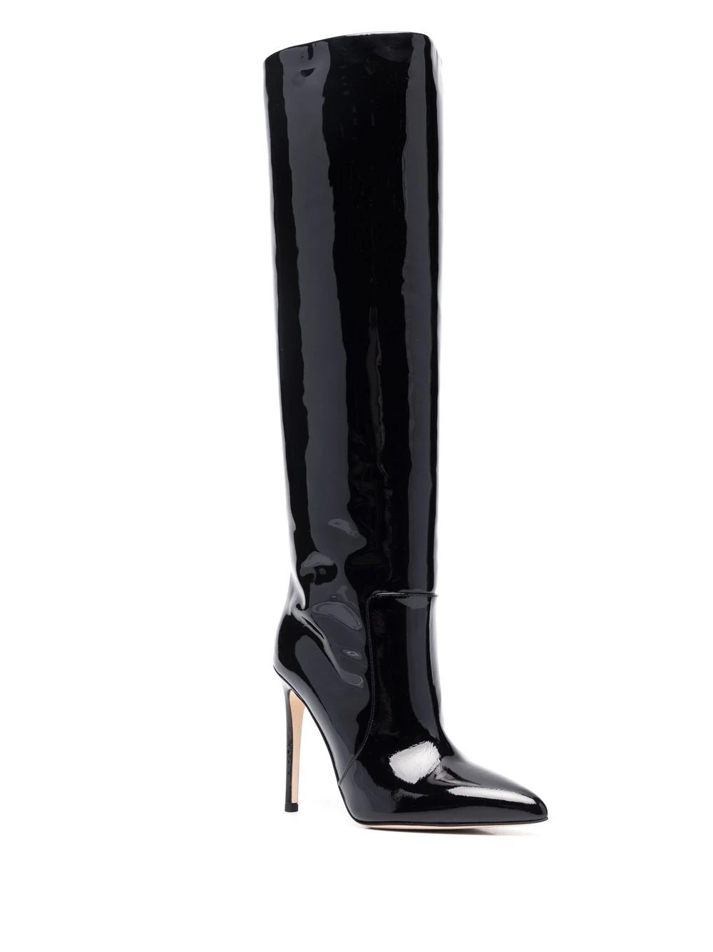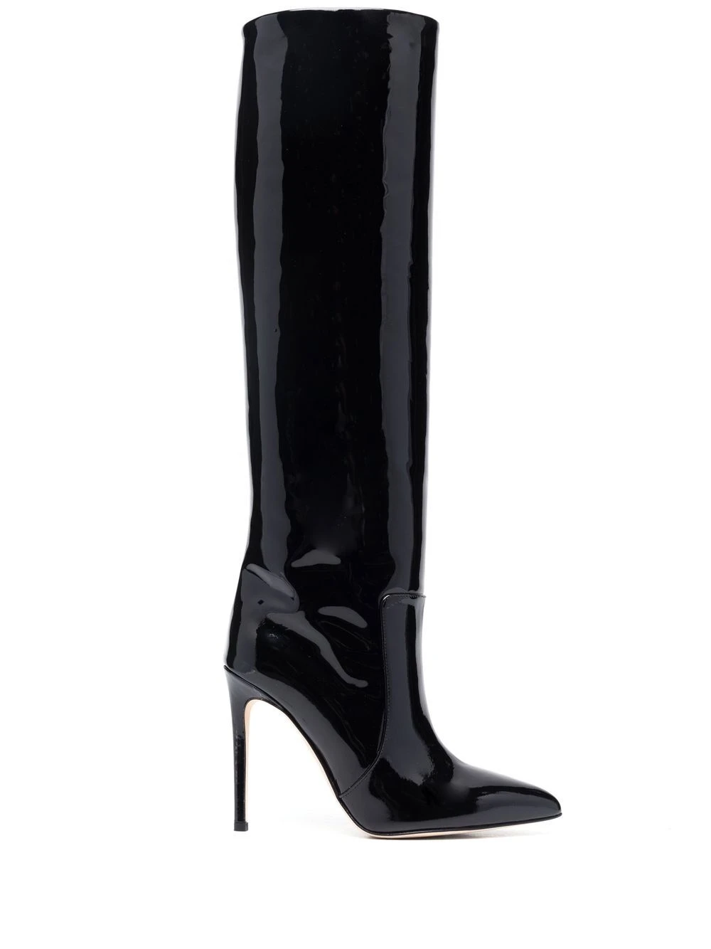 Noir, cuir de veau, fini verni, bout pointu, design à enfiler, hauteur genou, contrefort à logo, talon aiguille haut.