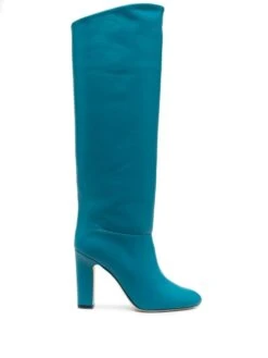 Bleu sarcelle, cuir de veau, hauteur genou, à enfiler, bout en amande, talon haut épais.