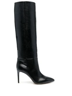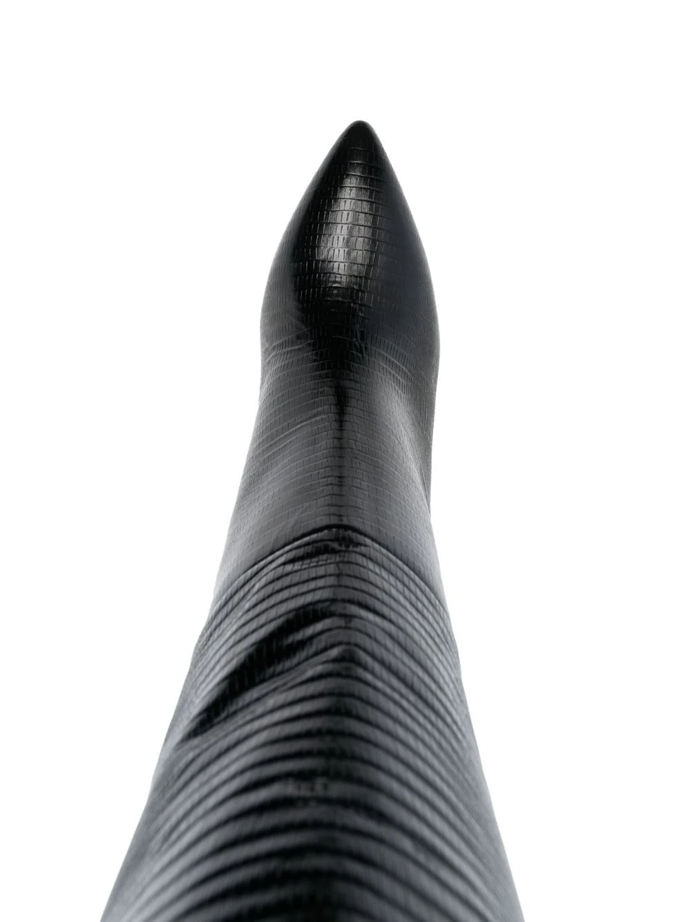 Noir, cuir de veau, effet peau de crocodile, bout pointu, hauteur genou, talon aiguille haut.