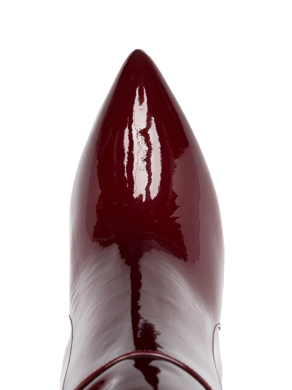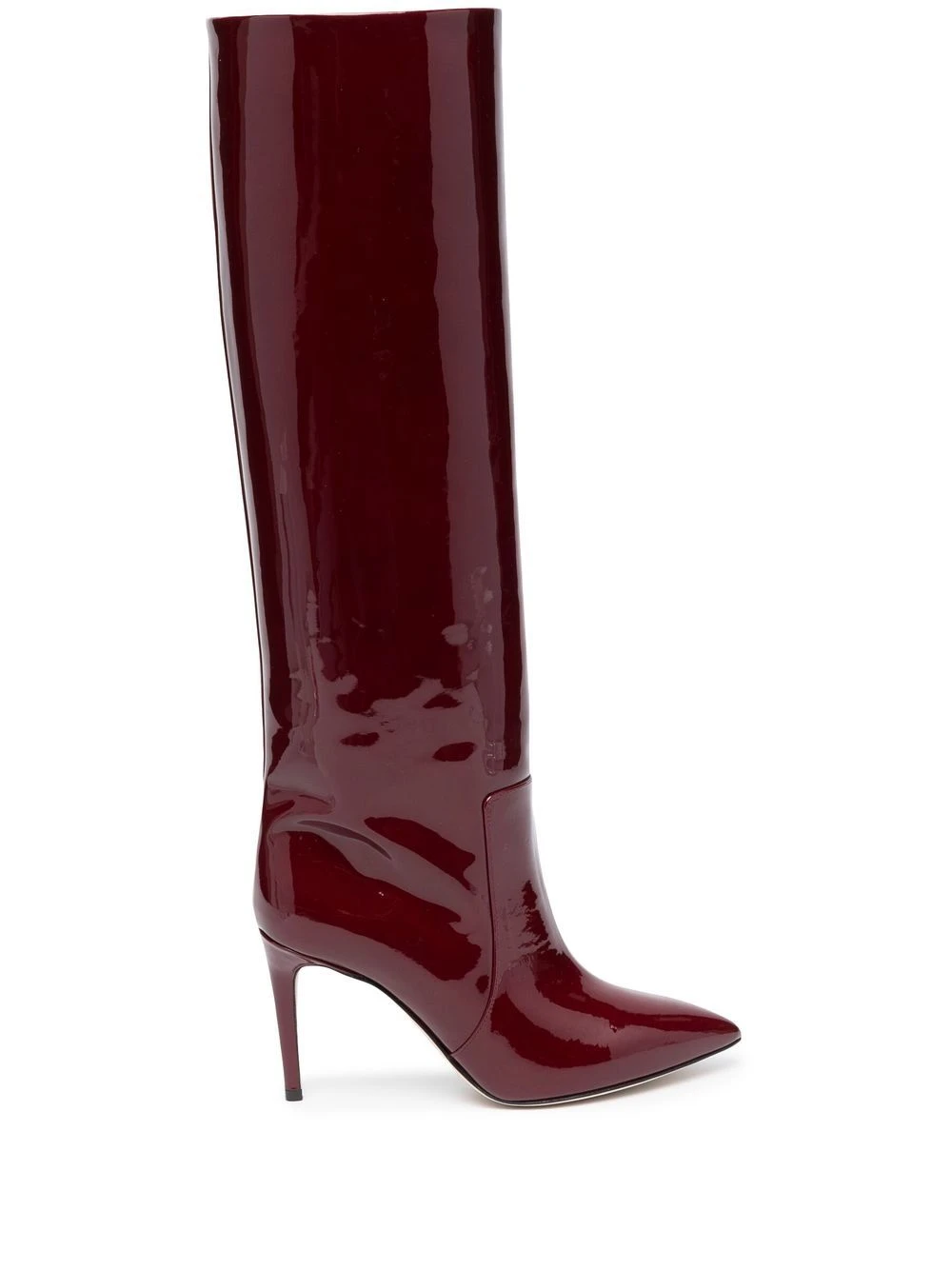 Bordeaux, cuir de veau, fini verni, bout pointu, à enfiler, hauteur genou, talon aiguille haut.
