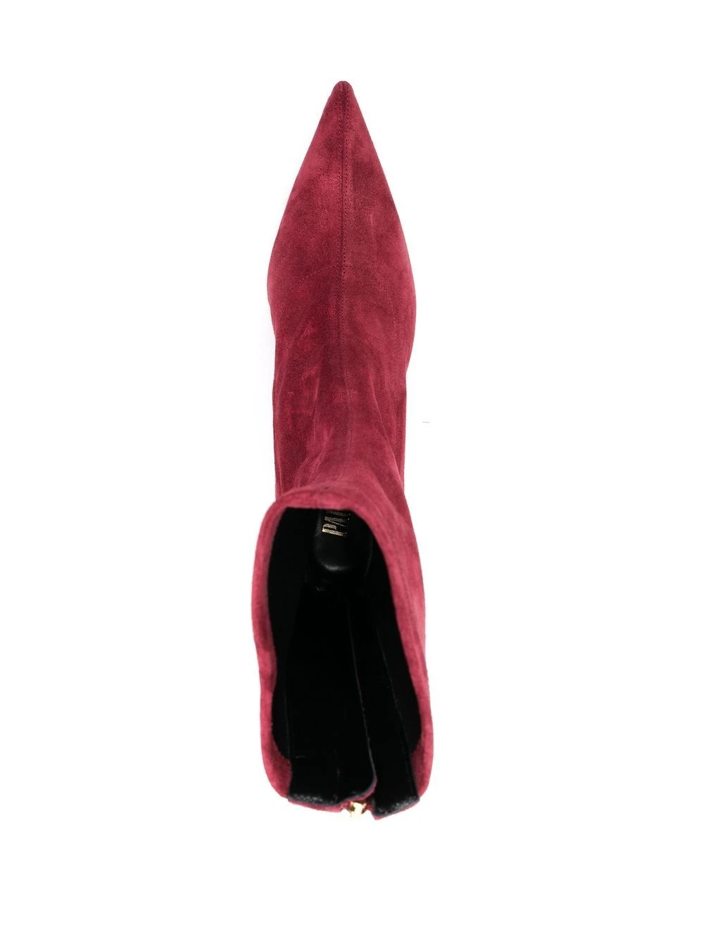 Rouge sang, veau velours, bout pointu, cheville style chaussette, fermeture zippée sur les côtés, talon aiguille, hauteur : 14 cm.