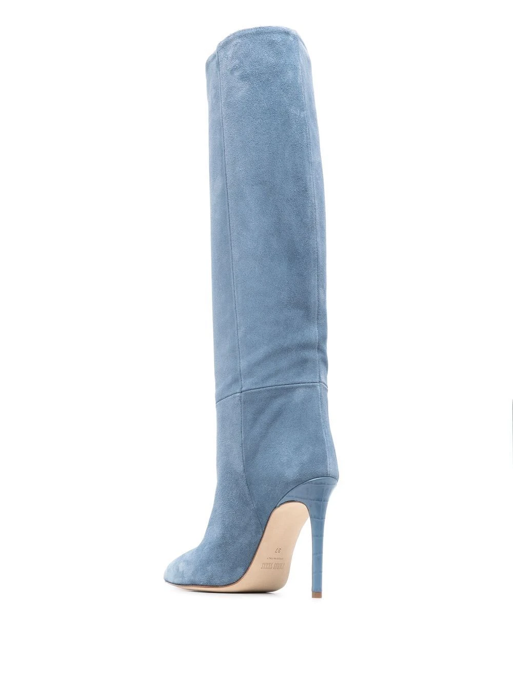 Bleu clair, cuir de veau, bout pointu, talon haut, longueur mollet, à enfiler.
