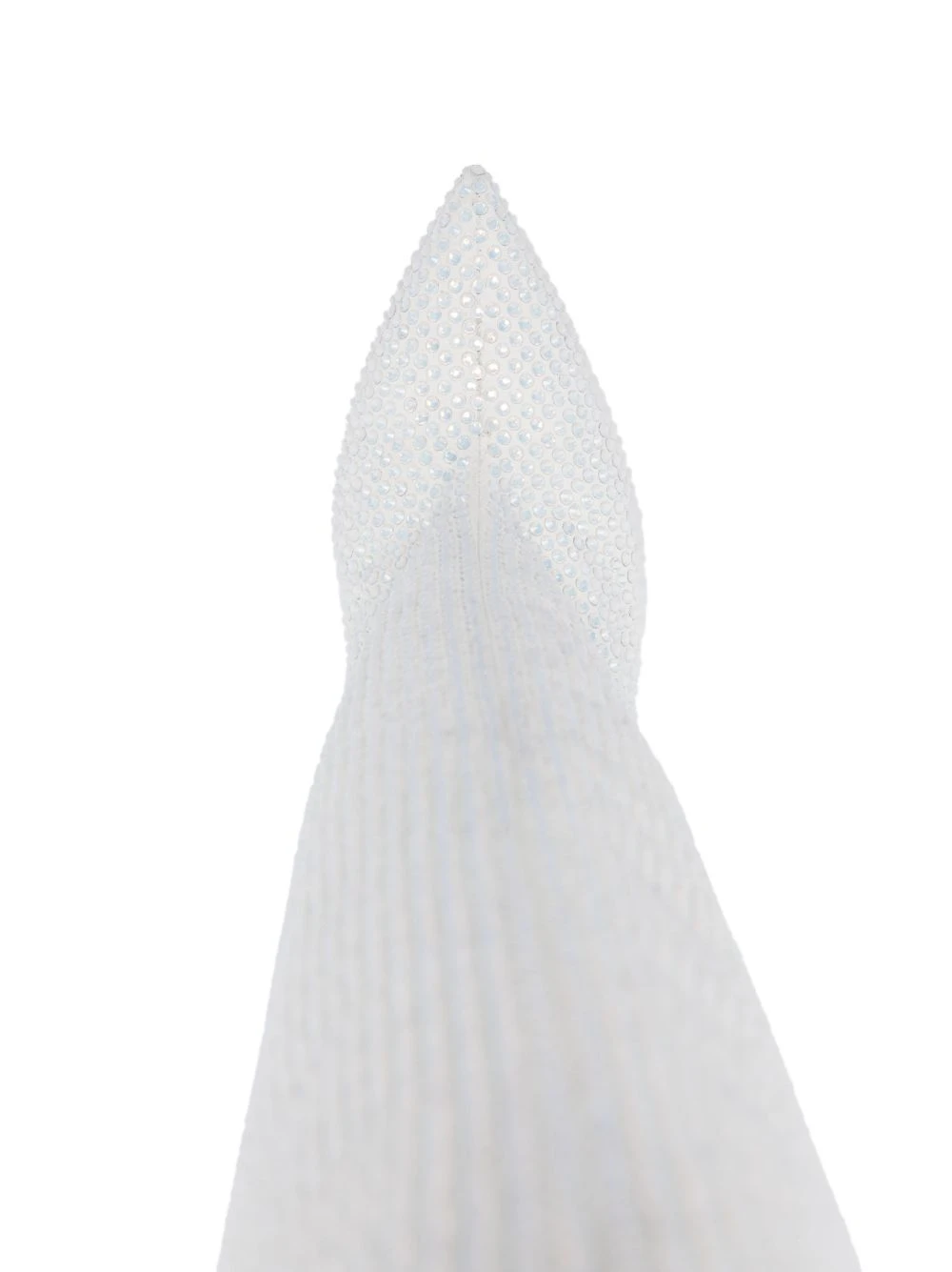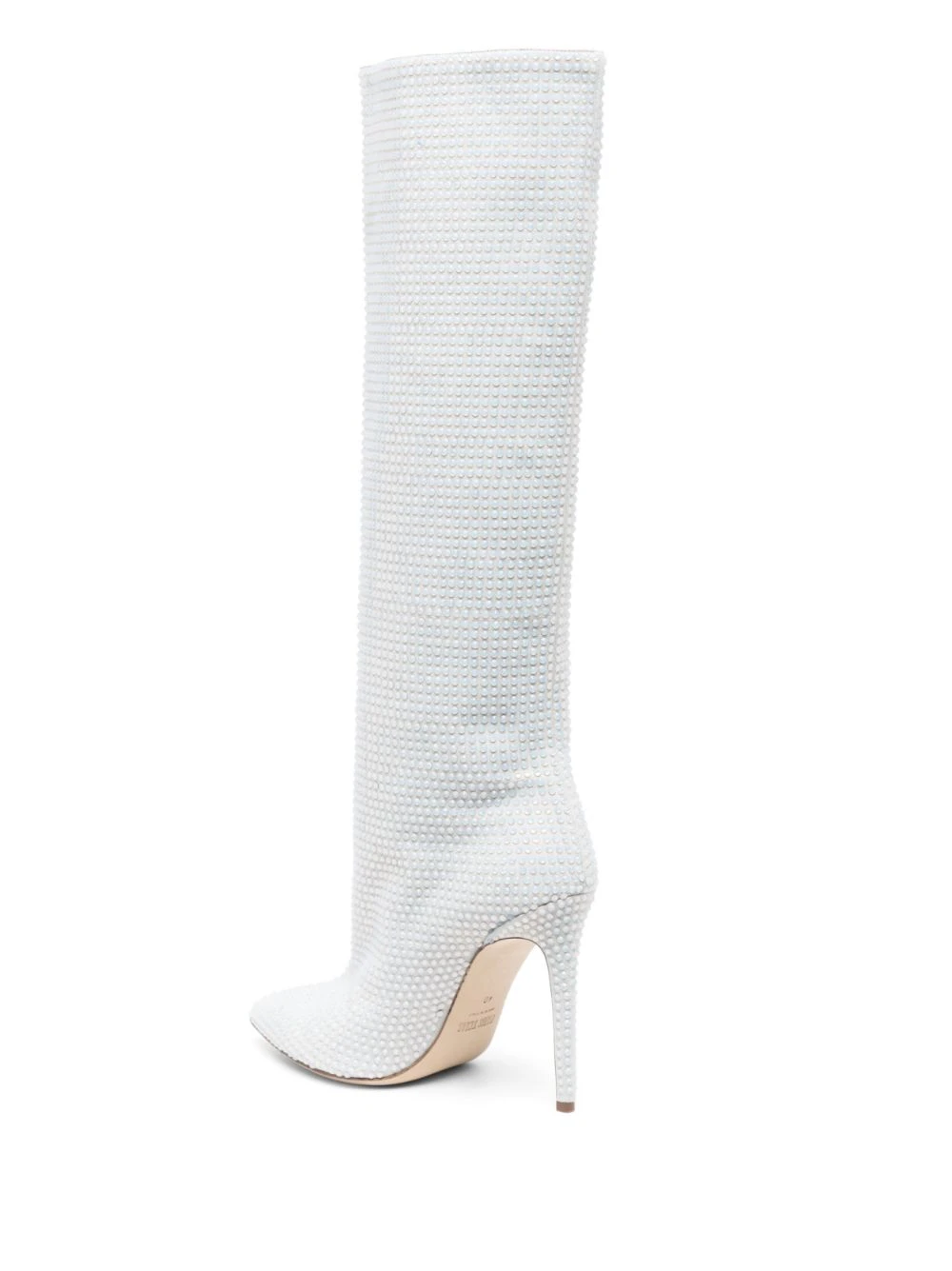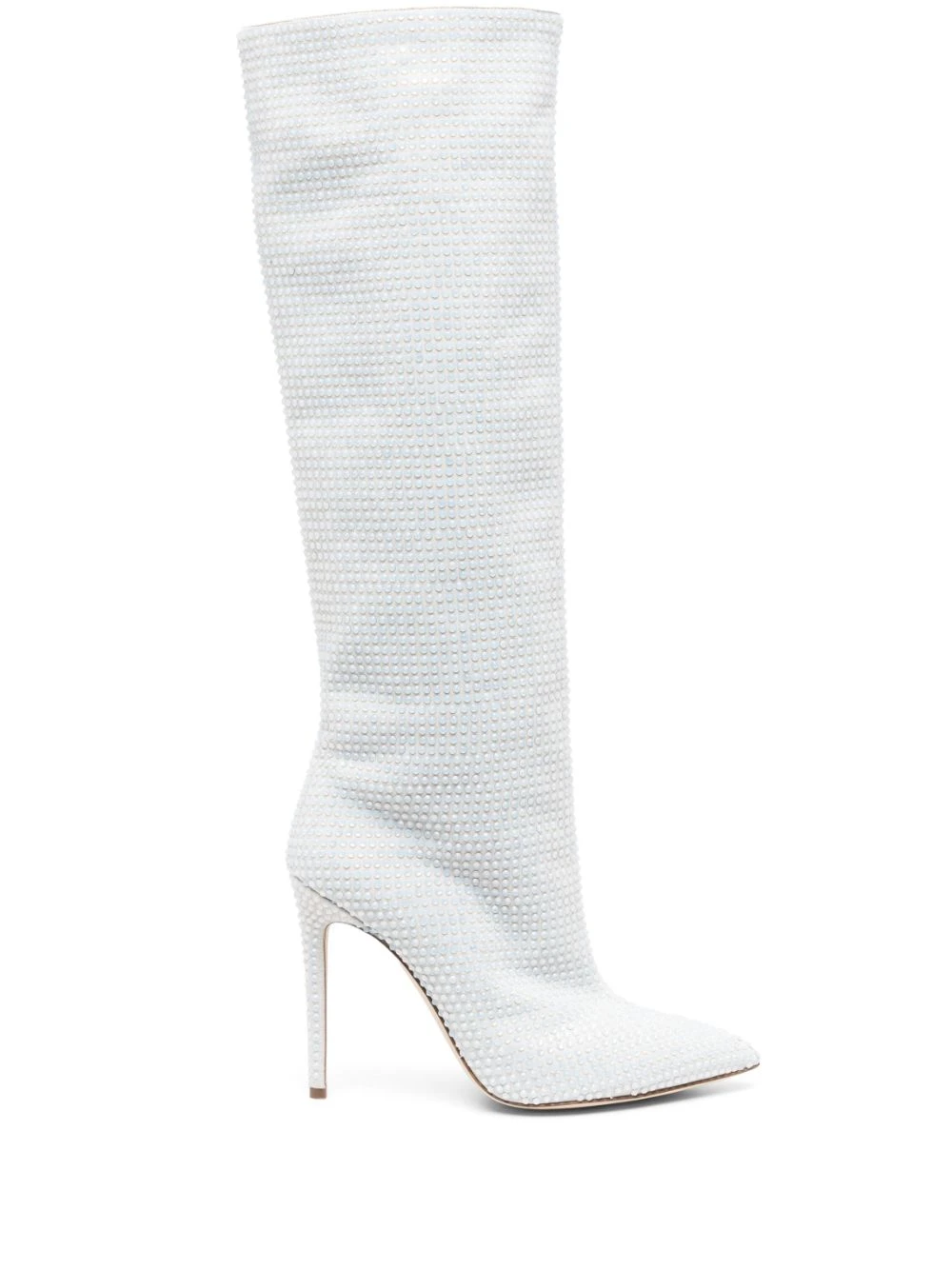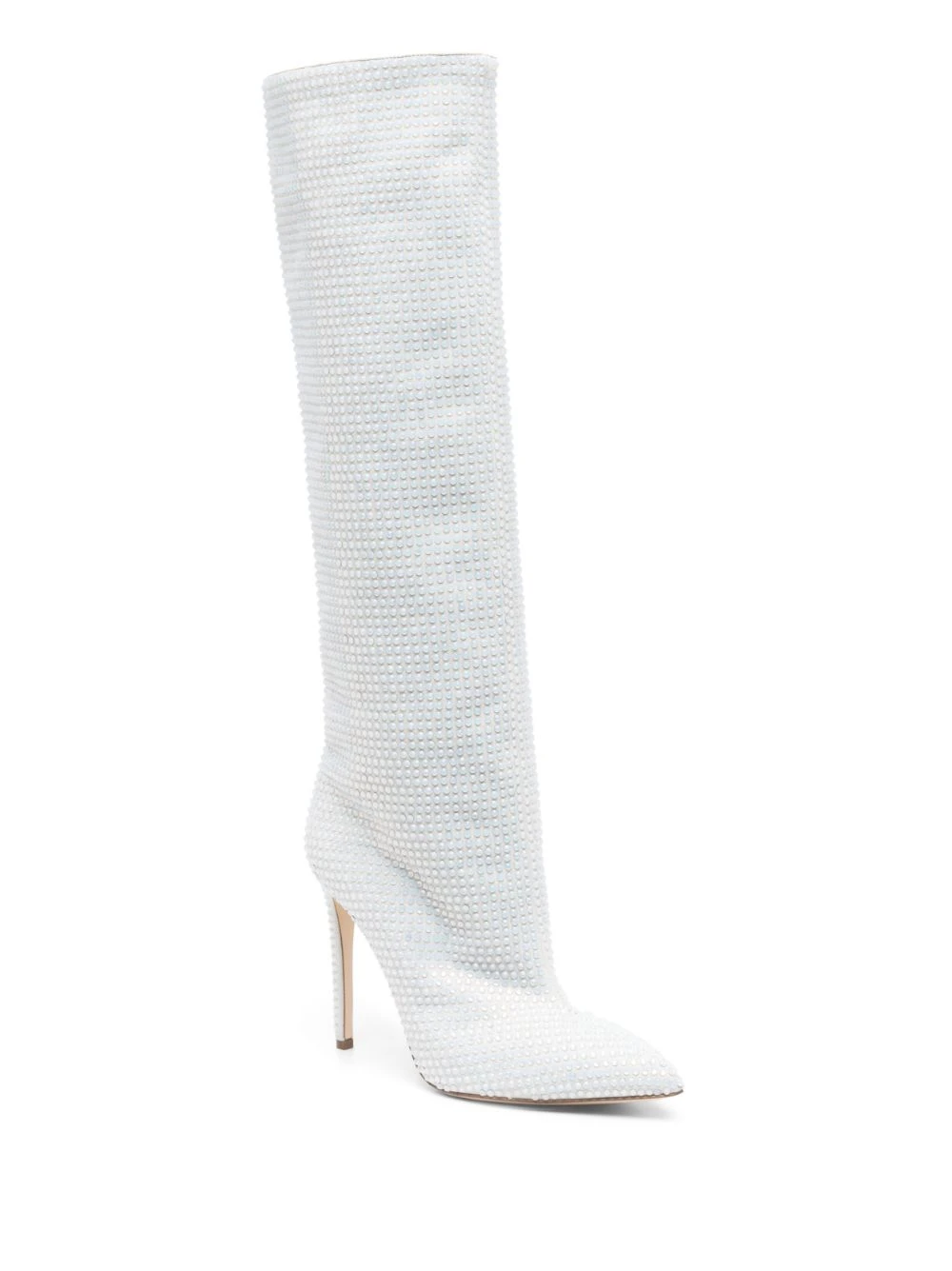 Blanc, cuir de veau, ornement en cristal, bout pointu, hauteur genou, talon aiguille haut, design à enfiler.