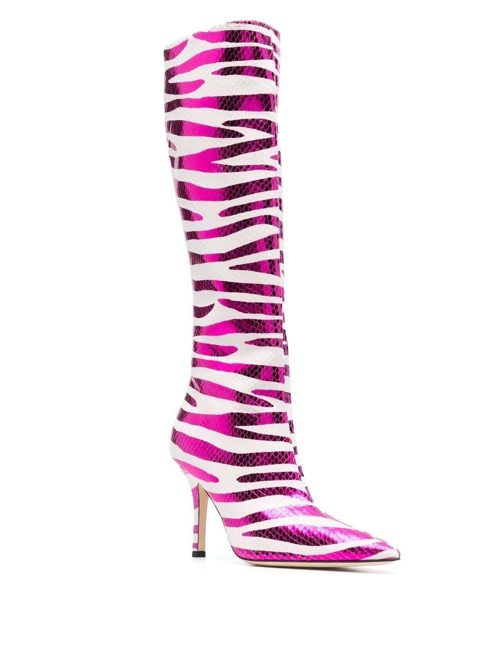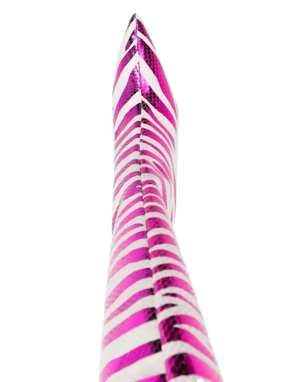 Rose, blanc, cuir, effet peau de serpent, fini métallisé, imprimé zèbre, bout pointu, fermeture zippée à l’arrière, talon haut, hauteur genou.