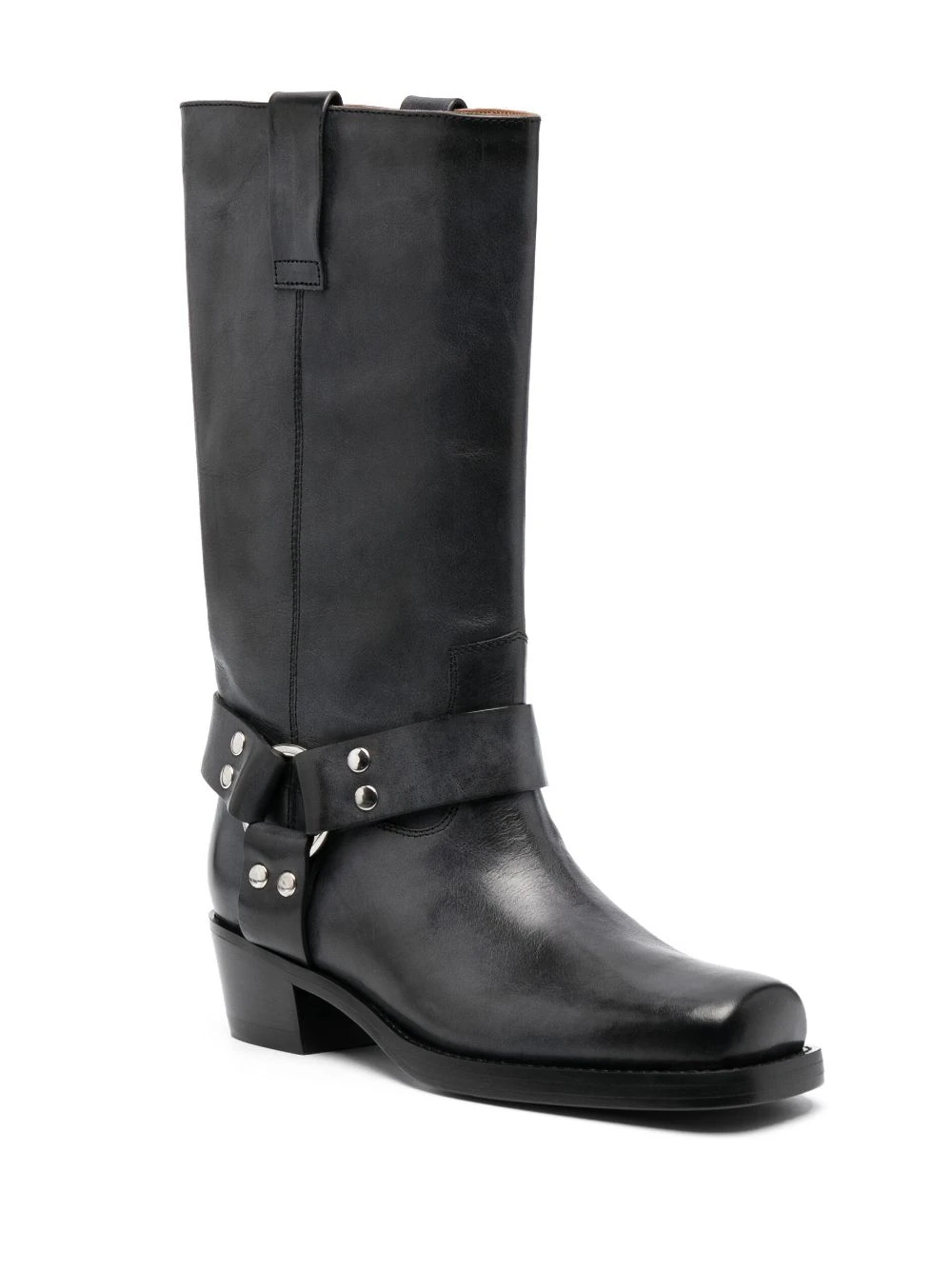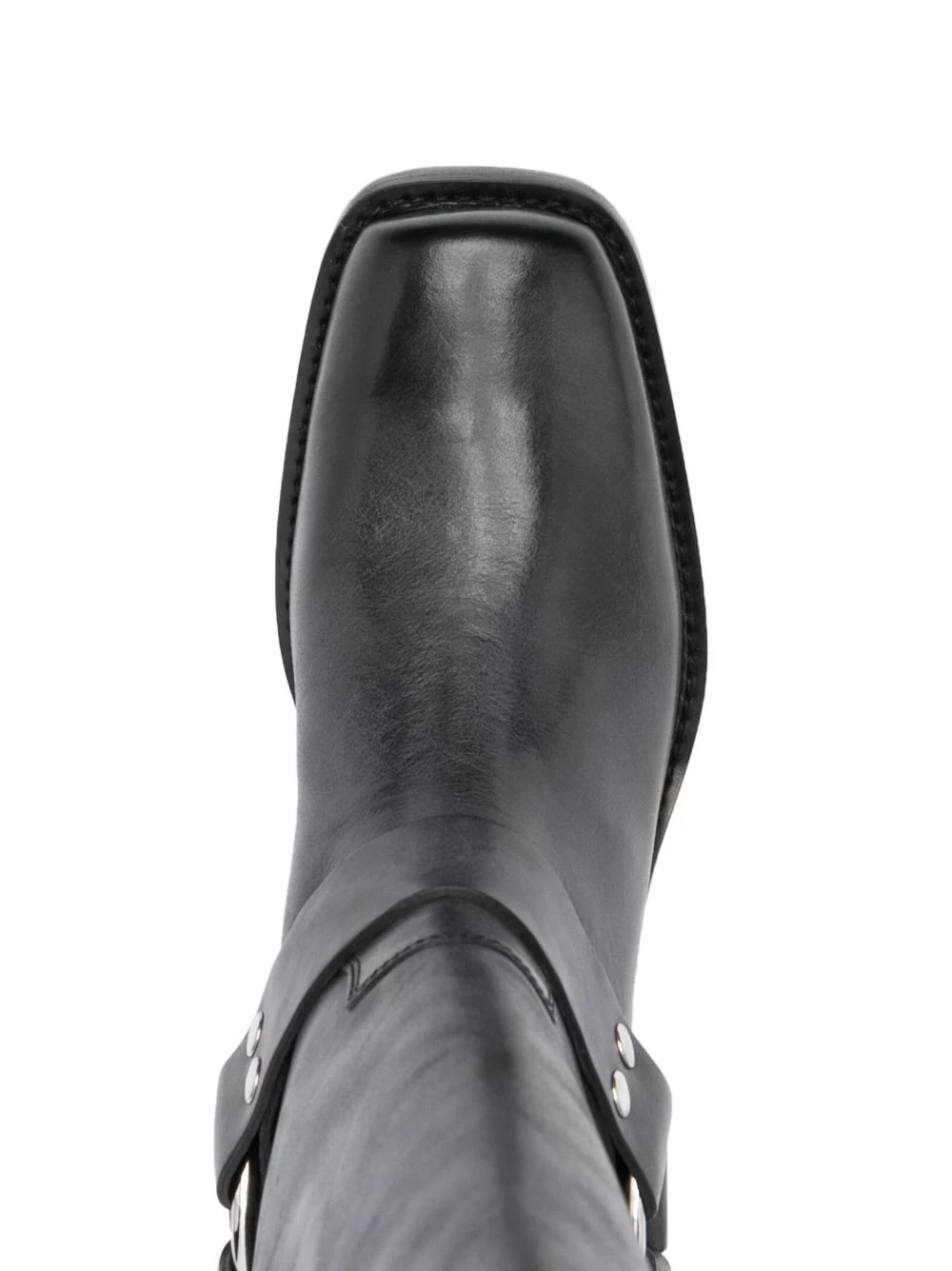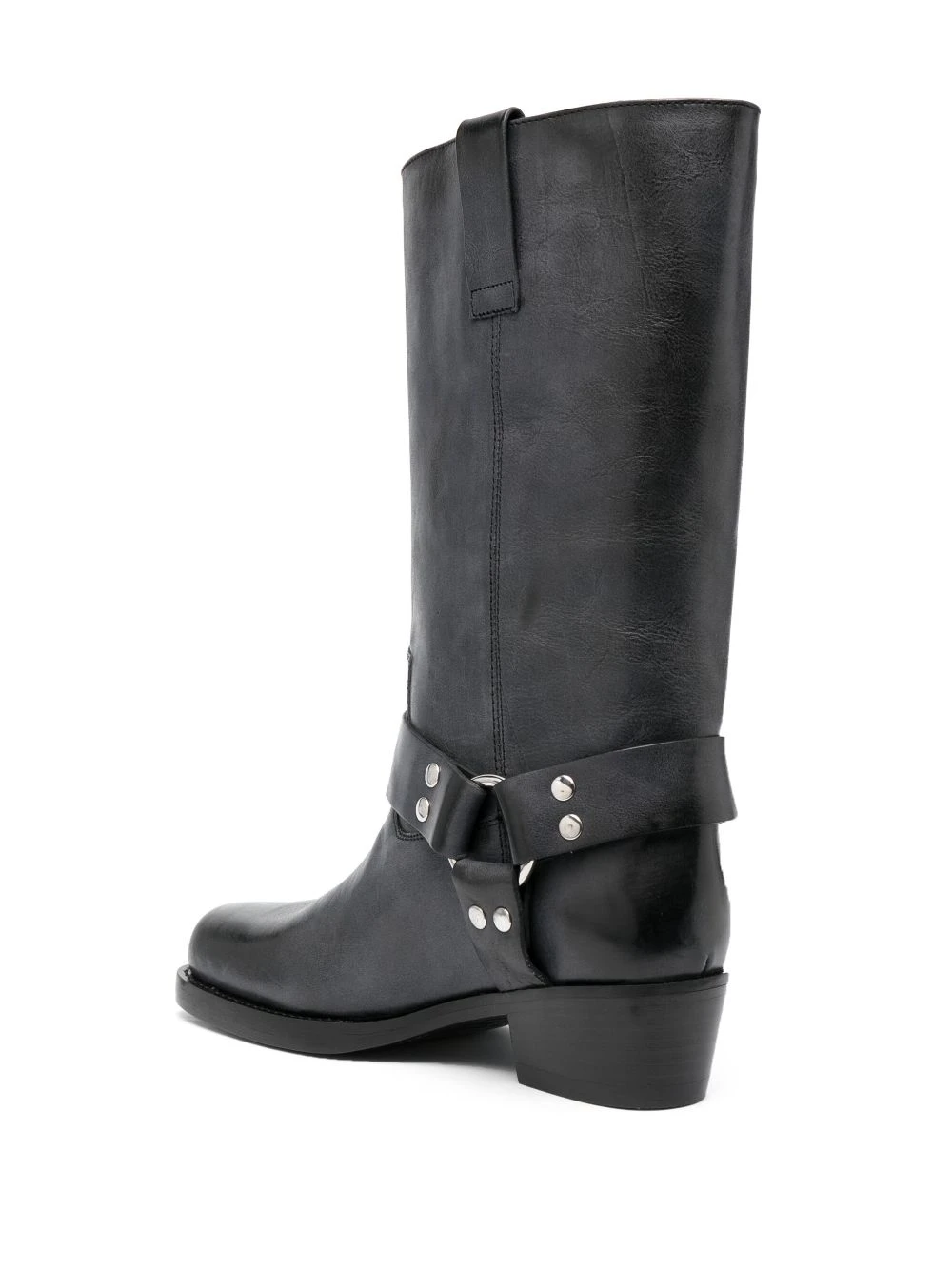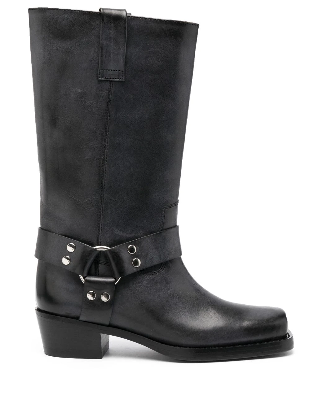 Noir, cuir de veau, grain lisse, bride cheville, détails de clous argentés, anneau métallique, détails de fronces, ouverture à double languette, bout carré, design à enfiler, hauteur genou, petit talon épais.