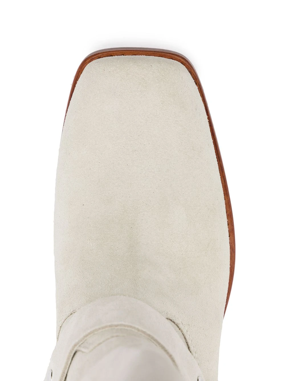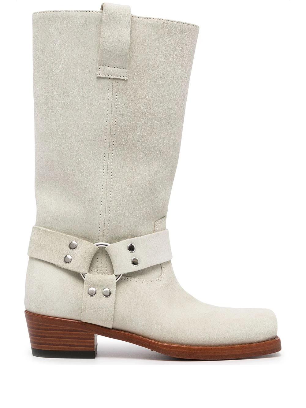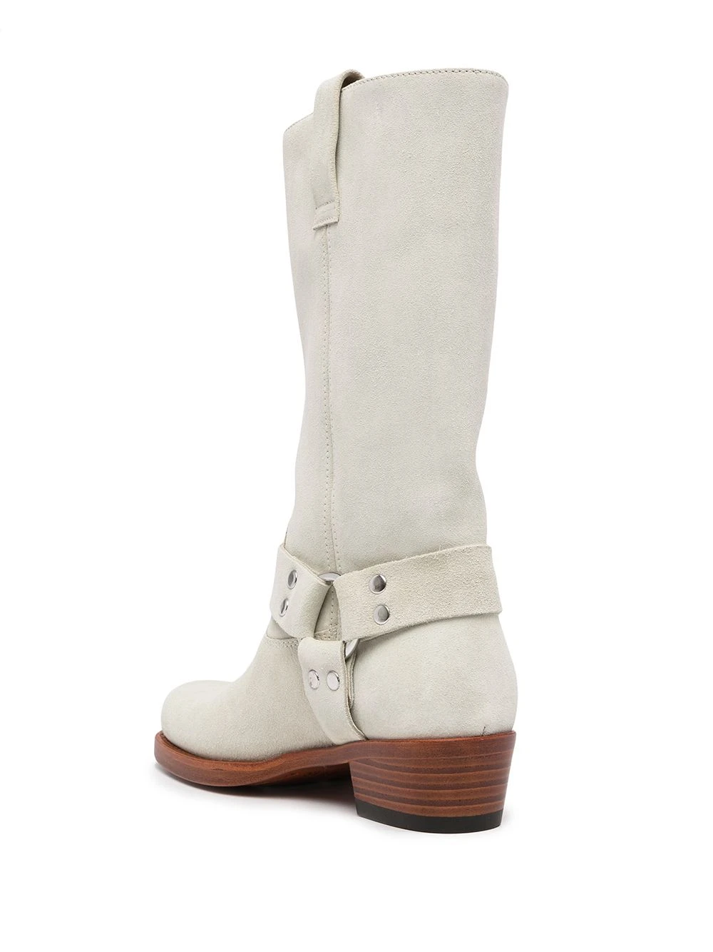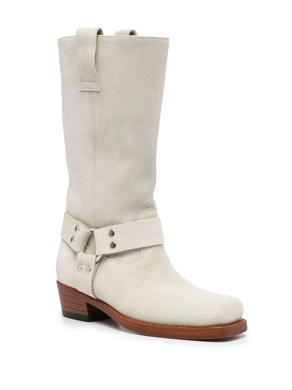 Ouverture à double languette, détails de brides, petit talon bottier, bout carré, longueur midi, à enfiler. Matière : chèvre velours.