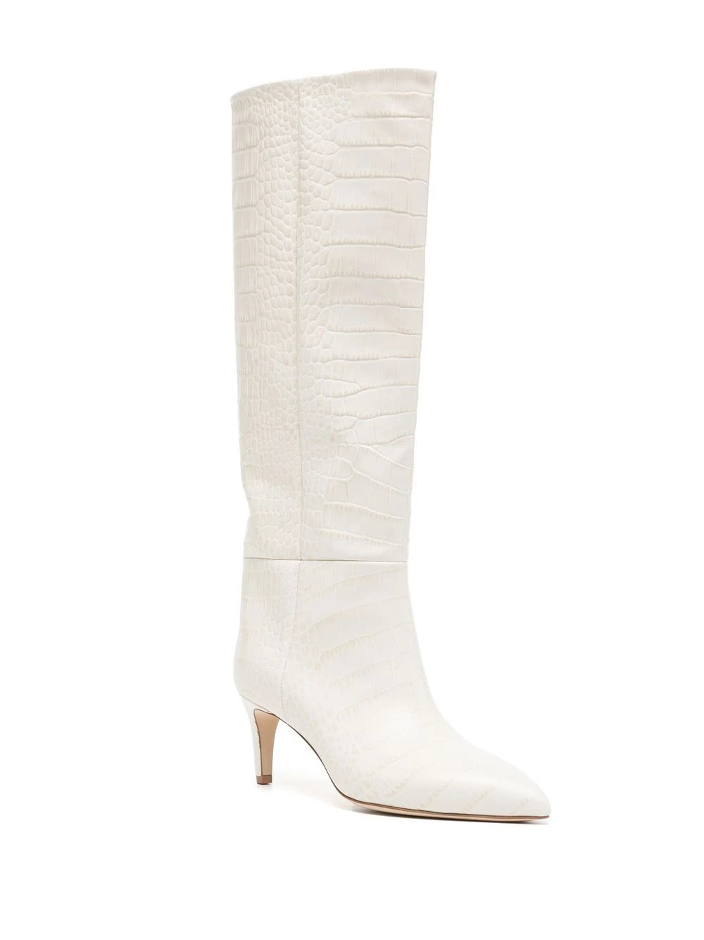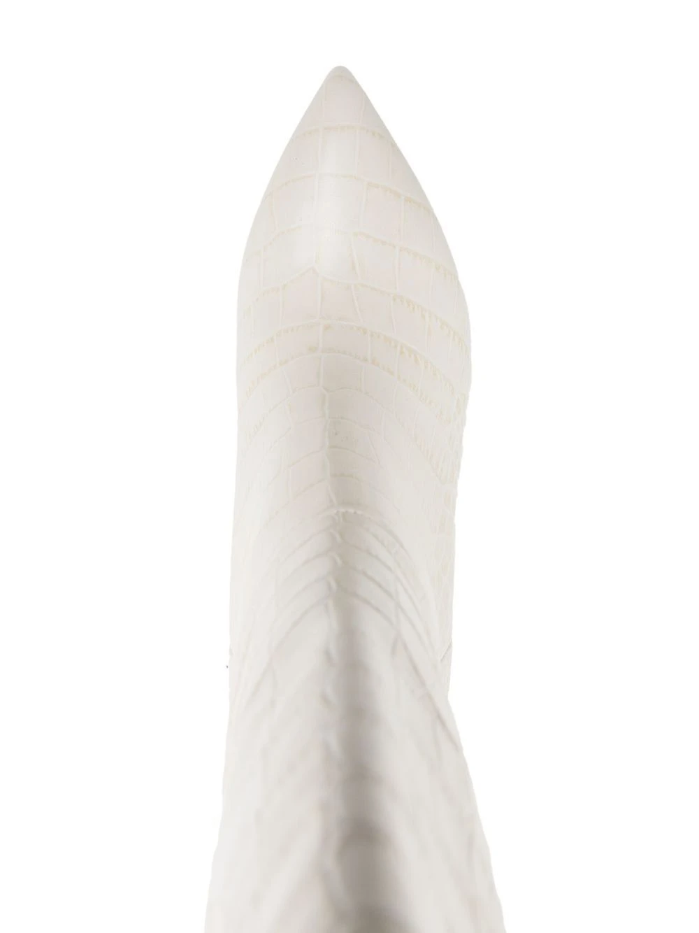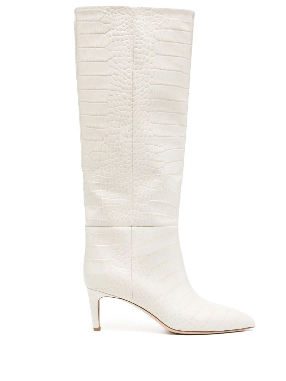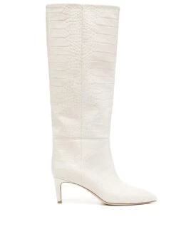 Blanc cassé, effet peau de crocodile, cuir, hauteur genou, bout pointu, talon aiguille.