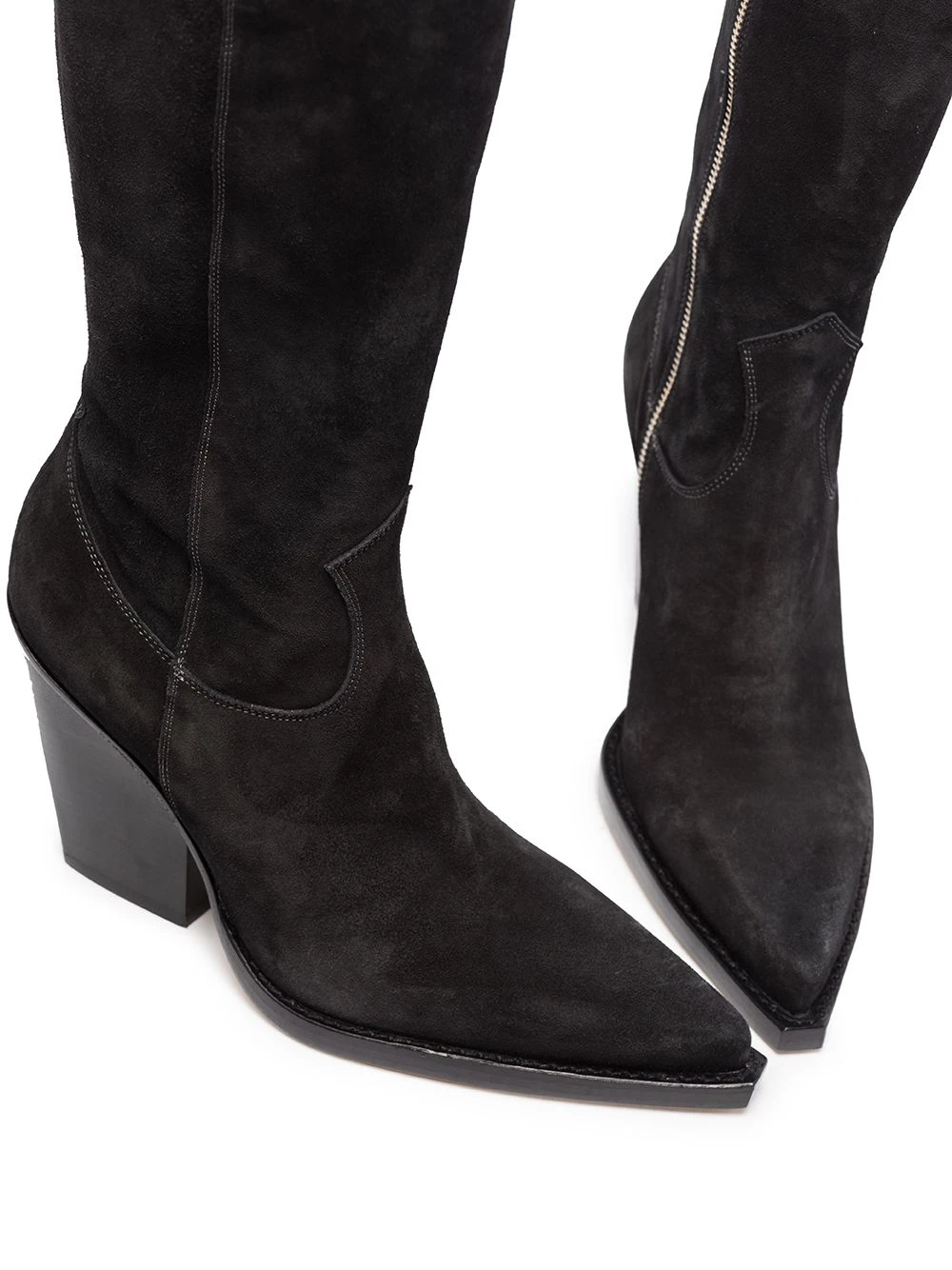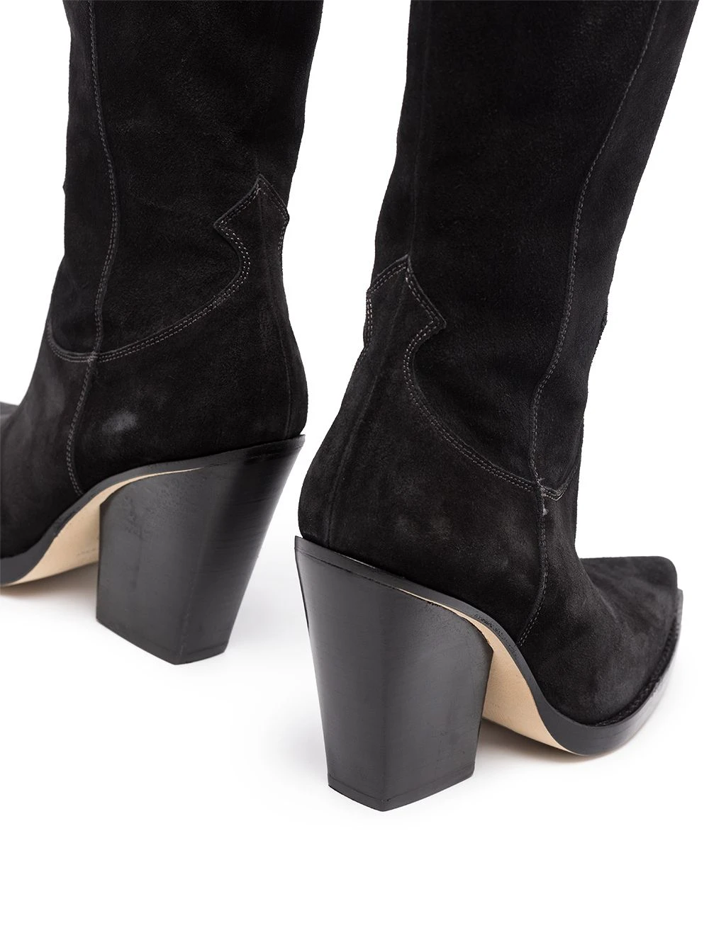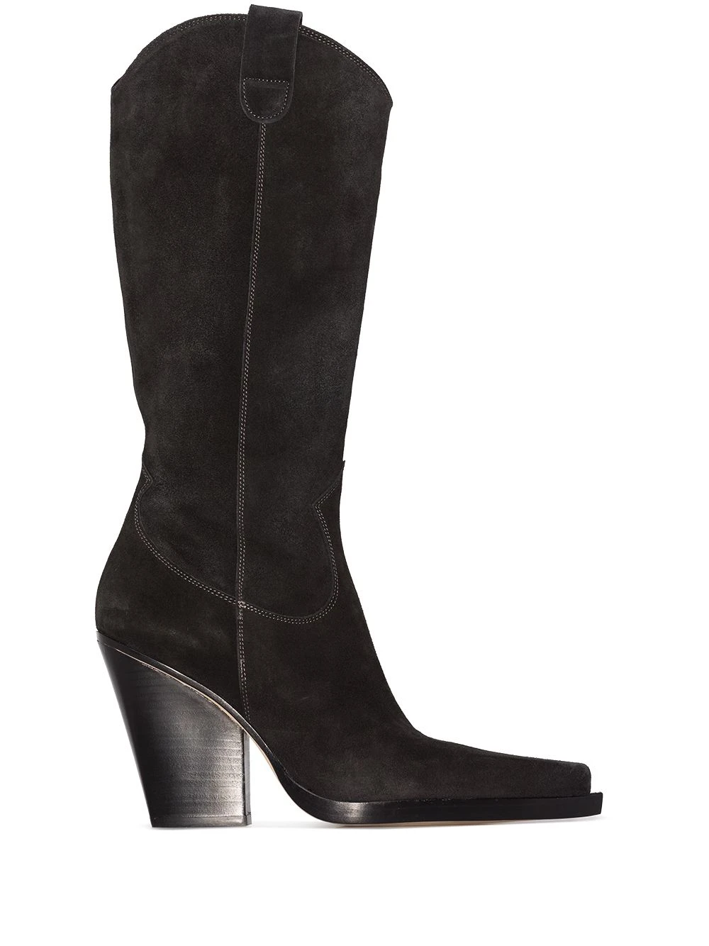 Bout pointu, design à empiècements, coutures contrastantes, ouverture à double languette, design à enfiler, talon haut épais. Couleur : noir. Matière : daim.