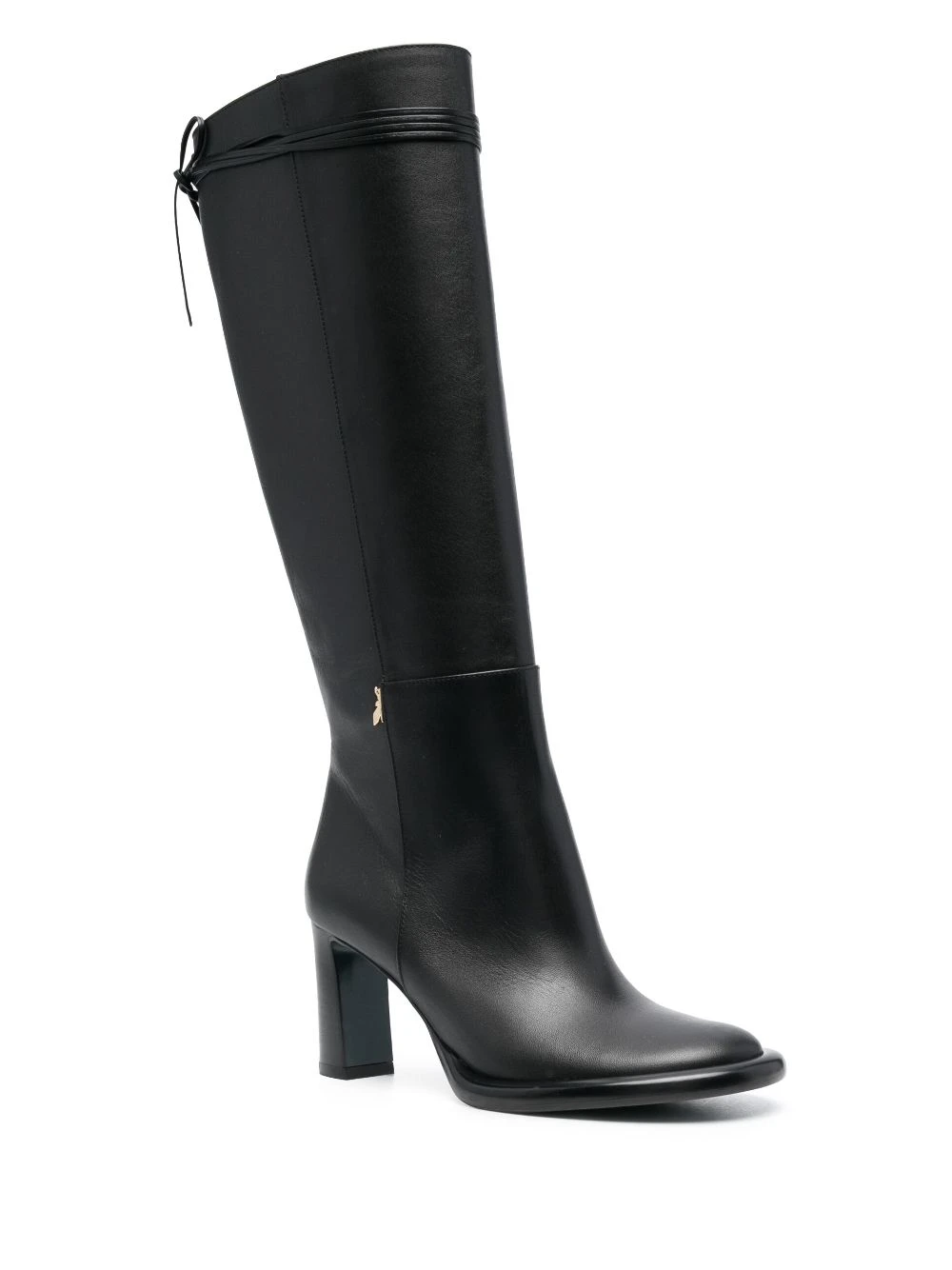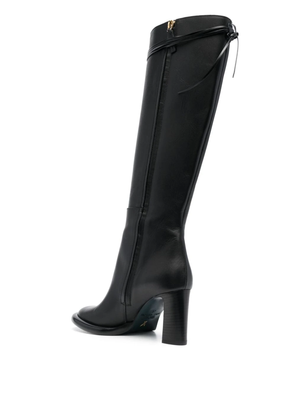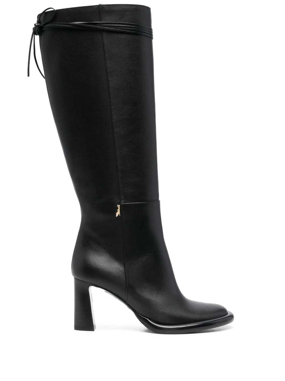 Noir, cuir de veau, plaque logo dorée, détails de brides, coutures ton sur ton, bout rond, fermeture zippée sur le côté, hauteur genou, talon mi-haut épais.