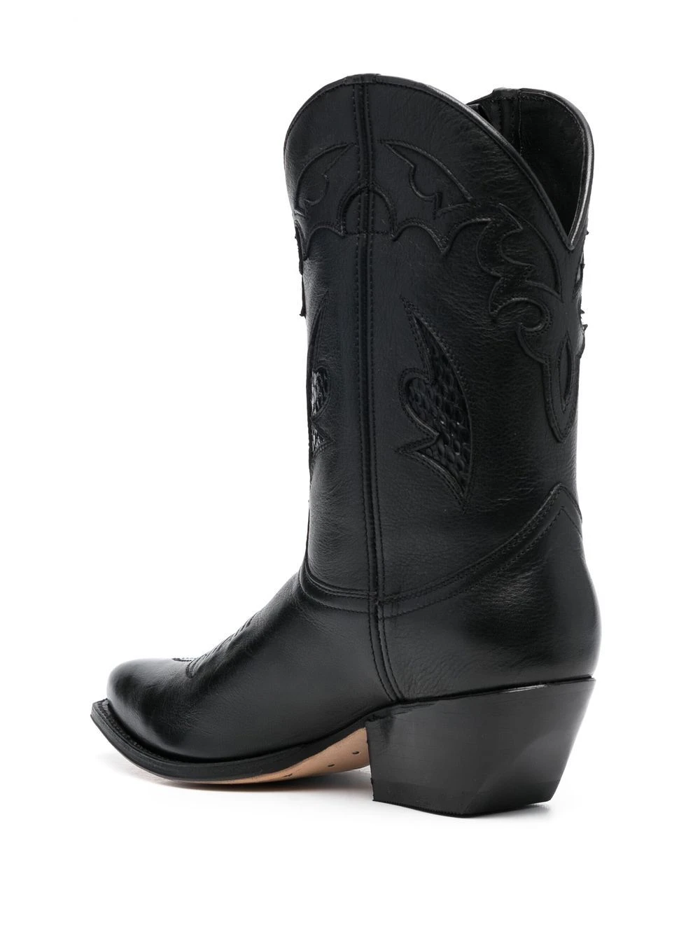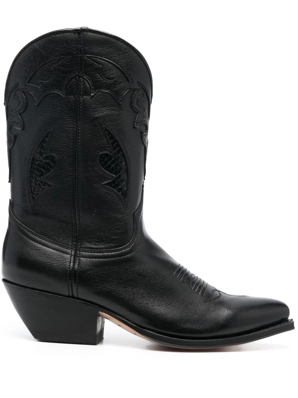 Noir, cuir de veau, couture décorative, bout pointu, talon cubain, à enfiler.