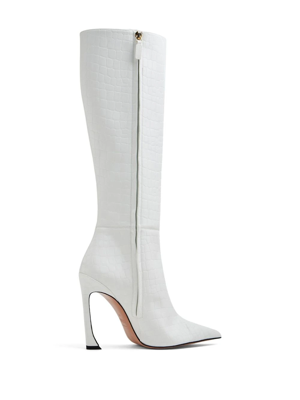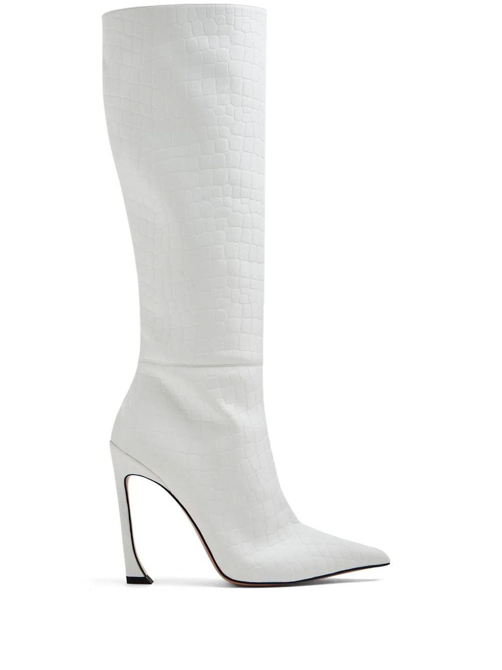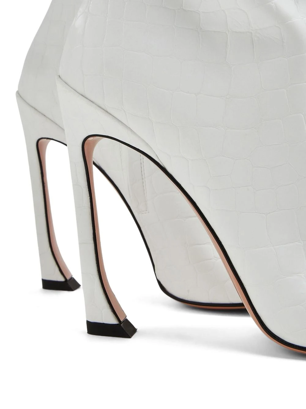 Blanc, cuir artificiel, effet peau de crocodile, bout pointu, fermeture zippée sur le côté, semelle intérieure griffée, semelle en cuir artificiel.