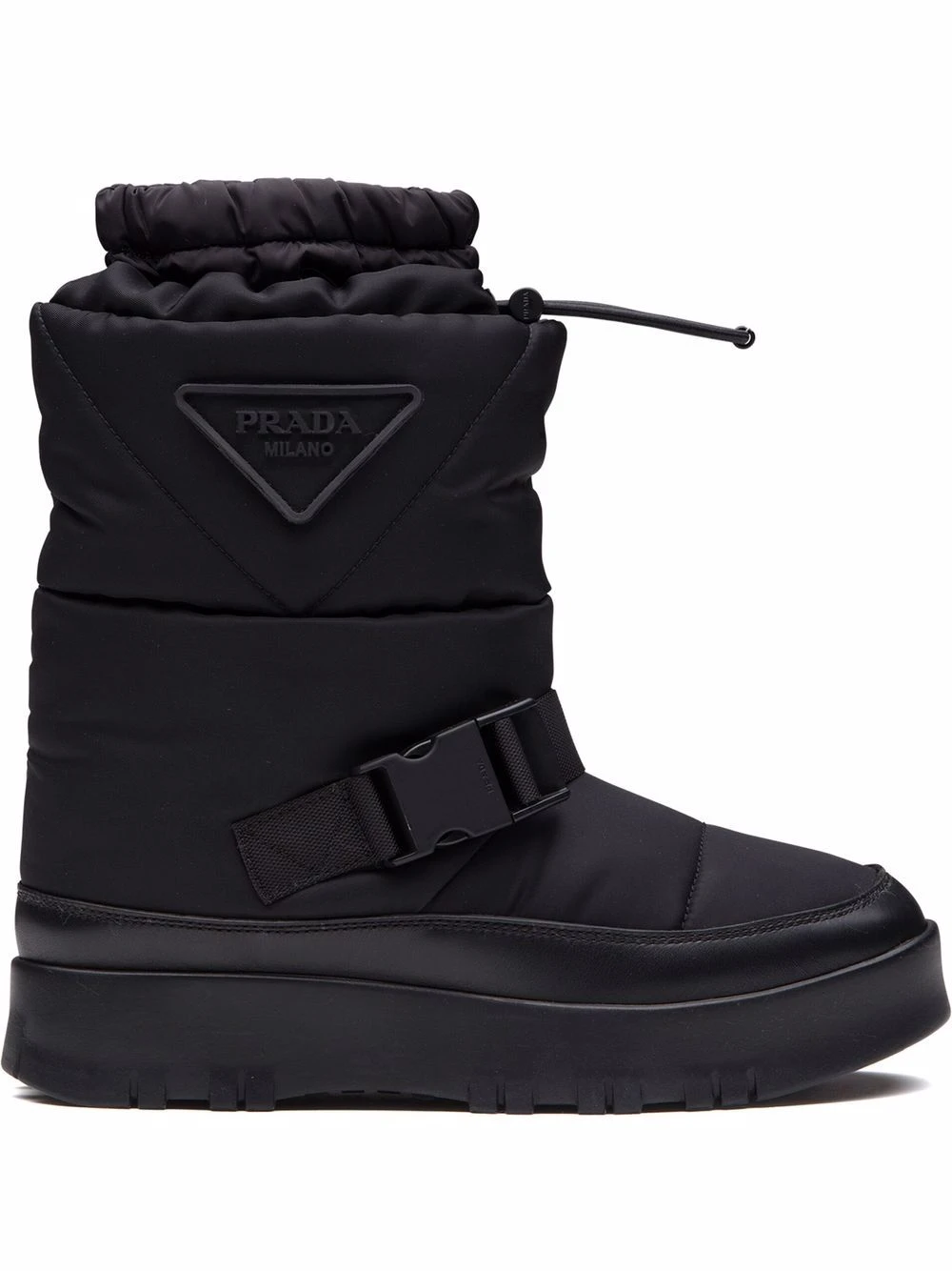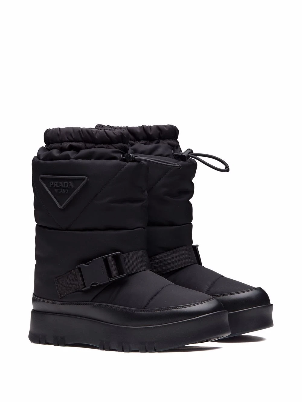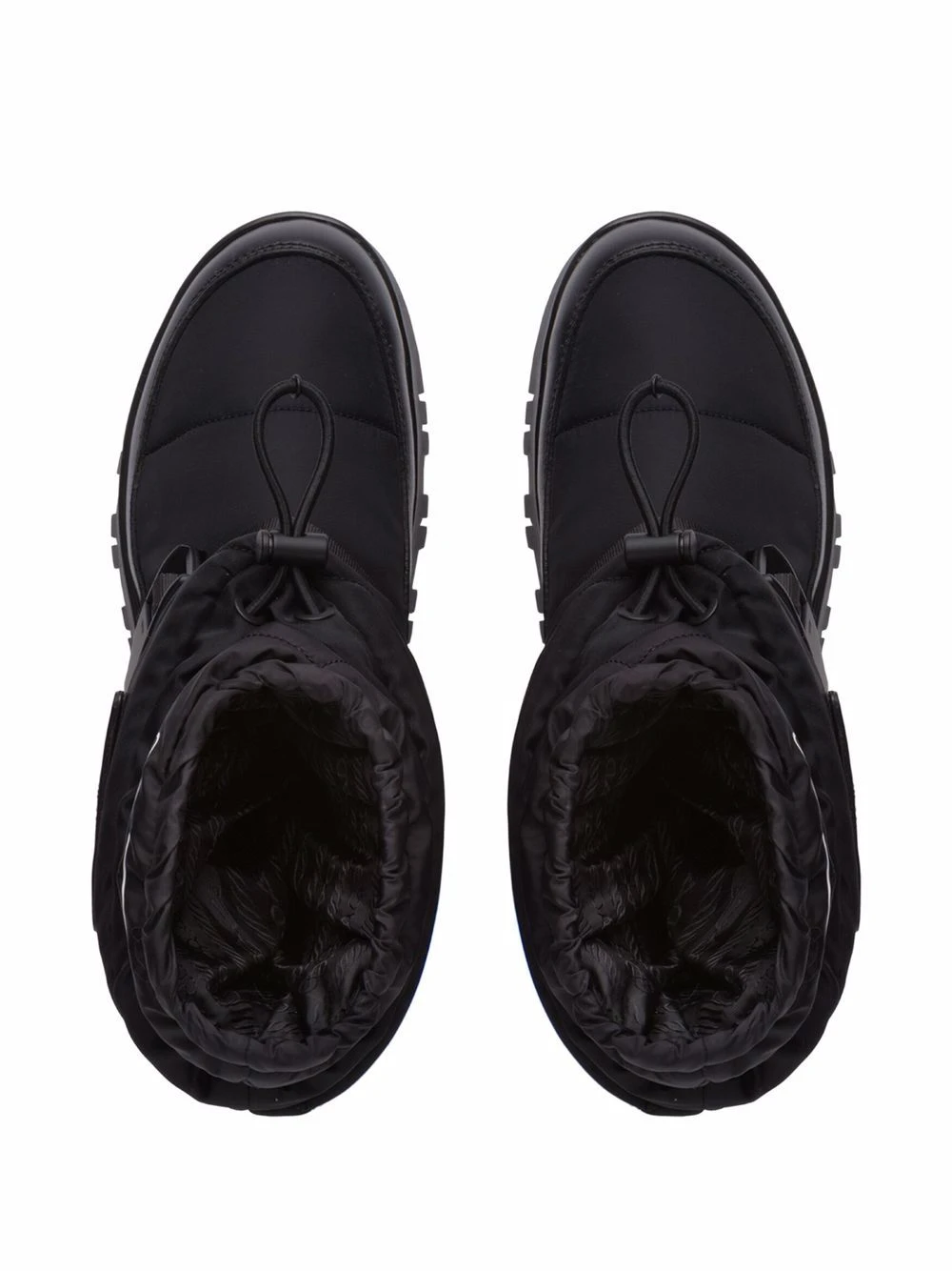 Armure gabardine, étanche, design matelassé, patch logo sur le côté, lien de resserrage, fermeture à lanière à boucle, bout rond, semelle en caoutchouc. Couleur : noir.
