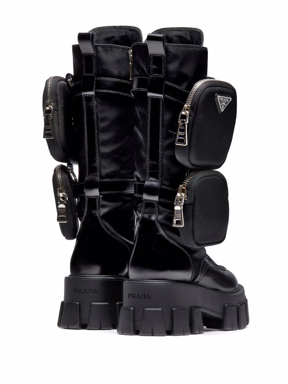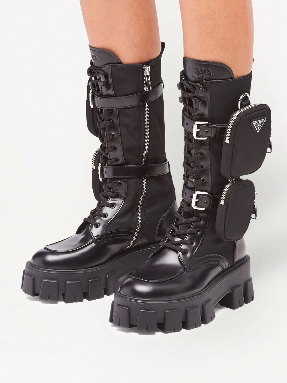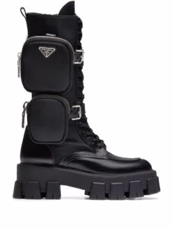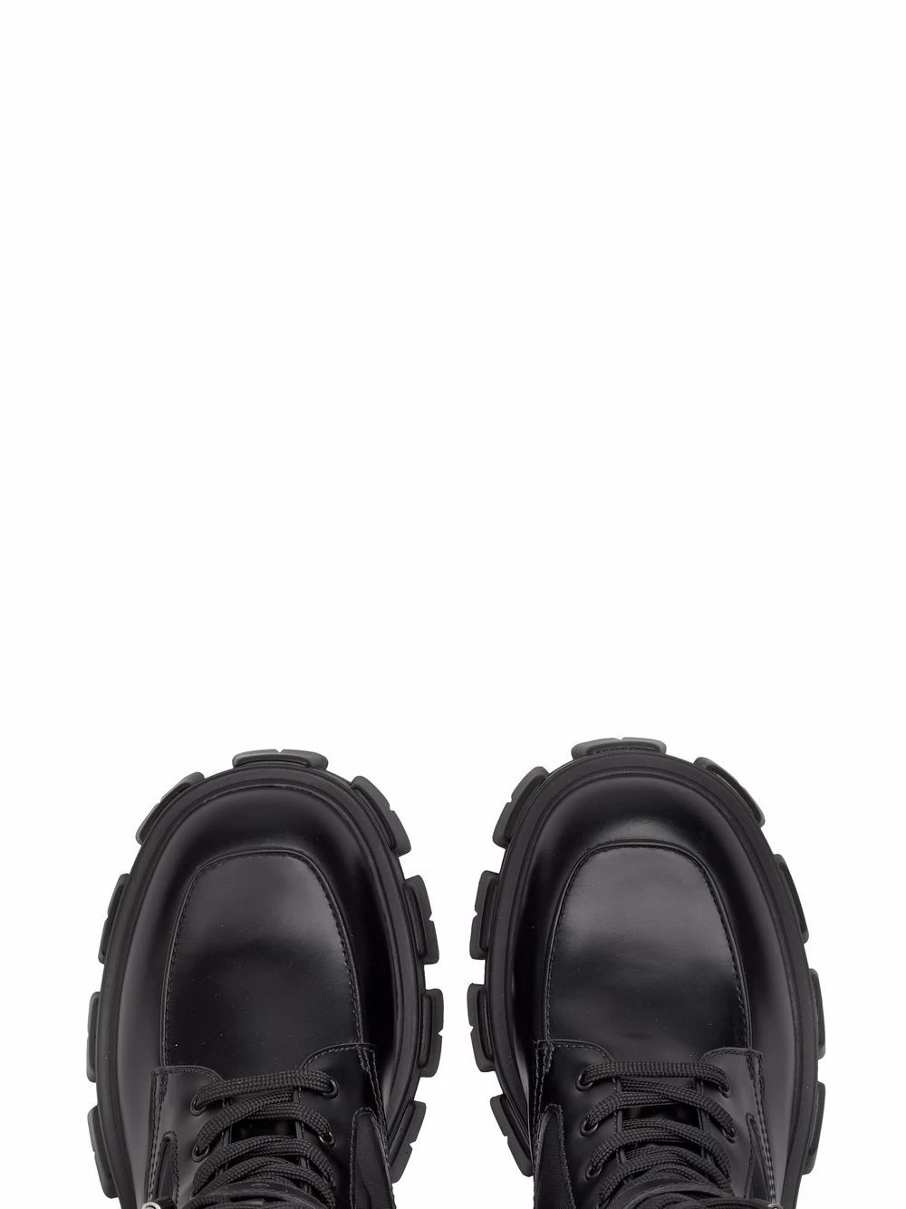Semelle crantée en caoutchouc, petit talon épais, fermeture à lacer sur le devant, pochette détachable, languette d’enfilage au talon, finitions en métal argenté, logo triangulaire en émail. Couleur : noir. Matière : cuir.