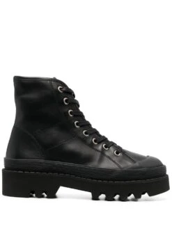 Noir, cuir, fermeture à lacer sur le devant, semelle intérieure à logo, semelle crantée en caoutchouc.